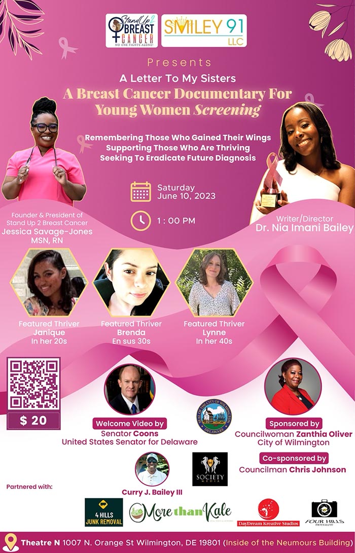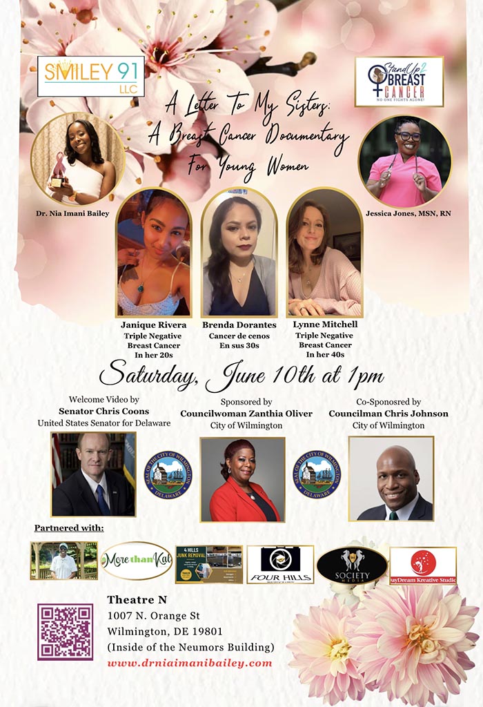 My name is Dr. Nia Imani Bailey, DPA, M.A.Ed., RT(T), and I am the founder of Smiley 91 LLC. We have a wonderful and timely documentary entitled, A Letter To My Sisters: A Breast Cancer Documentary For Young Women.