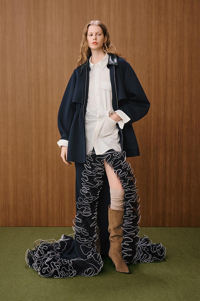 Romantic silhouettes—puff sleeves, delicate ties, and fluid draping—are balanced by constructive blazers and architectural pleating, creating a wardrobe that feels both expressive and disciplined. Tulle and chiffon are paired with luxurious cashmere knitwear, offering a tactile dialogue between lightness and warmth, intimacy and polish.