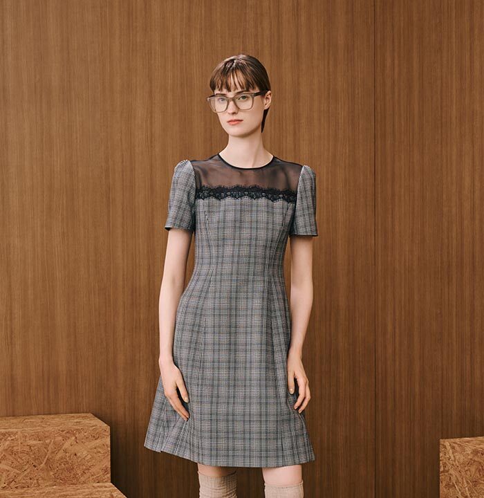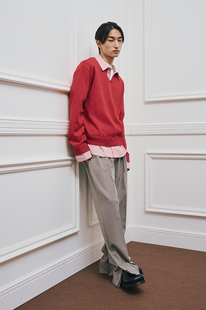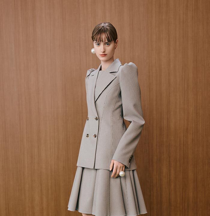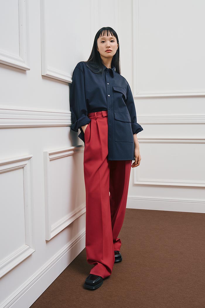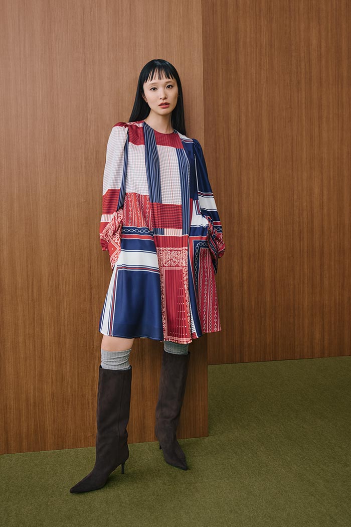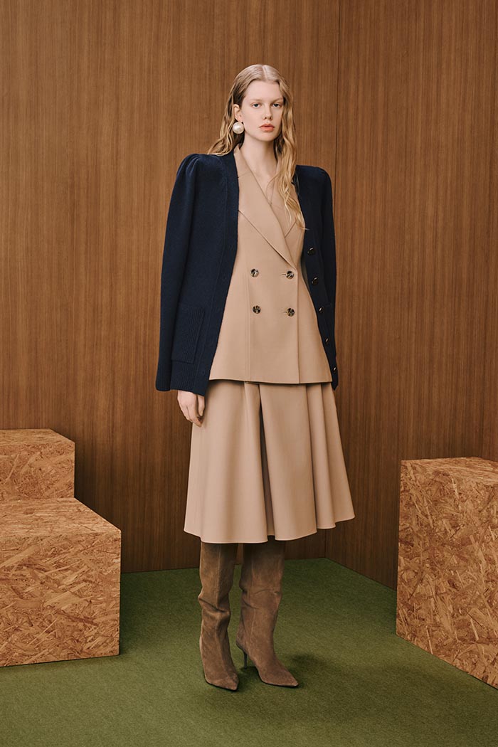 Details such as pearls, gold buttons, and scarf-inspired prints lend a sense of heritage refinement, while a neutral color palette is energized by bold accents of red and electric blue. The result is a collection that celebrates contrast with quiet confidence—romantic yet composed, nostalgic yet unmistakably modern.