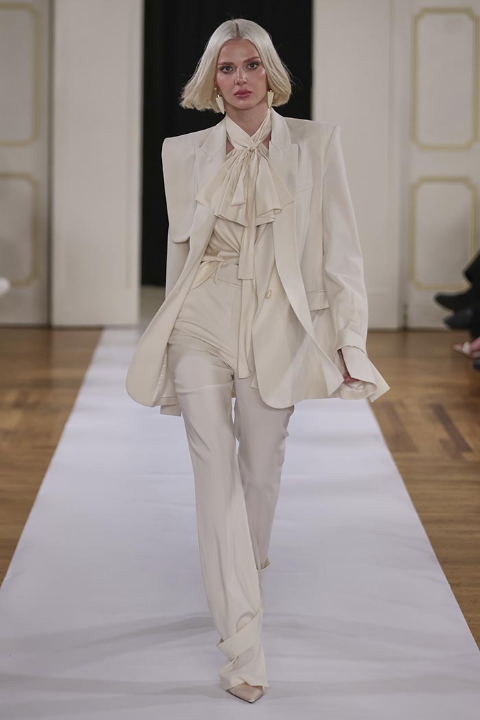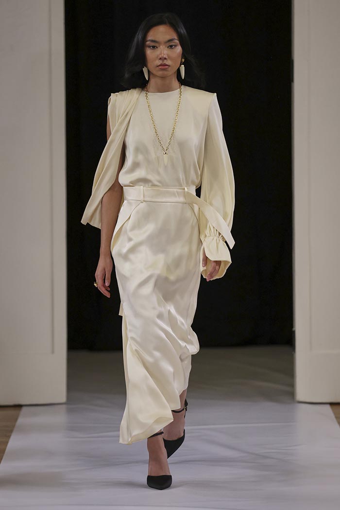 The lineup featured 19 looks characterized by asymmetric designs, elongated silhouettes, sensual draping, unexpected details and color blocking. The color palette started with warm neutral tones followed by striking use of lime yellow, baby blue, powdery lilac, deep purple and caramel brown. Finest natural Italian made silks, wools and cottons were used throughout the collection.