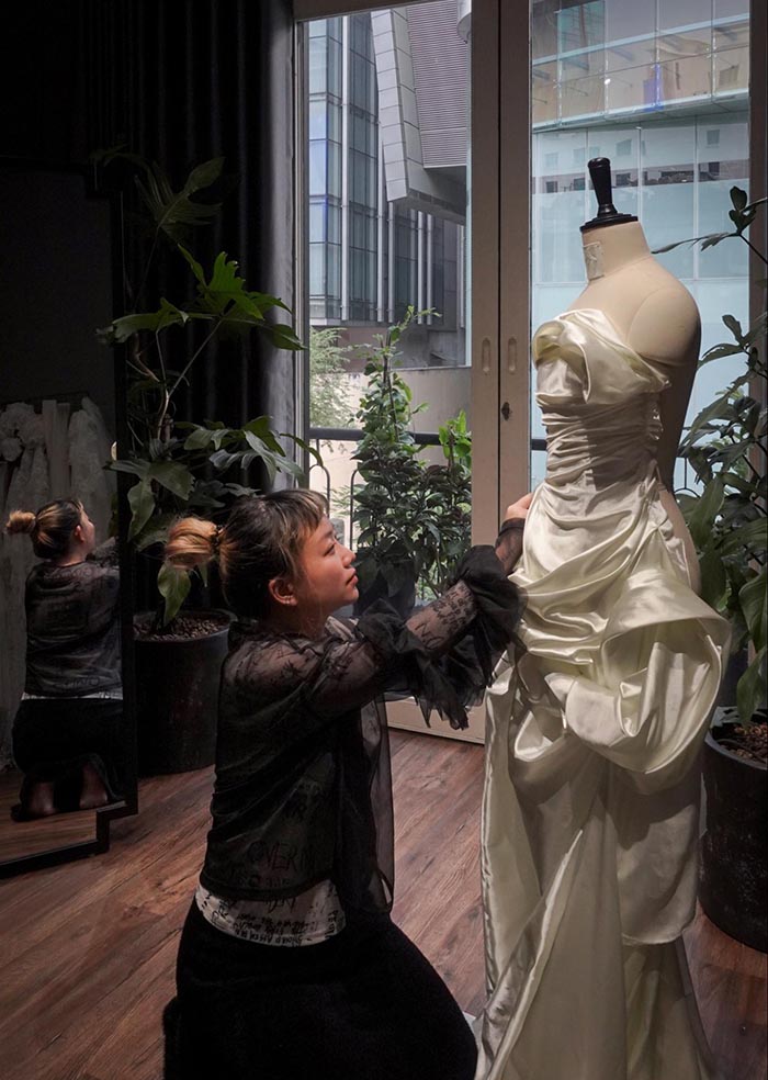 The SS26 collection, A World Within, reimagines bridal couture with bold colors, layered fabrics, and intricate patchwork — celebrating individuality, resilience, and the beauty of two worlds coming together. Each gown reflects Nguyen’s vision of love as both deeply personal and universally uniting.