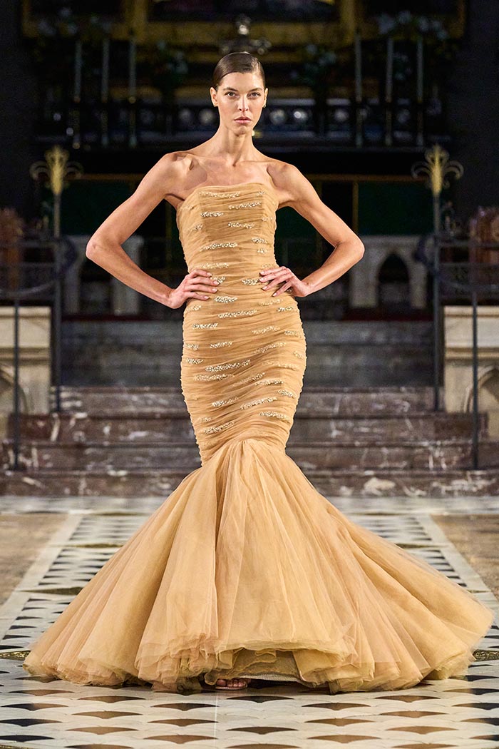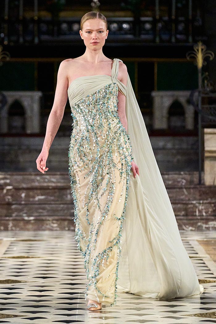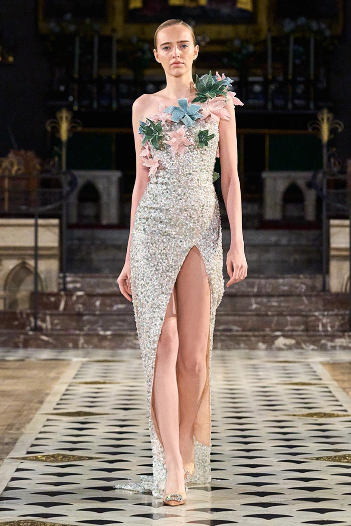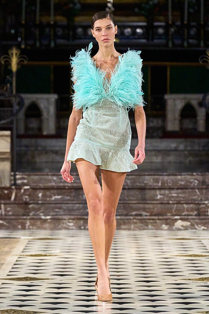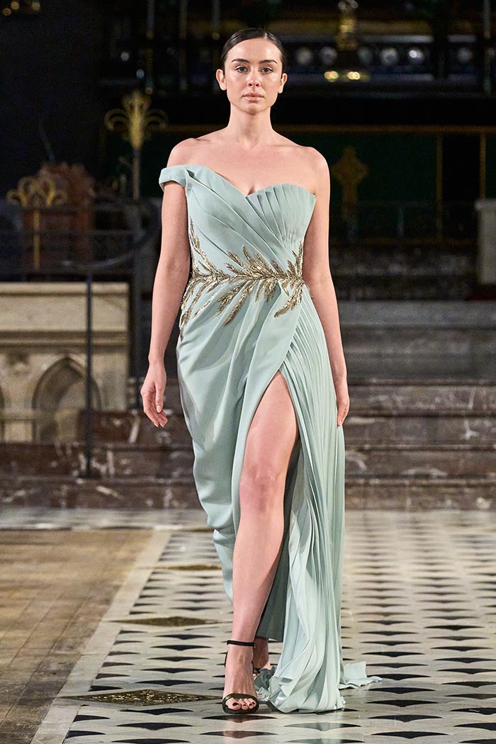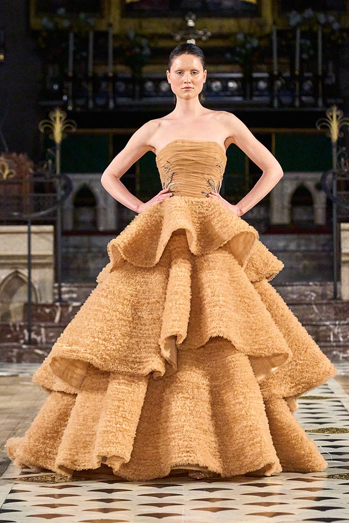 My inspirations came from the state within the country I live in Australia. The state of Victoria has many different natural surroundings from the beach side to to the rich Dark and wet forests. This collection I really wanted to soften the look of my pallet. The richness of colours and textures are very moody and light, playing with architectural Silhouettes, soft silks, incorporated with the richness of the Signature delicate beading which the brand is synonymously known for.
