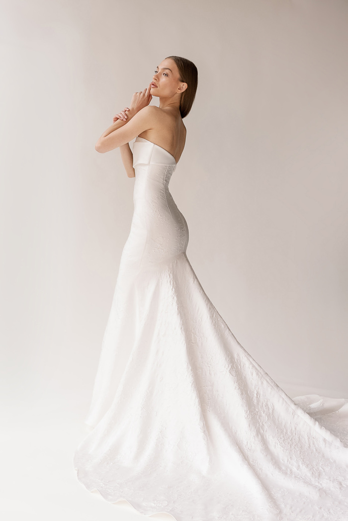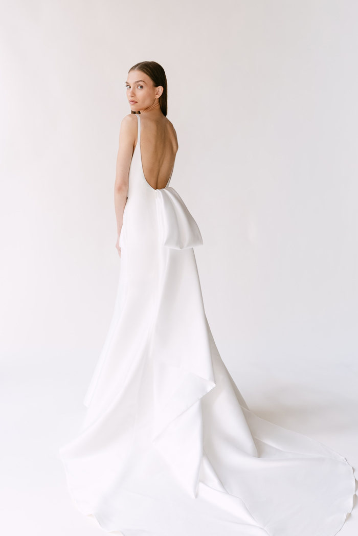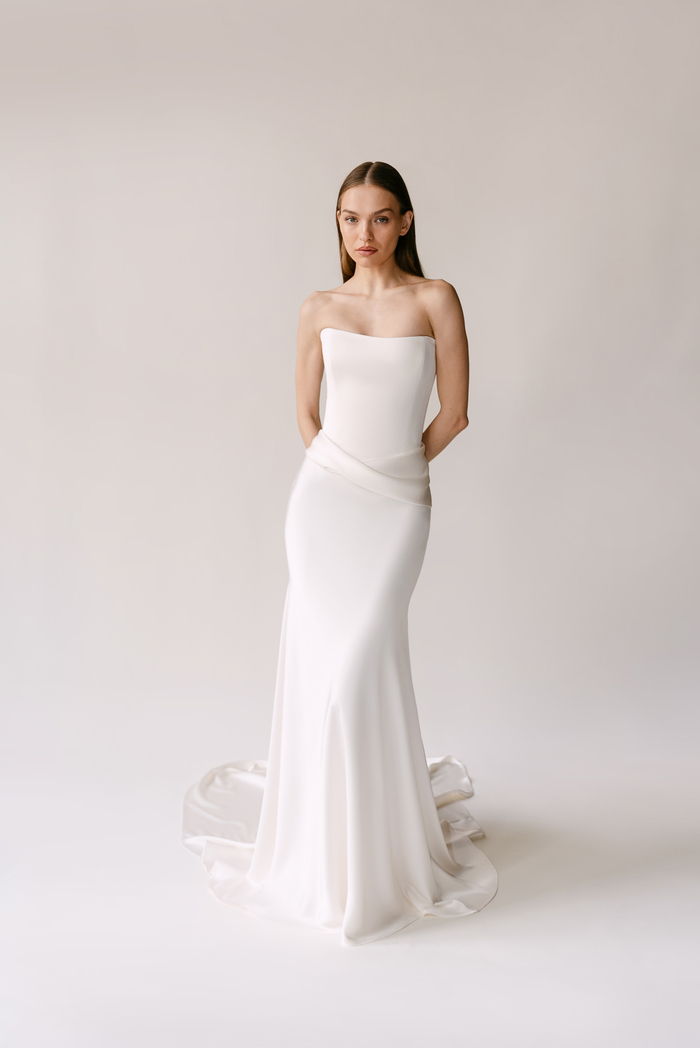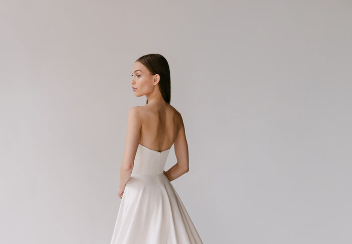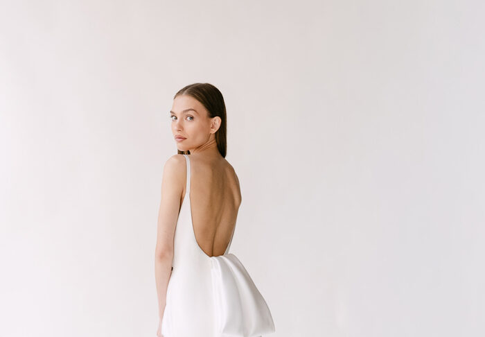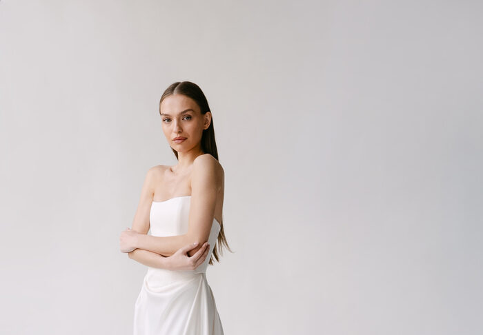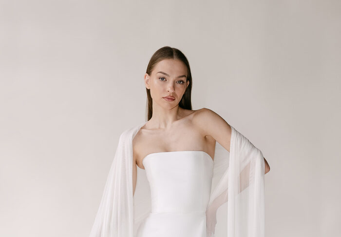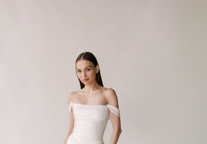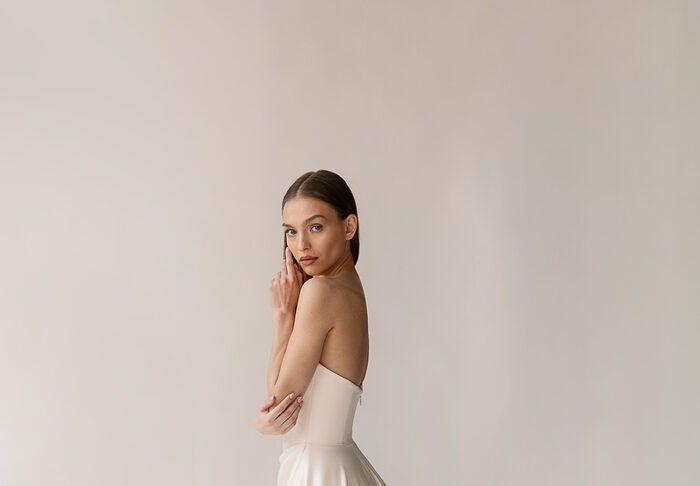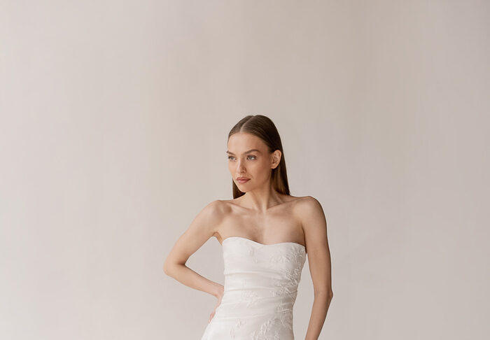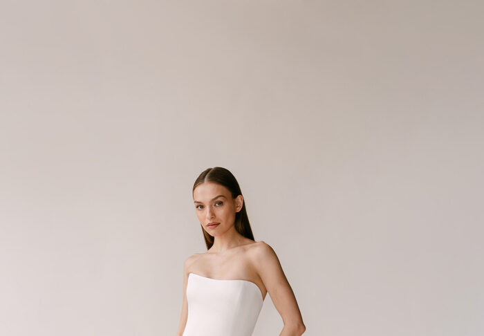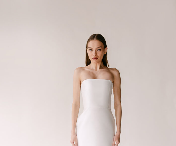 The Alyssa Kristin 2027 collection reflects a broader return to vintage influence in bridal today, reinterpreted through the brand’s signature minimalism and precision. Timeless silhouettes evoke a sense of the past, reinterpreted through a distinctly modern lens – where traditional details are stripped back, refined, and executed with precision. From sculptural construction to fluid bias draping in luminous fabrics, each gown feels intentional, elevated, and entirely current.