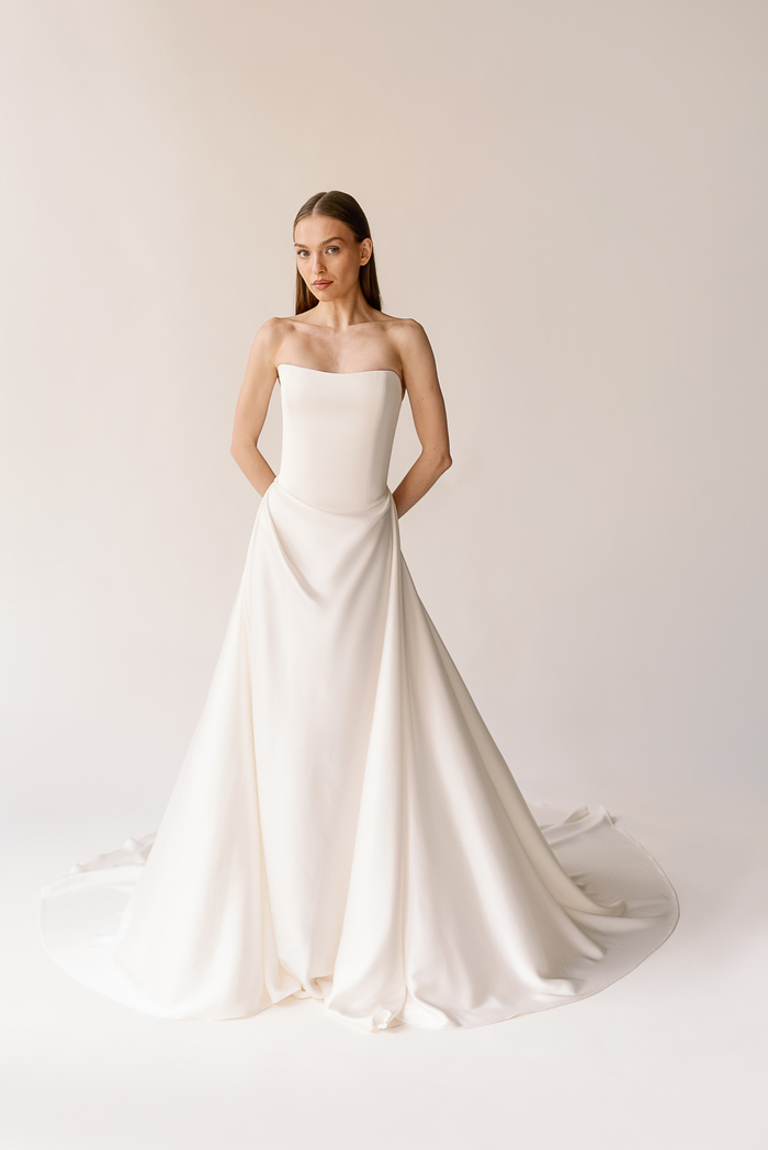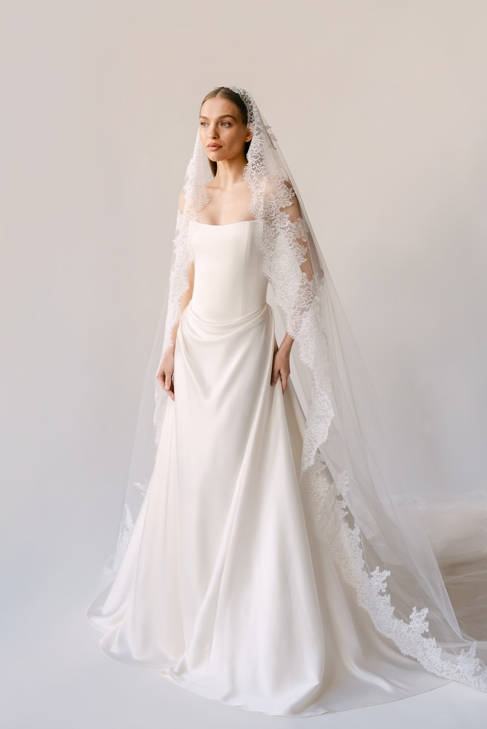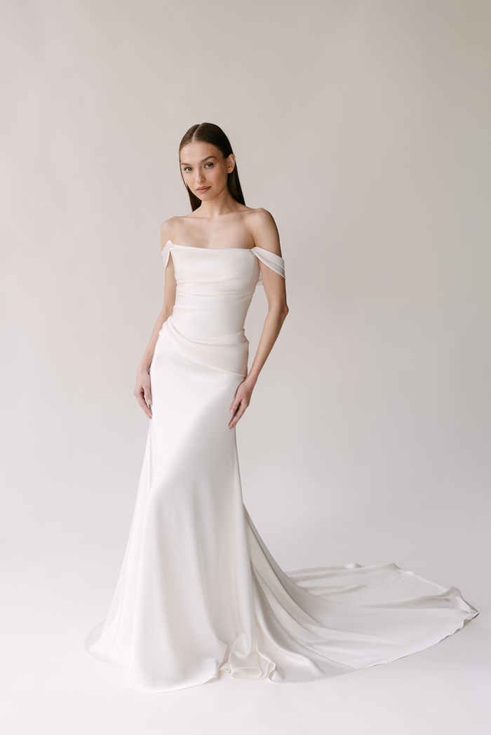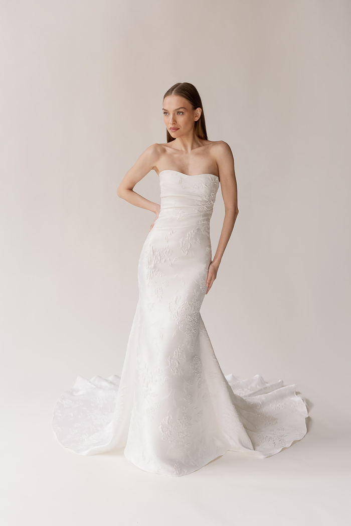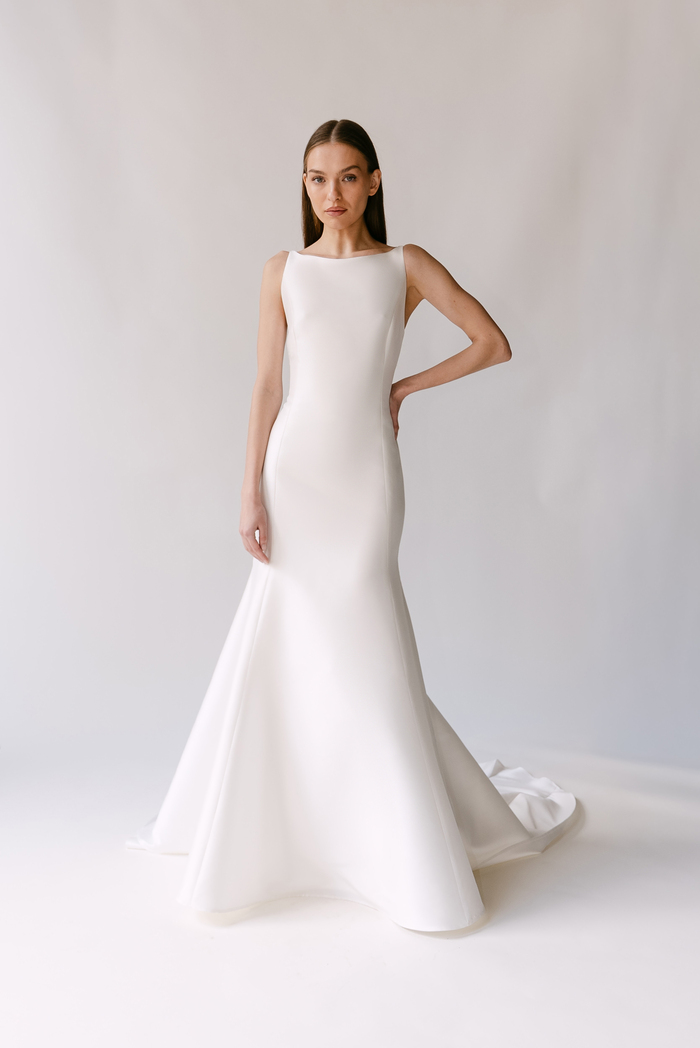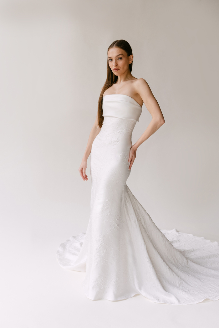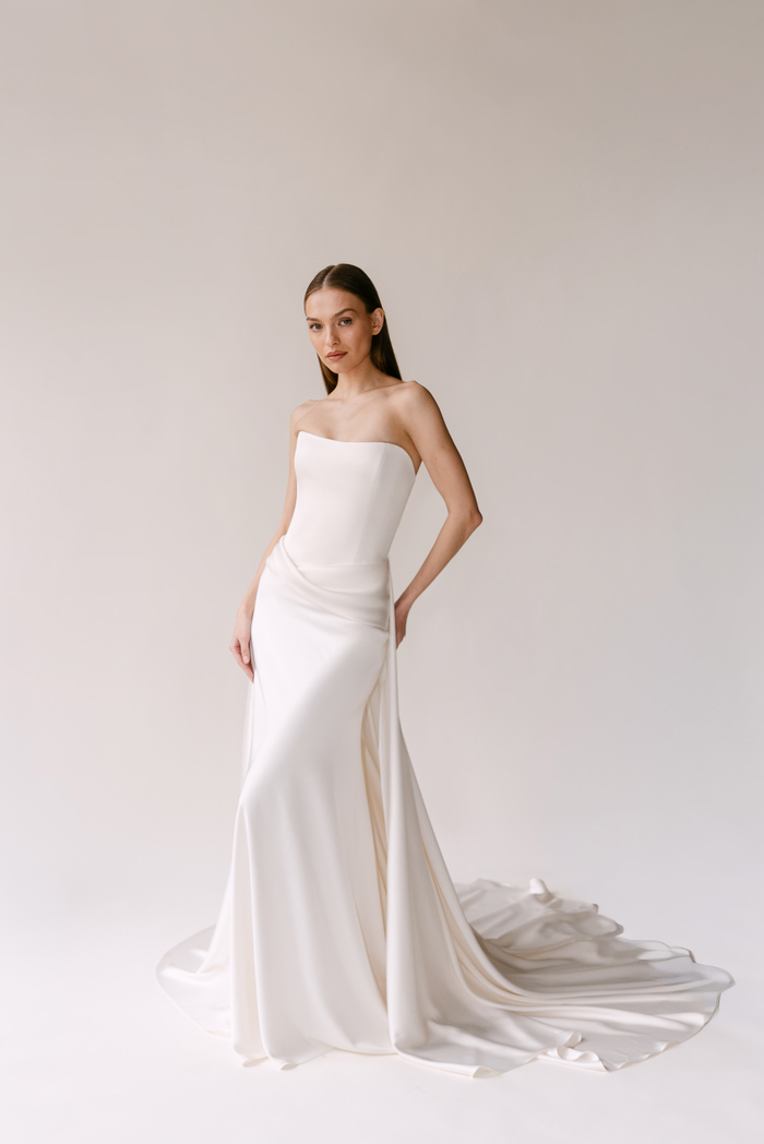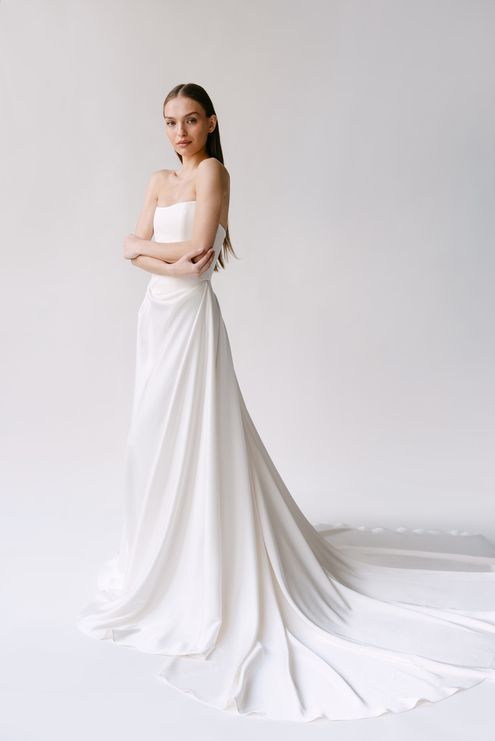 The Alyssa Kristin 2027 collection reflects a broader return to vintage influence in bridal today, reinterpreted through the brand’s signature minimalism and precision. Timeless silhouettes evoke a sense of the past, reinterpreted through a distinctly modern lens – where traditional details are stripped back, refined, and executed with precision. From sculptural construction to fluid bias draping in luminous fabrics, each gown feels intentional, elevated, and entirely current.