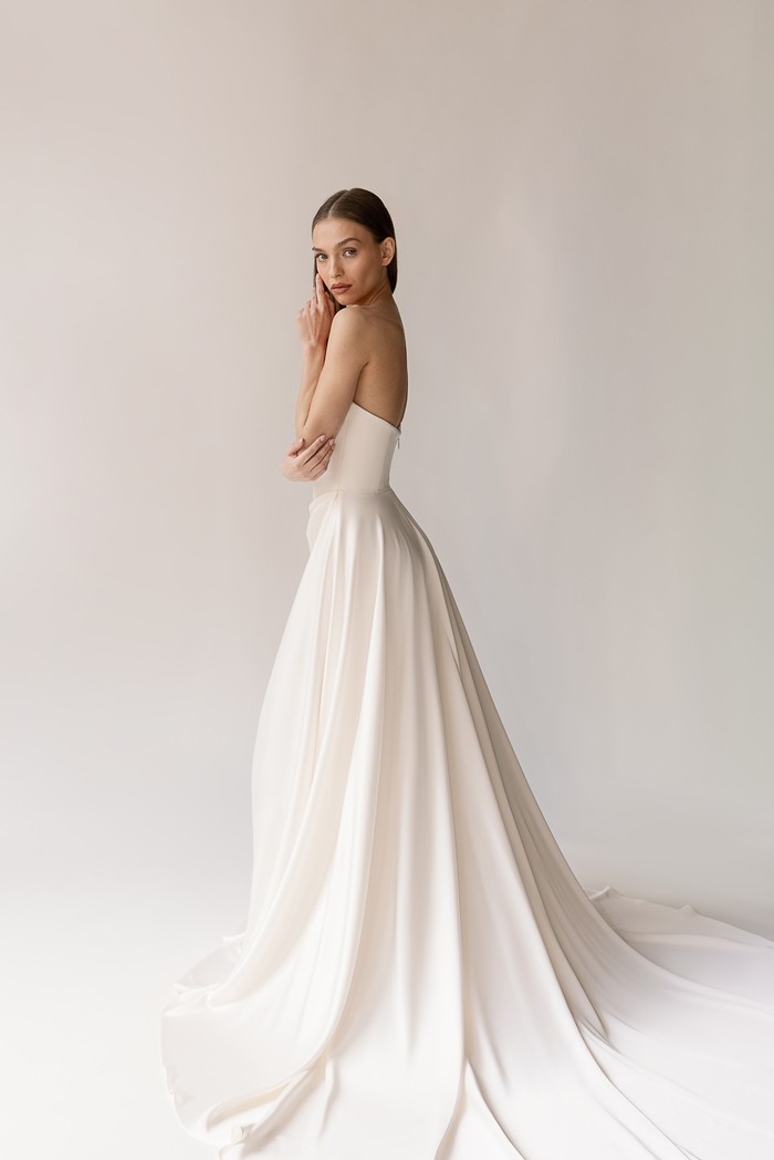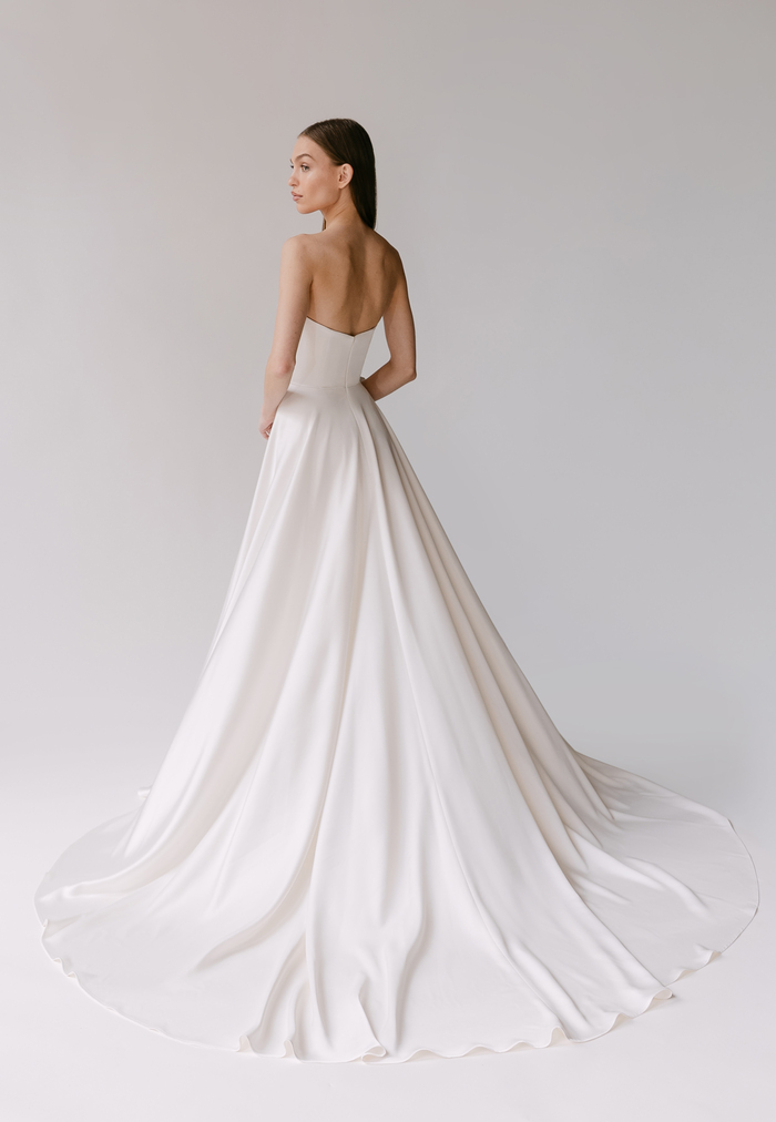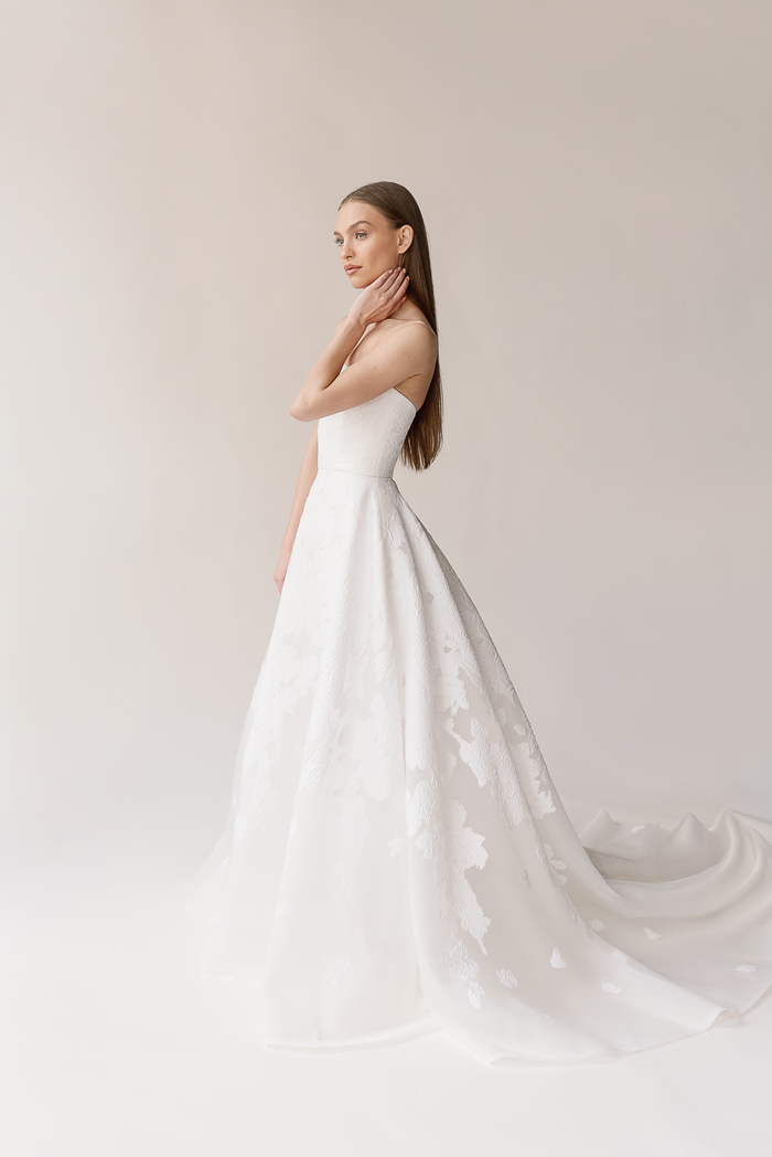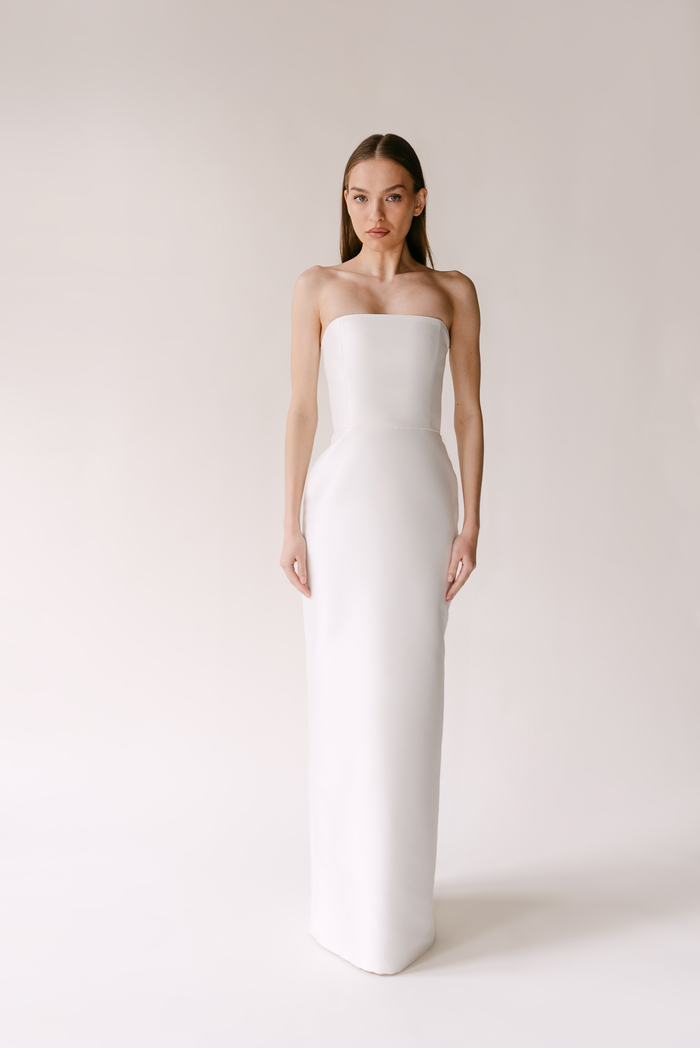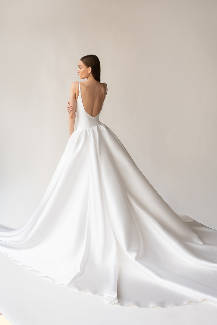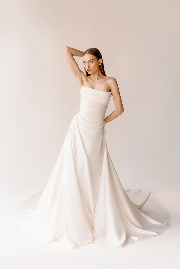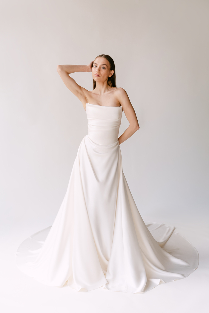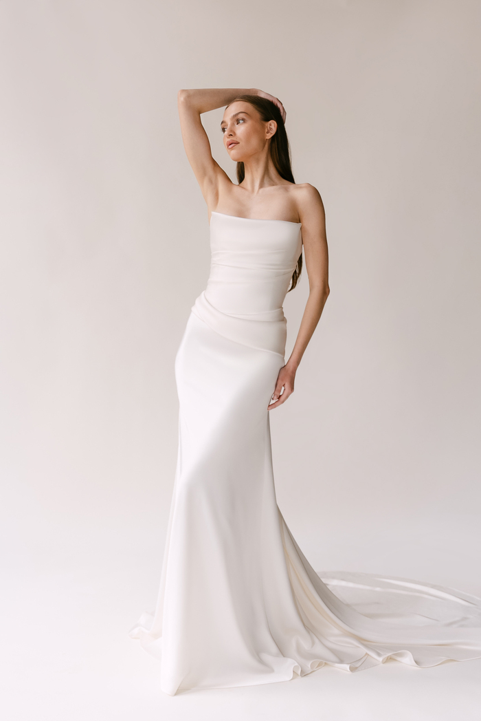 The Alyssa Kristin 2027 collection reflects a broader return to vintage influence in bridal today, reinterpreted through the brand’s signature minimalism and precision. Timeless silhouettes evoke a sense of the past, reinterpreted through a distinctly modern lens – where traditional details are stripped back, refined, and executed with precision. From sculptural construction to fluid bias draping in luminous fabrics, each gown feels intentional, elevated, and entirely current.