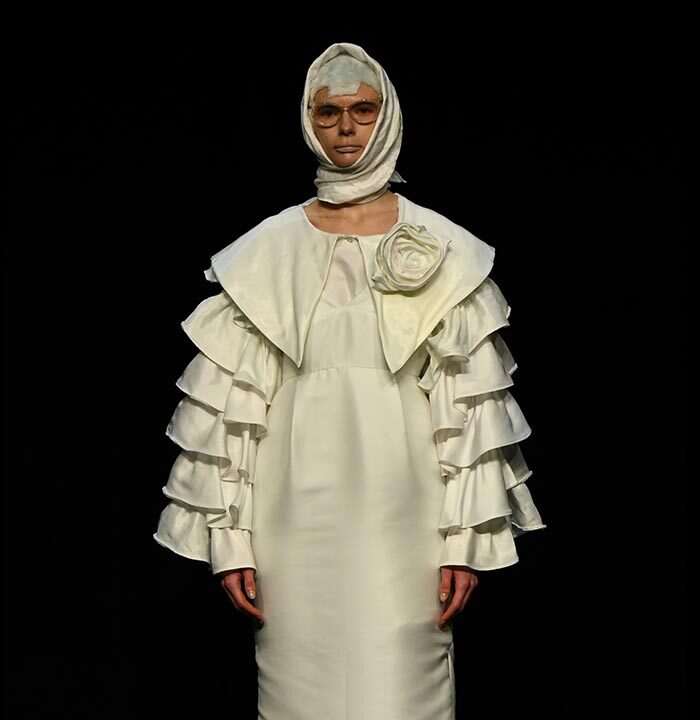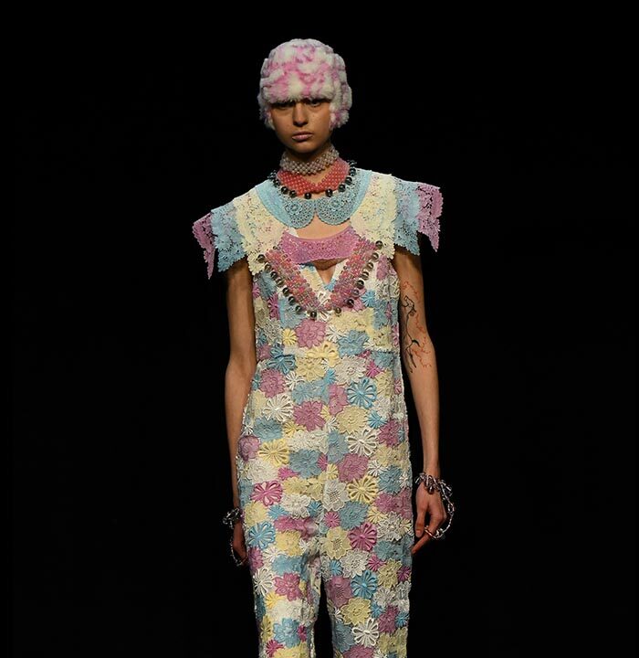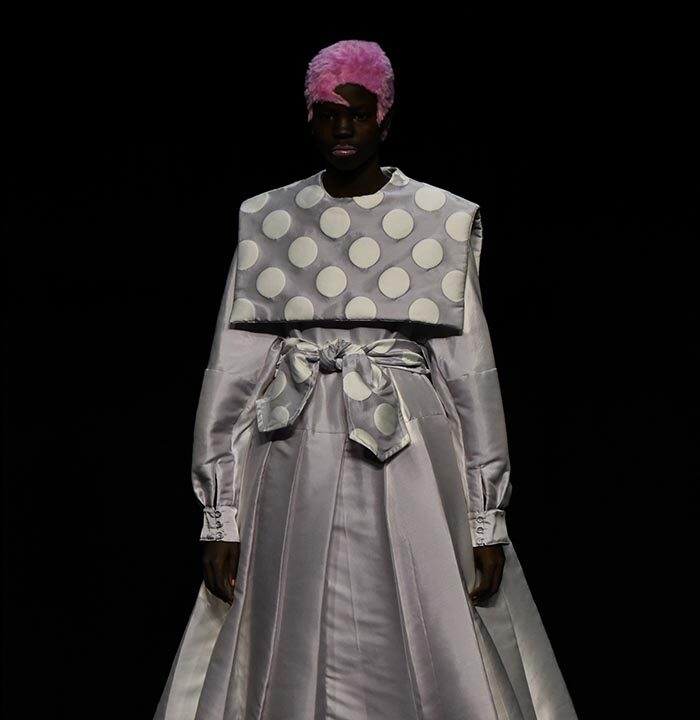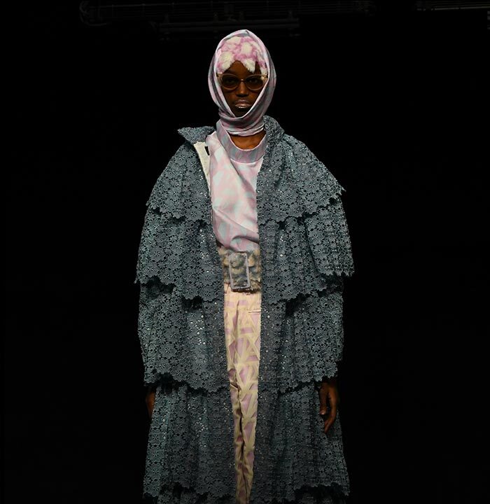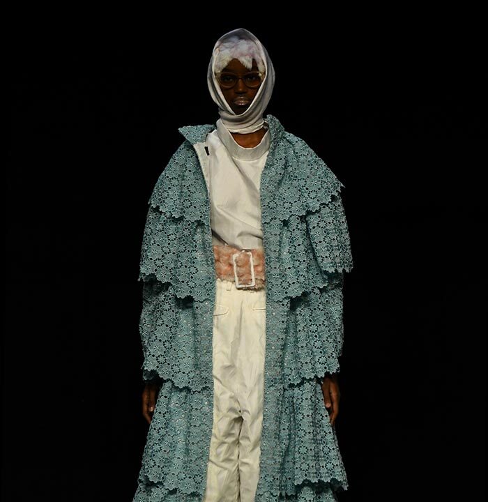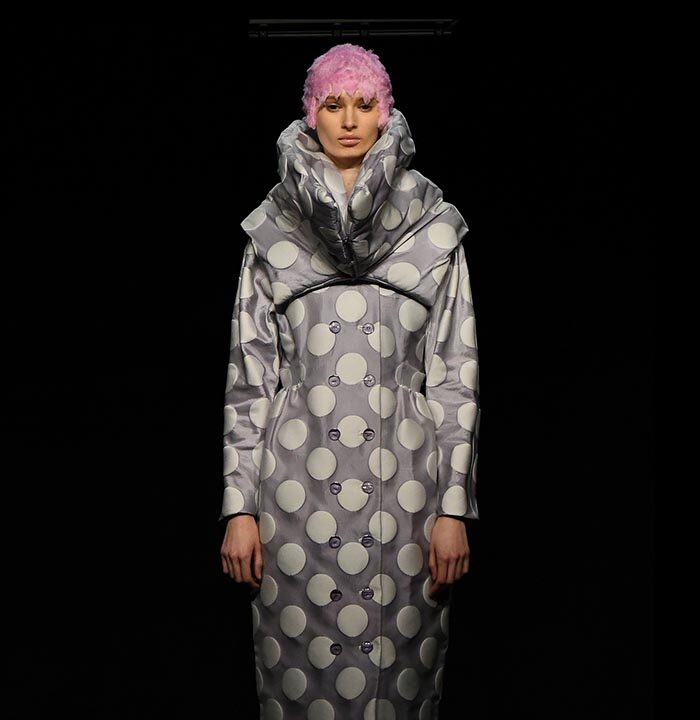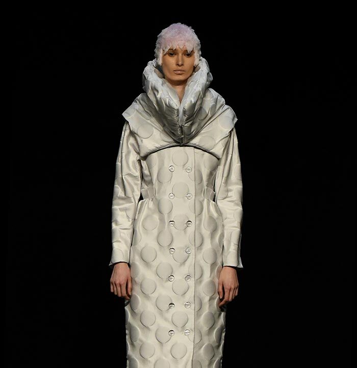 A scientist of fashion, Kunihiko Morinaga presents his own wearable take on Umwelt (German for ‘environment’ or ‘surround-world’), a 19th-century concept developed by the German philosopher and biologist Jakob Johann Baron von Uexküll that explores how living beings perceive their environment.