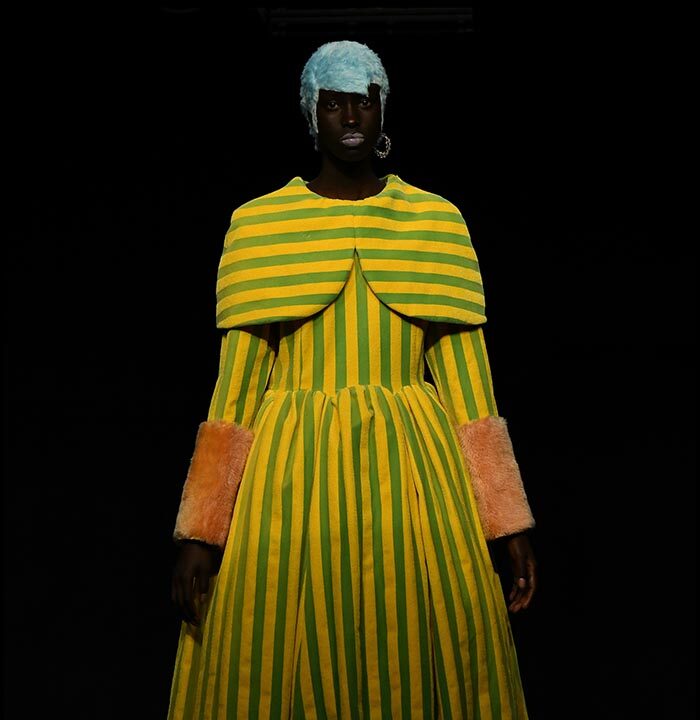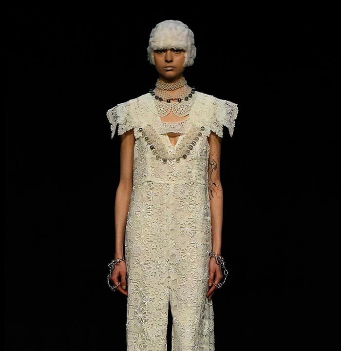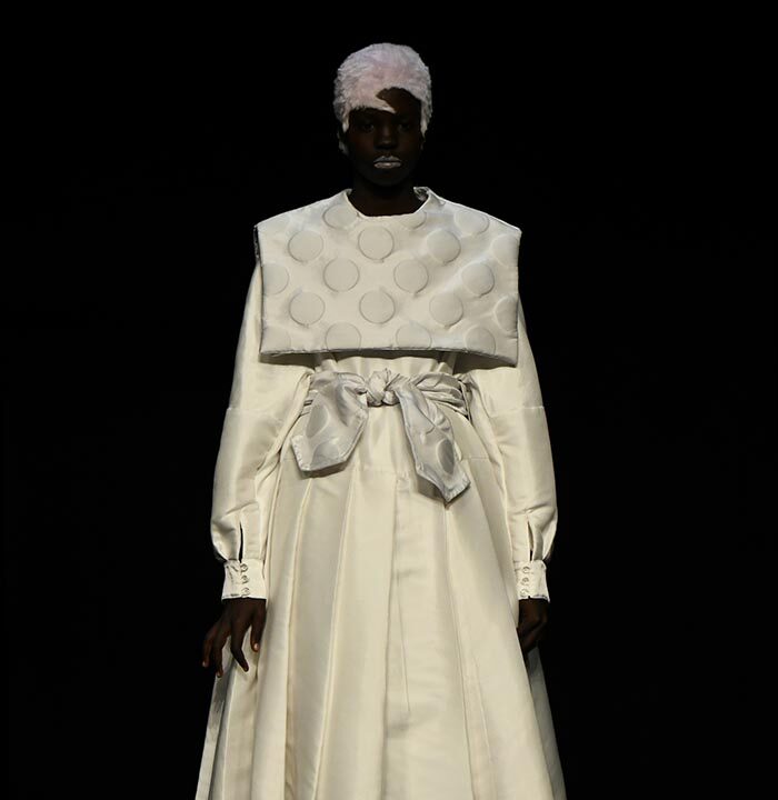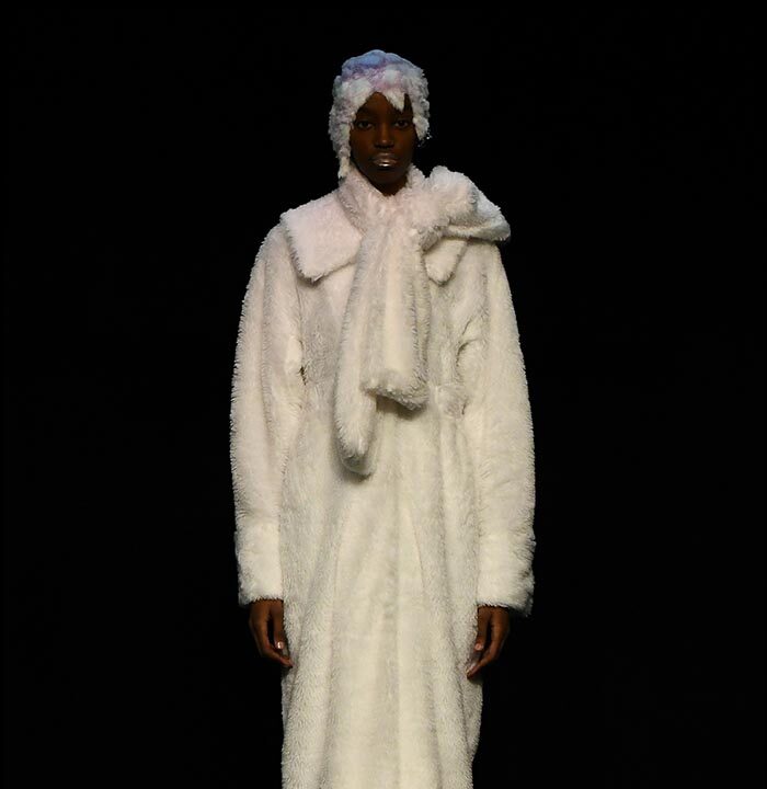 Pristine white looks, such as a satin dress with a giant crochet collar and pleated skirt, a lace jumpsuit, or a sculpted faux-fur high-neck dress, as well as velvet cocoon coats and dresses with petal collars, shift into another tonal range, thanks to pho-tosensitive colors that are designed to evolve through the days and seasons, coexisting with nature and the environment.