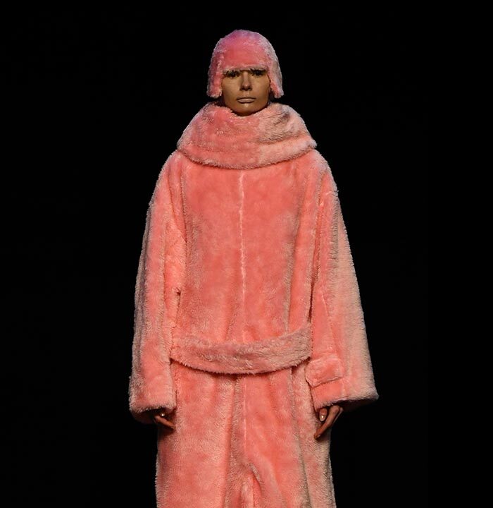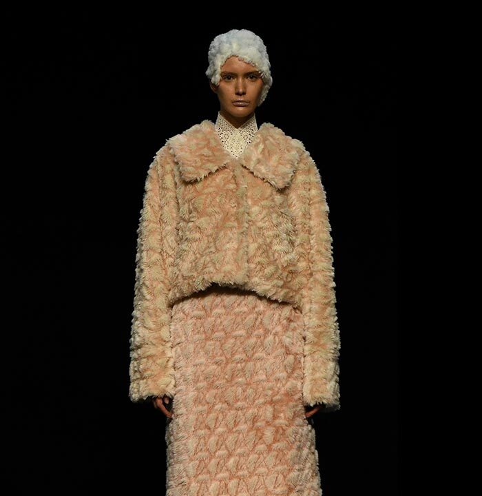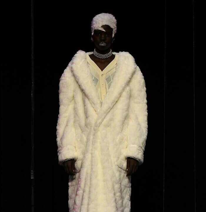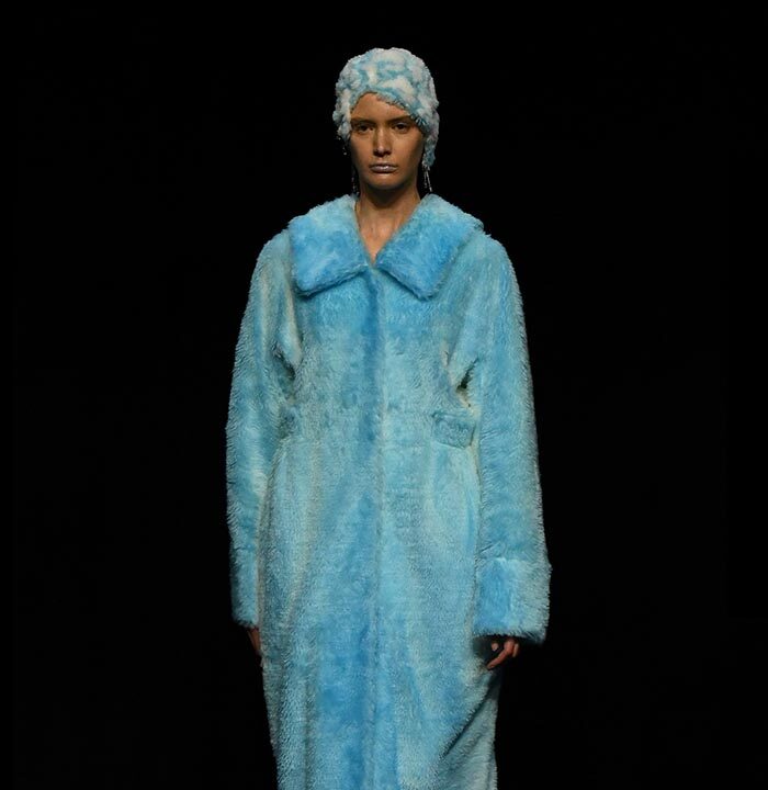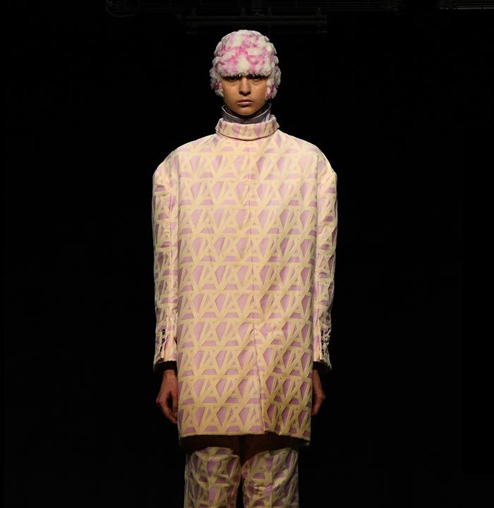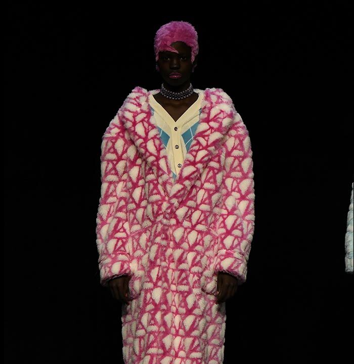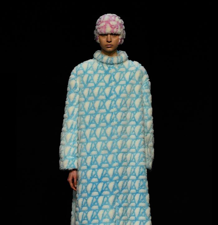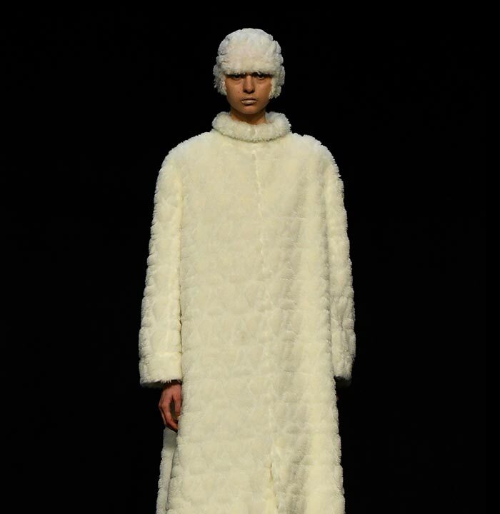 With a collection blending classic ‘50s-inspired shapes and futuristic materials that change color when exposed to natural sunlight (UV rays), Anrealage expands its portfolio of exper-imental photochromic materials produced in-house, adding faux fur, velvet, lace, knit, jacquard and satin. New color developments for looks include a yellow, beige, red, and light