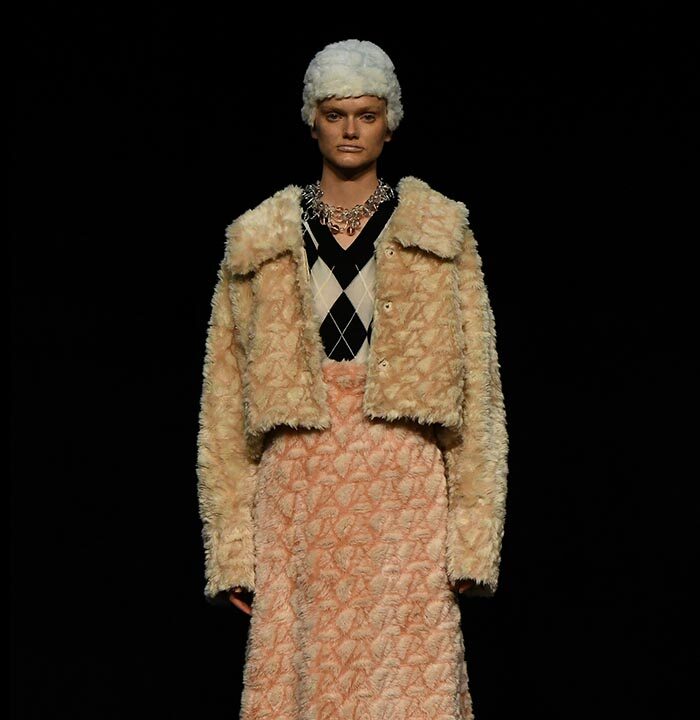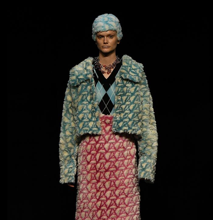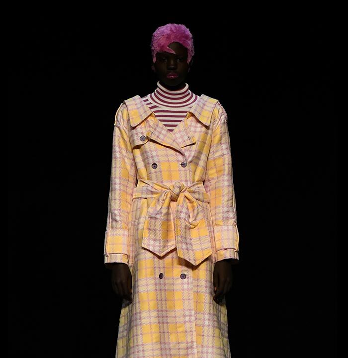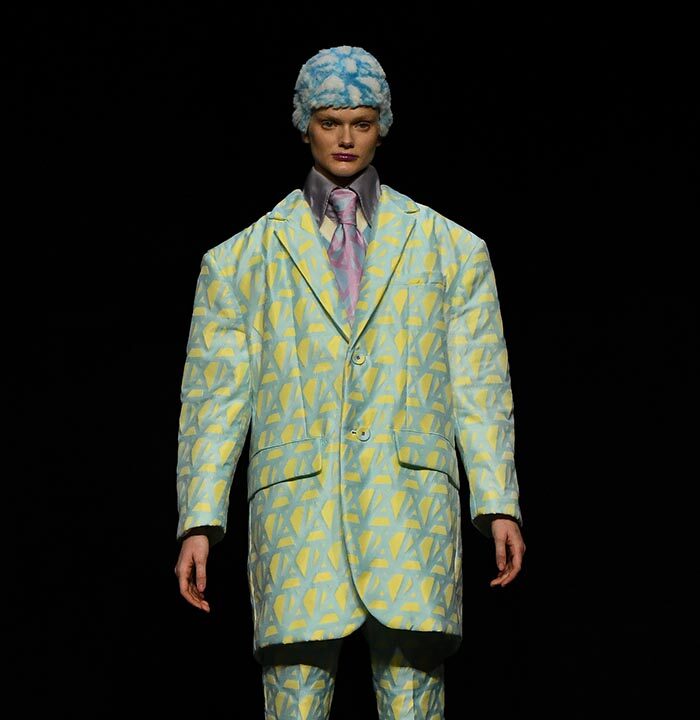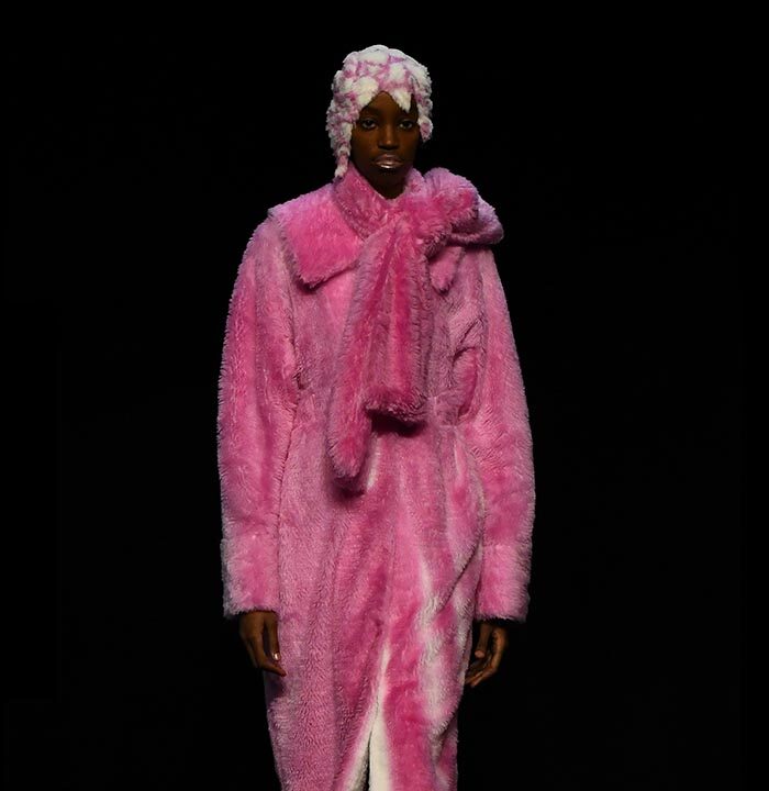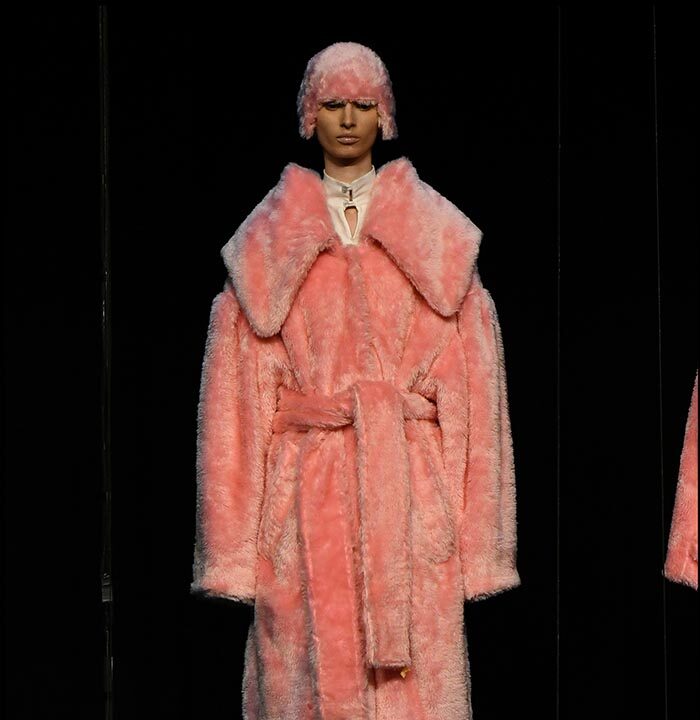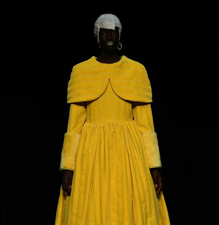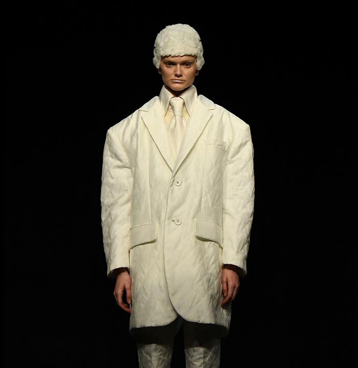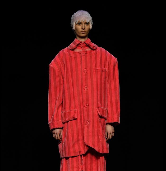 With a collection blending classic ‘50s-inspired shapes and futuristic materials that change color when exposed to natural sunlight (UV rays), Anrealage expands its portfolio of exper-imental photochromic materials produced in-house, adding faux fur, velvet, lace, knit, jacquard and satin. New color developments for looks include a yellow, beige, red, and light