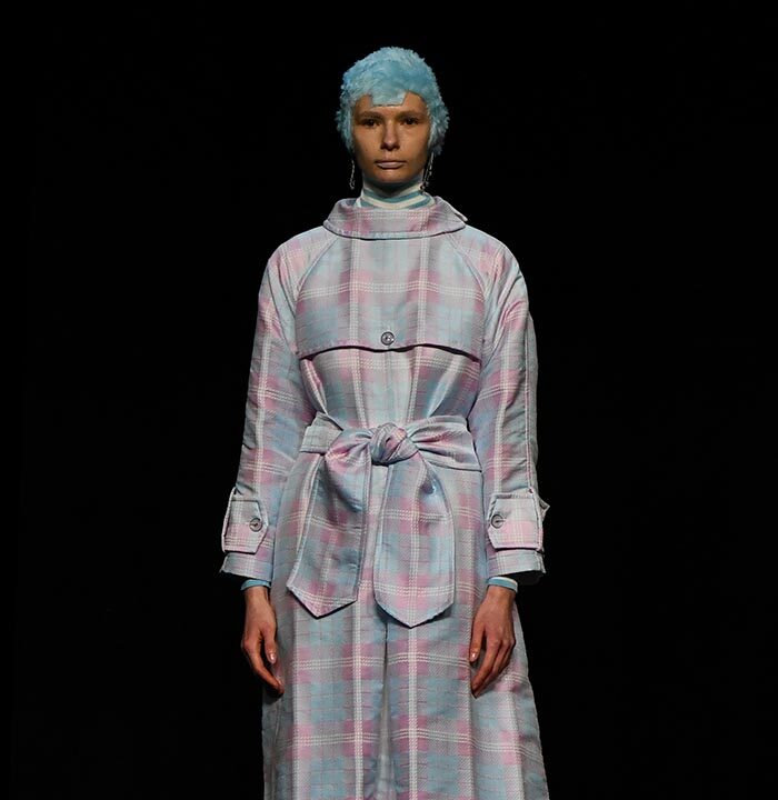 To the deceptively simple melody and rhythm of Ravel’s Boléro, “front/front” and “back/back” versions of outfits appear side by side, slowly changing into contrasting (or unequal) colors ̶ one turning pink, the other blue ̶ as ultra-violet light scans their surface. Looks slowly evolve through a variety of forms and colors evoking Earth’s wondrous bio-logical diversity, while the light also awakens textural fabrics woven with graphic patterns like stripes, checks, polka dots, delicate floral embroidery or the Anrealage logo.