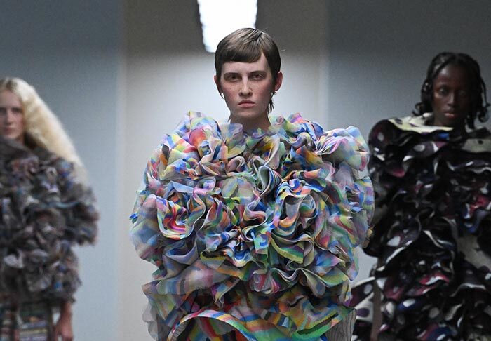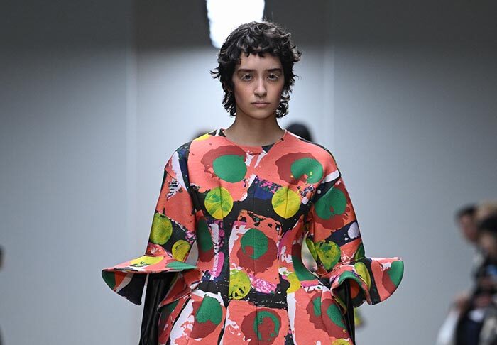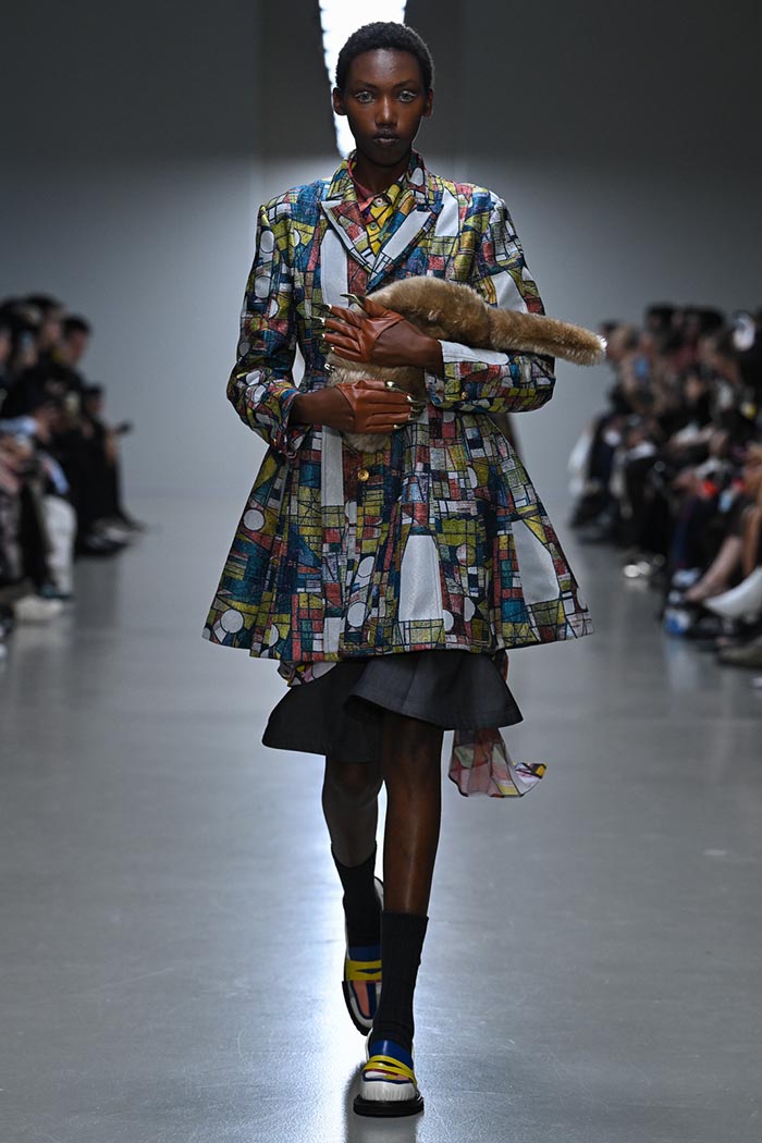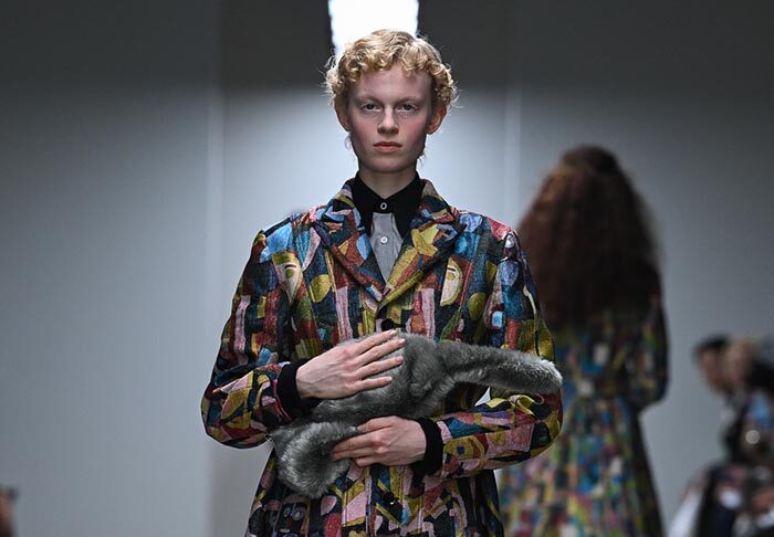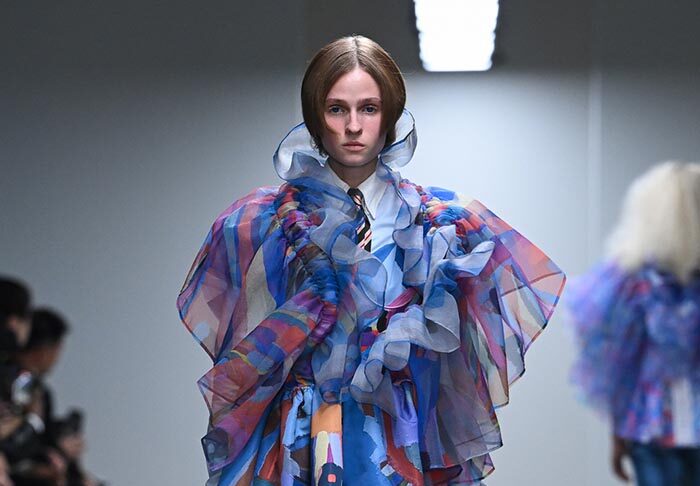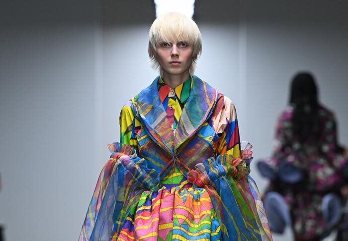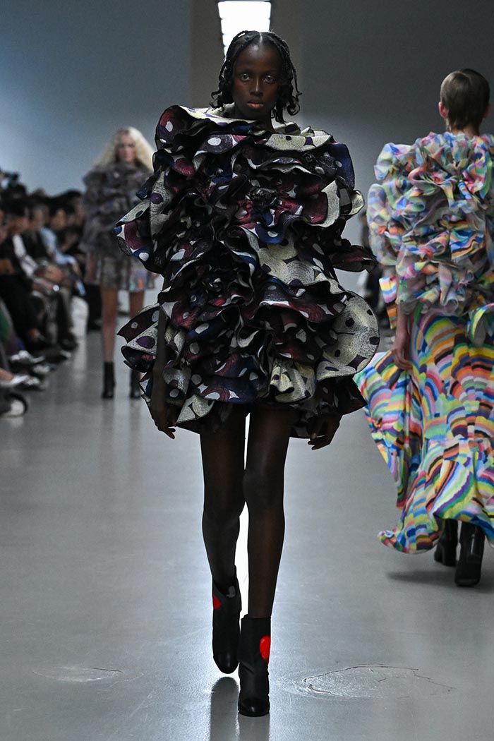Clothes burst with emotion as their motifs and shapes stir into life, an extraordinary, whimsical eruption of wired flounces that recall baroque and psychedelic primitive organisms. A dress swells like a heart, while hems of voluminous skirts, jackets and capes undulate as if alive, each a distinct entity. Accessories extend the vision: feline-shaped handbags with metronomic tails, developed with robotics startup Yukai Engineering Inc., inspired by the robotics product Qoobo, recall the soothing embrace of a purring cat.