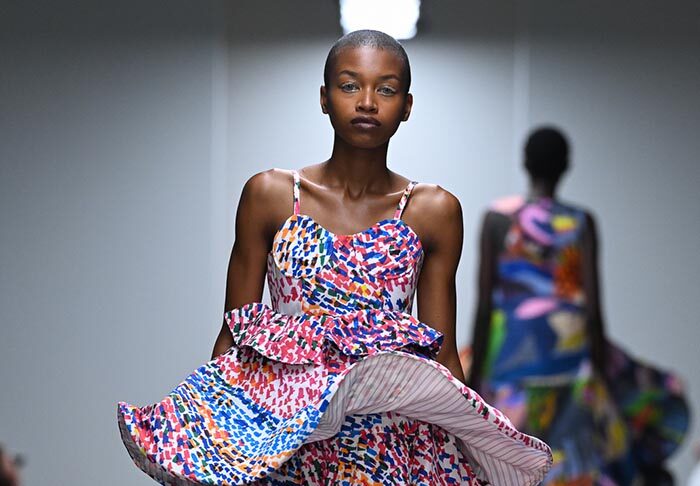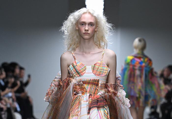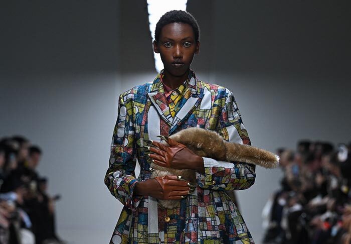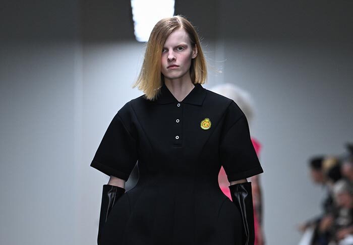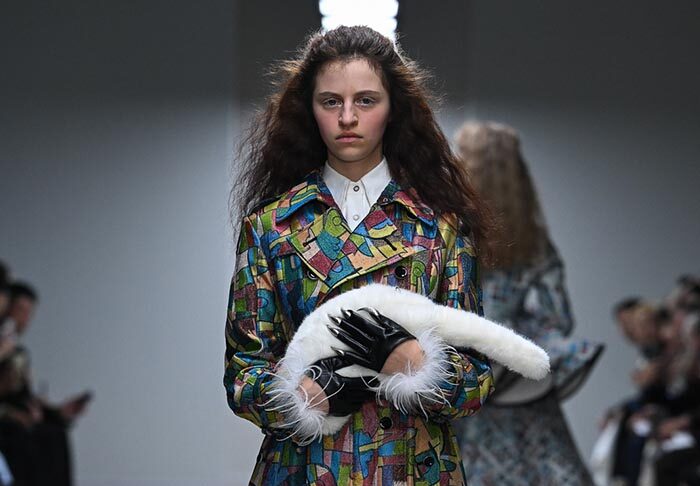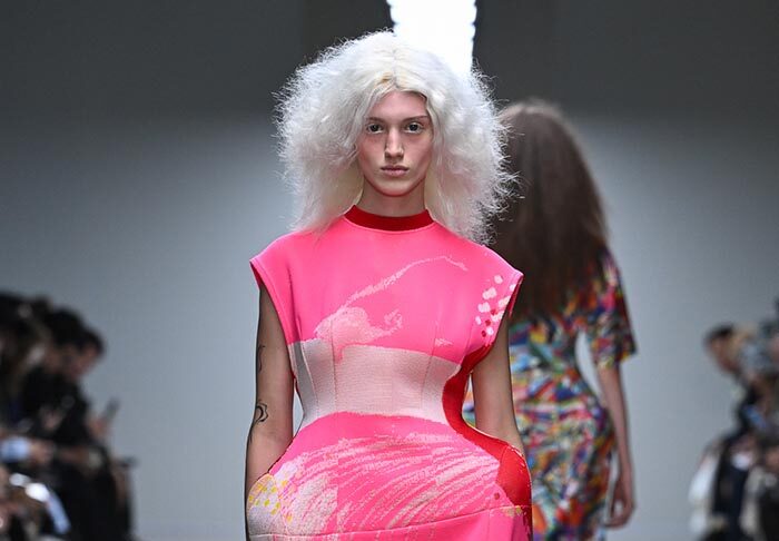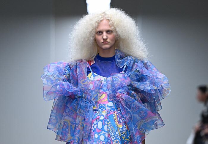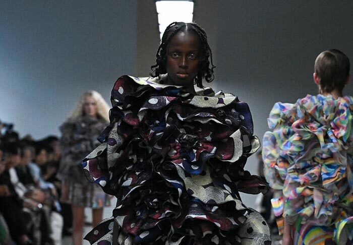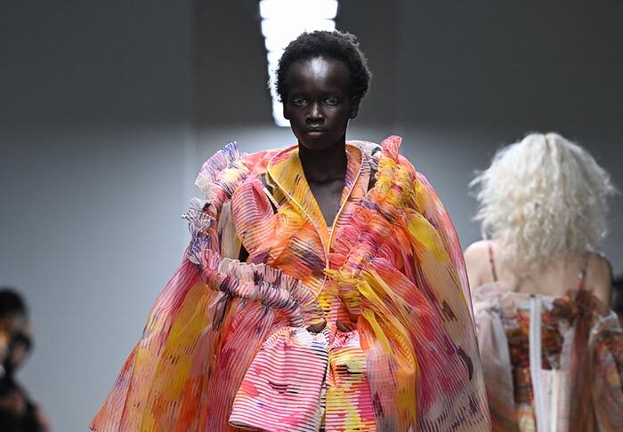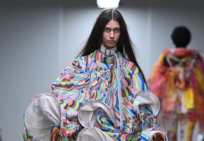 Clothes burst with emotion as their motifs and shapes stir into life, an extraordinary, whimsical eruption of wired flounces that recall baroque and psychedelic primitive organisms. A dress swells like a heart, while hems of voluminous skirts, jackets and capes undulate as if alive, each a distinct entity. Accessories extend the vision: feline-shaped handbags with metronomic tails, developed with robotics startup Yukai Engineering Inc., inspired by the robotics product Qoobo, recall the soothing embrace of a purring cat.
