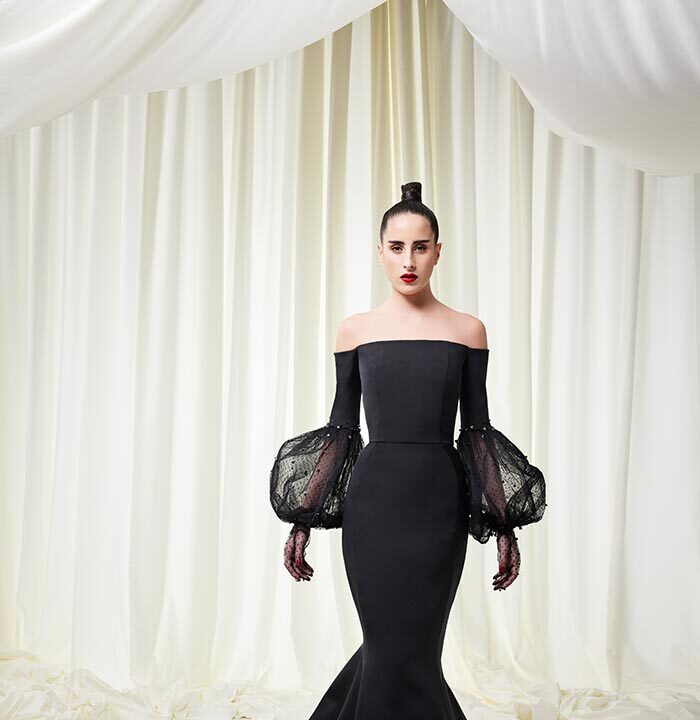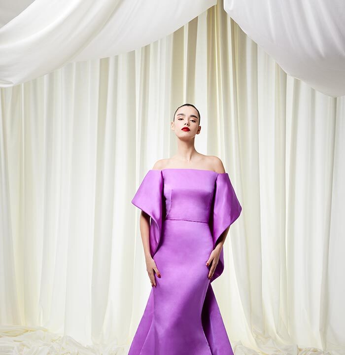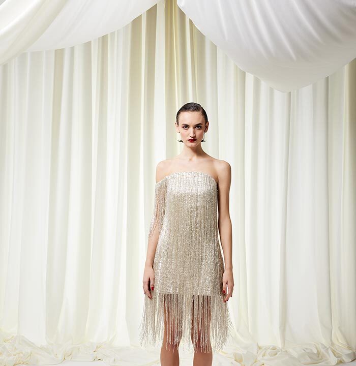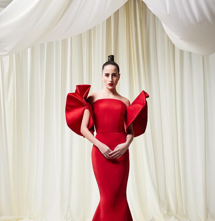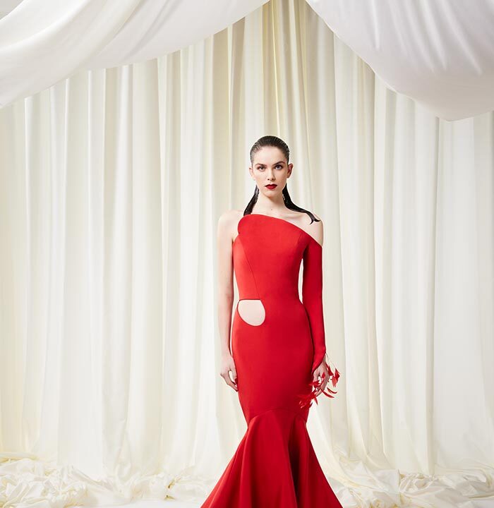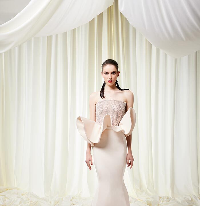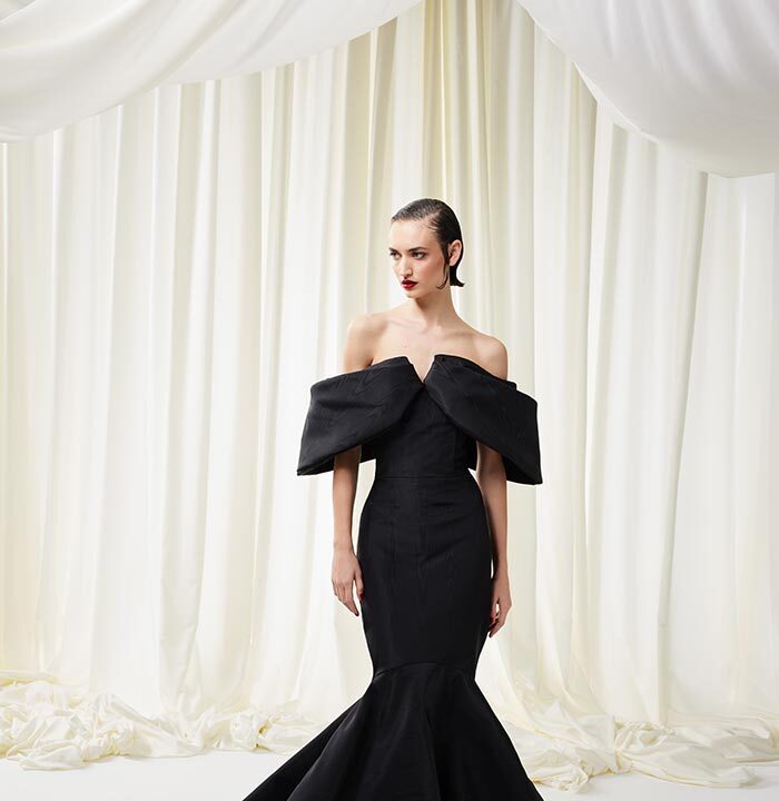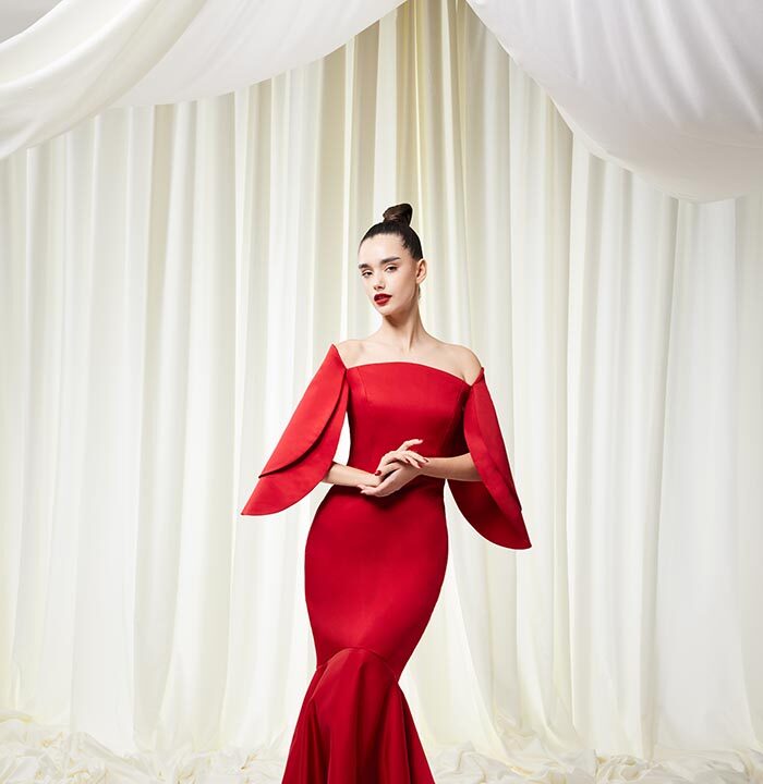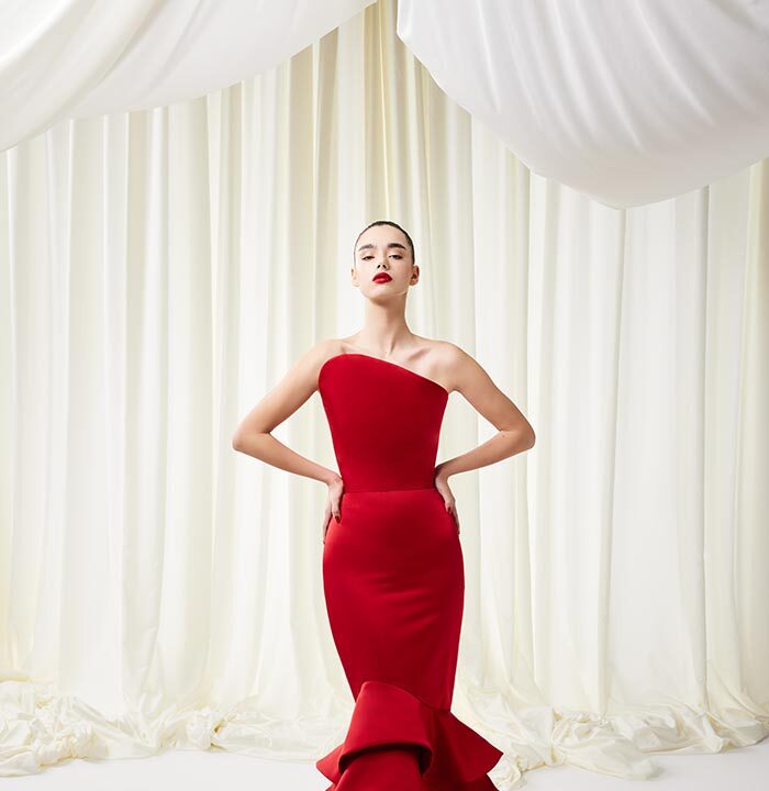 The first ones, to be used as day and cocktail dresses, are characterized by high waist and structured with wide shoulders whose silhouette resembles a bolero. While the mini dresses feature both an A-line silhouette that leaves the shoulders bare as well as voluminous sleeves. However, the evening gowns predominate, featured by sculptural yet sensual lines, characterized by silhouettes squeezed from the waist down to the knee, and exploding into voluminous ruffles.