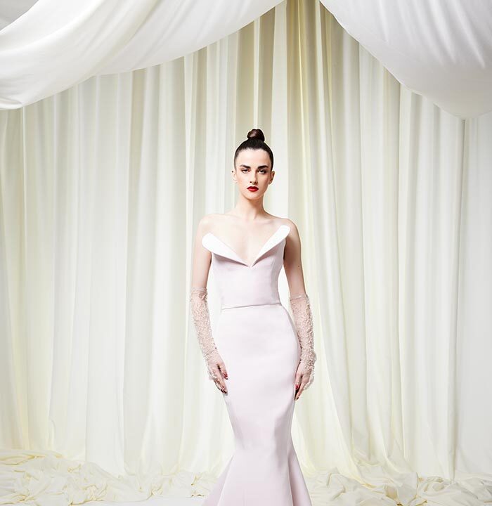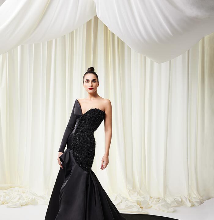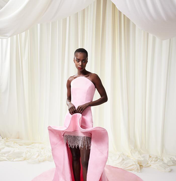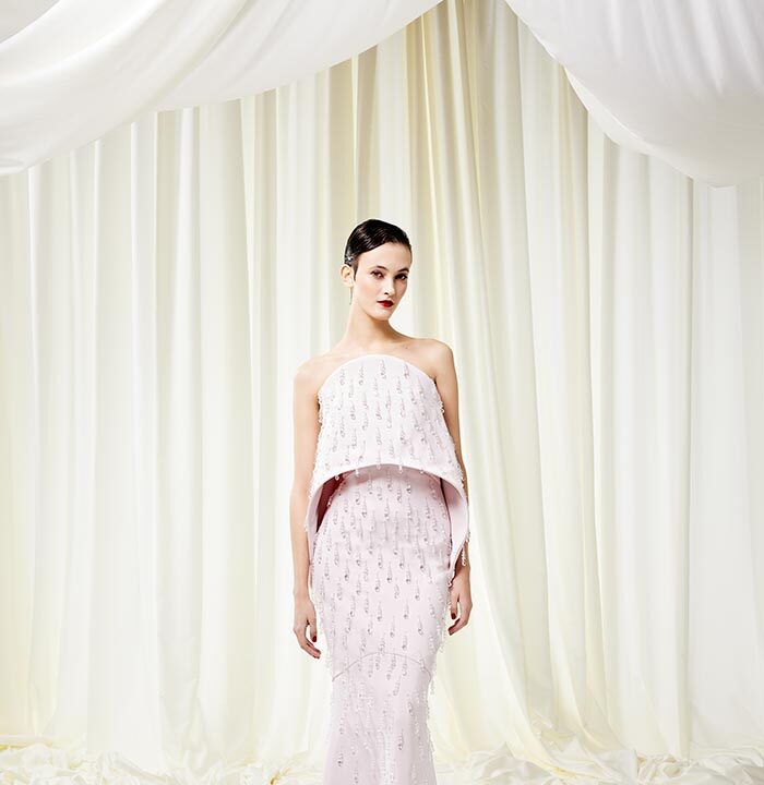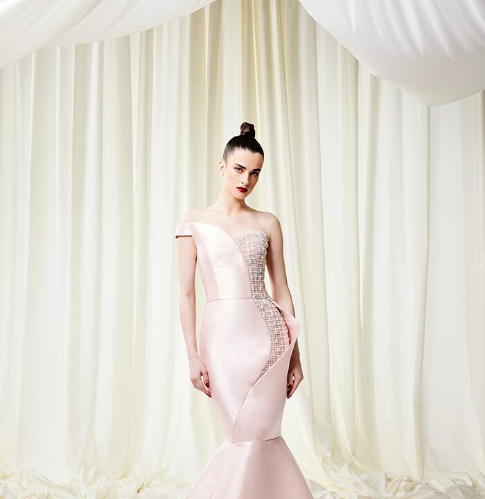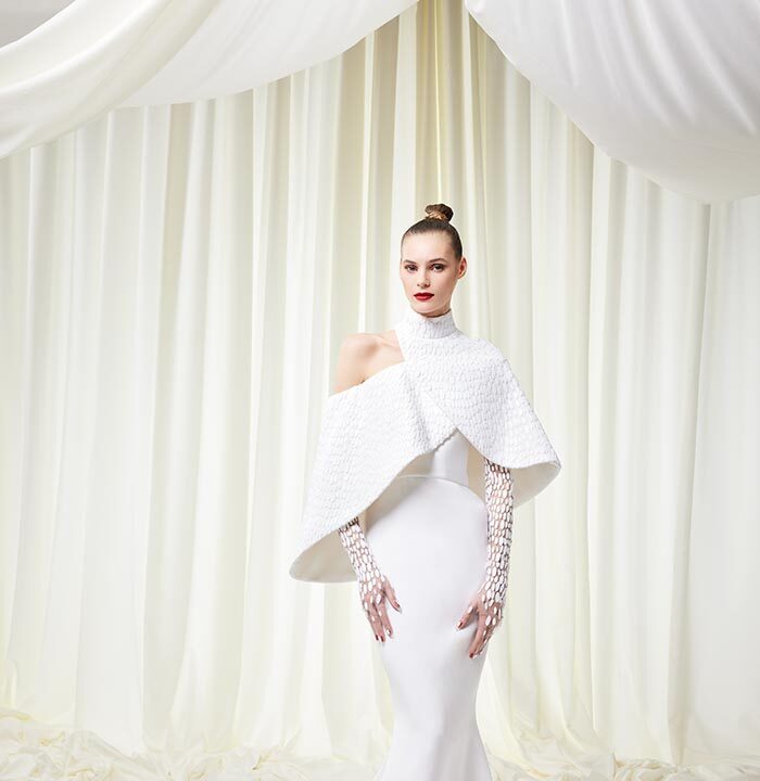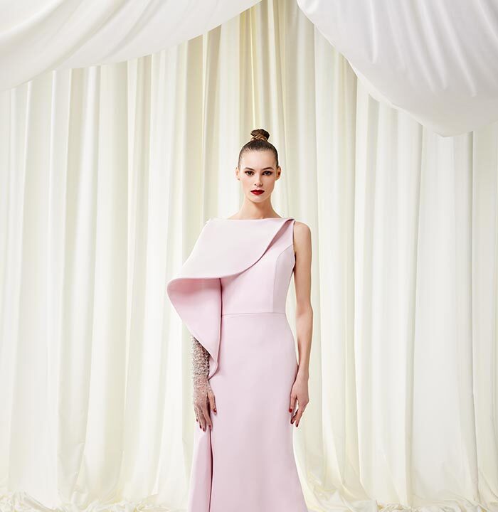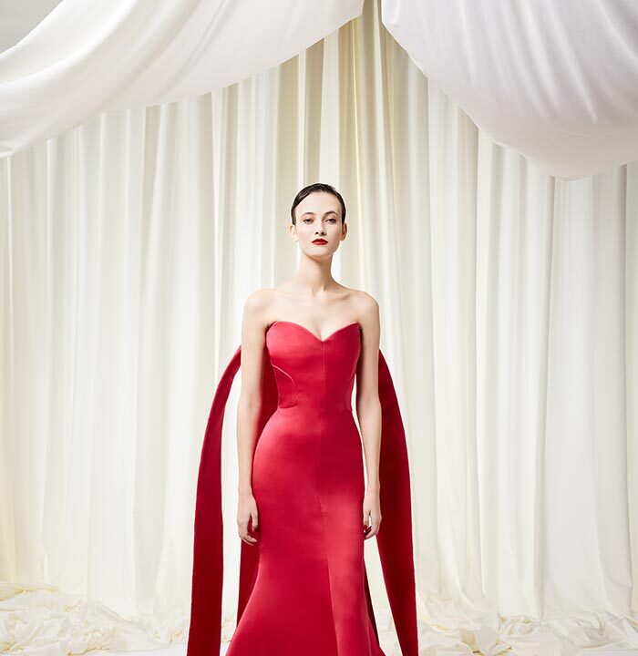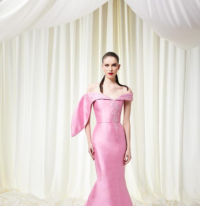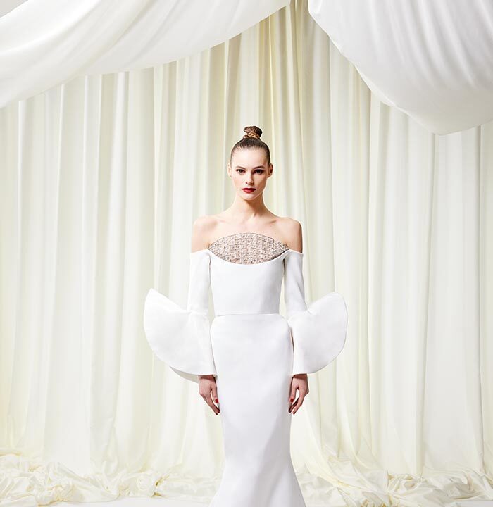 The first ones, to be used as day and cocktail dresses, are characterized by high waist and structured with wide shoulders whose silhouette resembles a bolero. While the mini dresses feature both an A-line silhouette that leaves the shoulders bare as well as voluminous sleeves. However, the evening gowns predominate, featured by sculptural yet sensual lines, characterized by silhouettes squeezed from the waist down to the knee, and exploding into voluminous ruffles.
