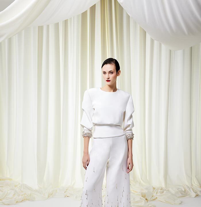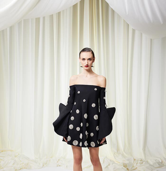 Another recurring theme: polka dots, in micro and macro versions, made of vinyl or crystals, applied or embroidered, hand-sewn on the veils or three-dimensional that seem to spill out of the garments like spikes.