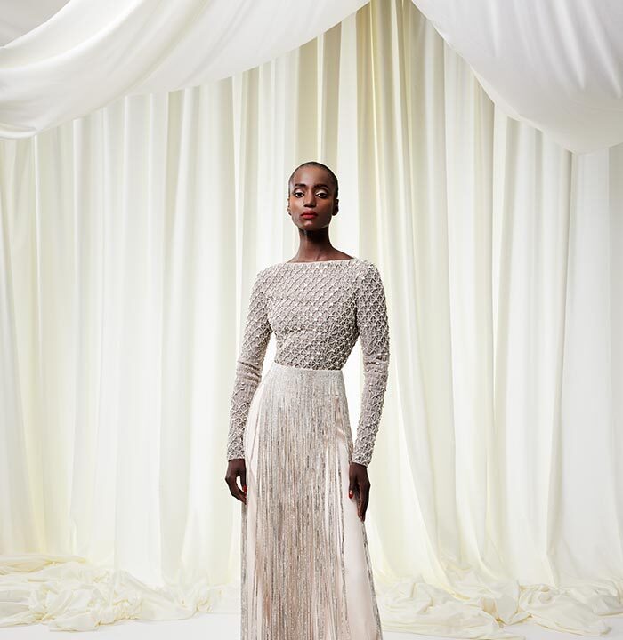 The looks are completed by crystal-embroidered, thread-embroidered gloves on tulle, matching both the gown and the veils.