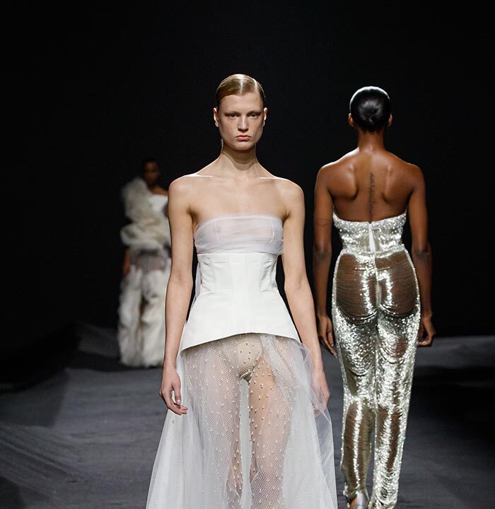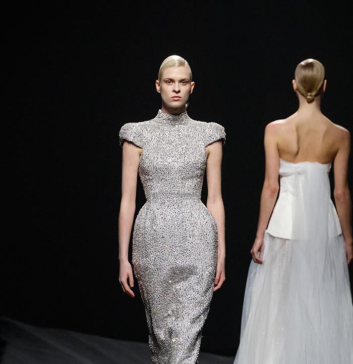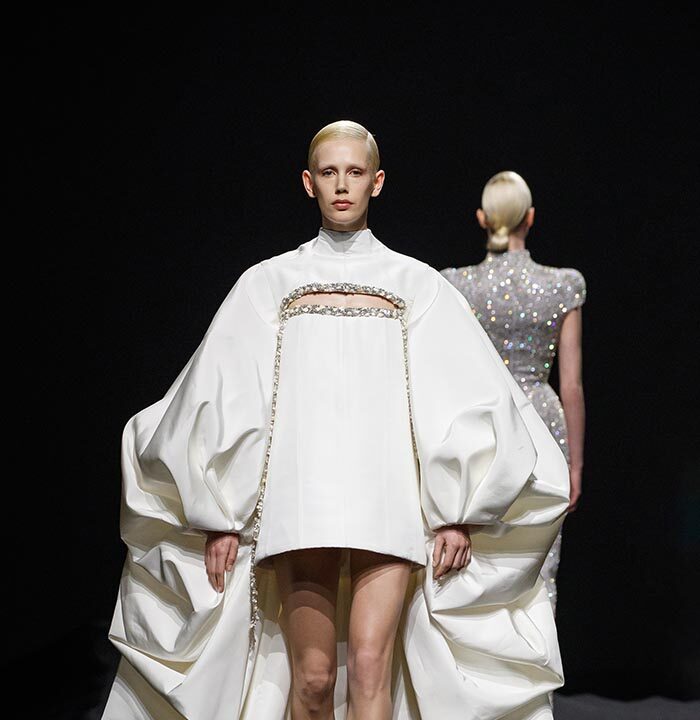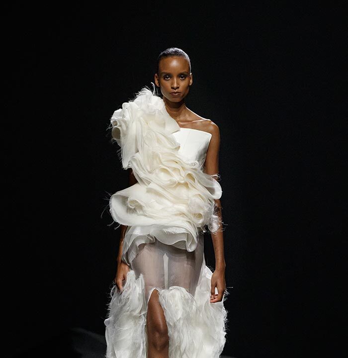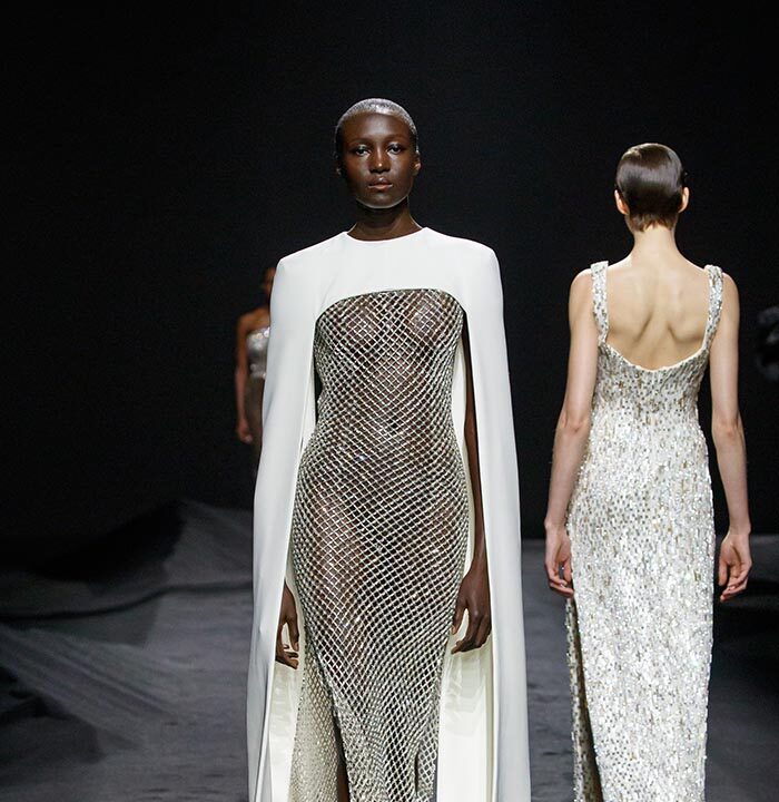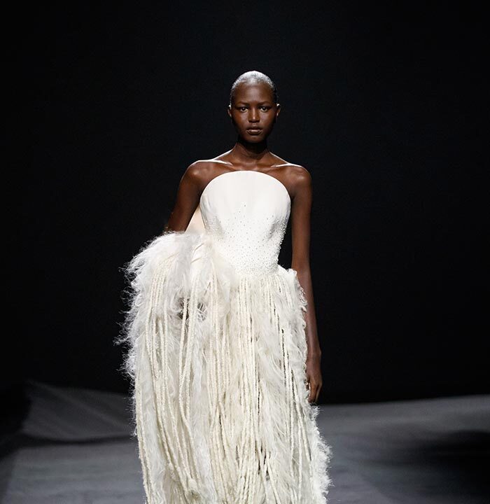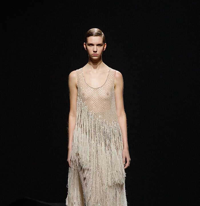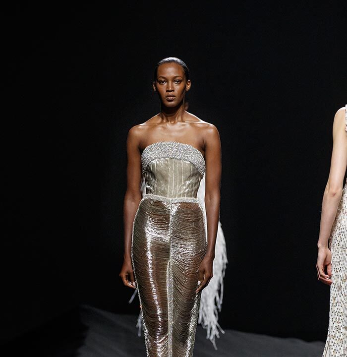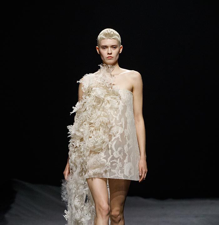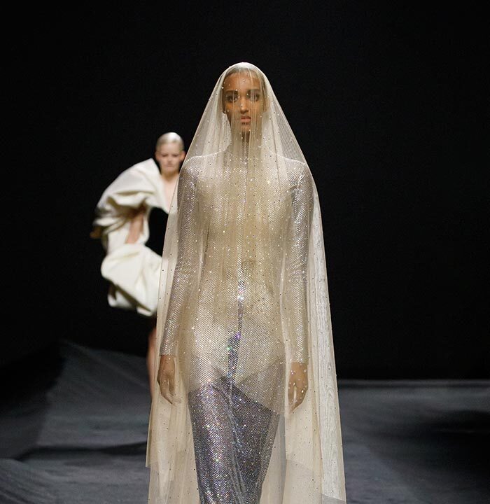 The collection of dresses and ensembles represents a return to roots for the brand, seizing the moment to delve deep into its maximal impulses while maintaining the pure lines ofits amplified silhouettes. This season the selection offers a twist on devastated glamour as wanderers of solemn landscapes in majestic shrouds. The textures compose shredded organzas and wisps of frayed mohair, volcanic crystal appliqués and crushed stones with dangling pearl charms in harmonious arrangements. Figure-hugging outlines act as heroic body-armor and over-blown shapes mimic natural rock formations, juxtaposing one another with masterful balance.