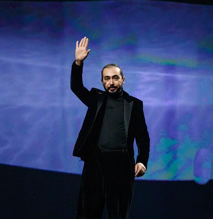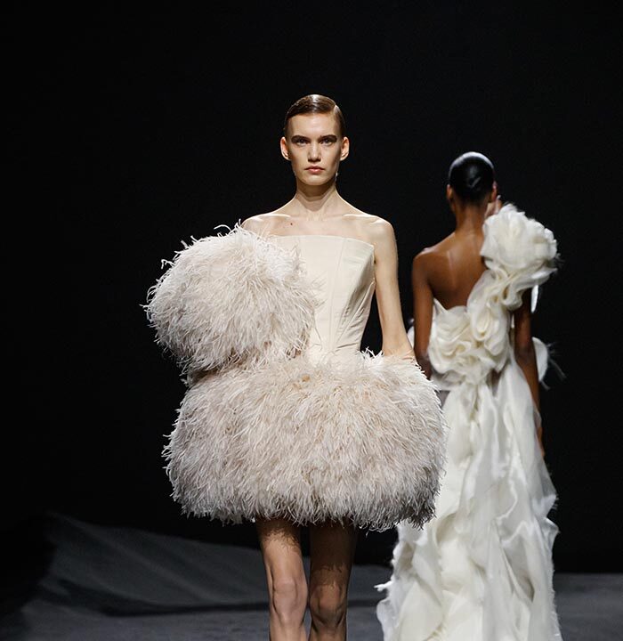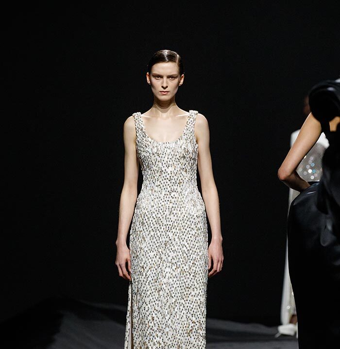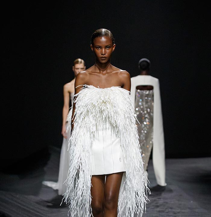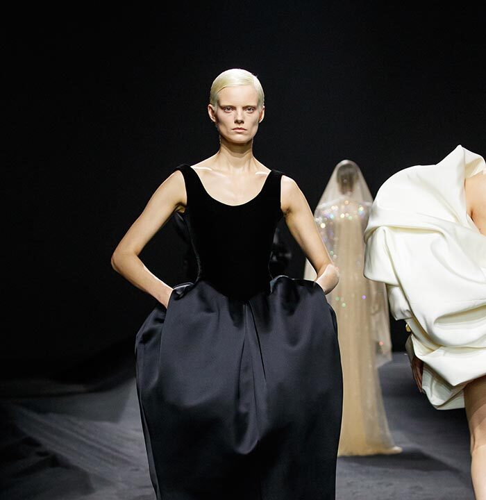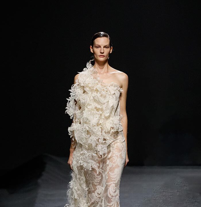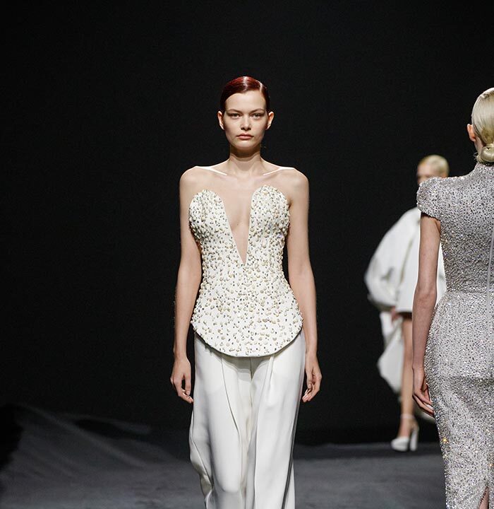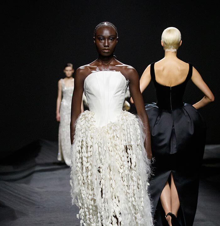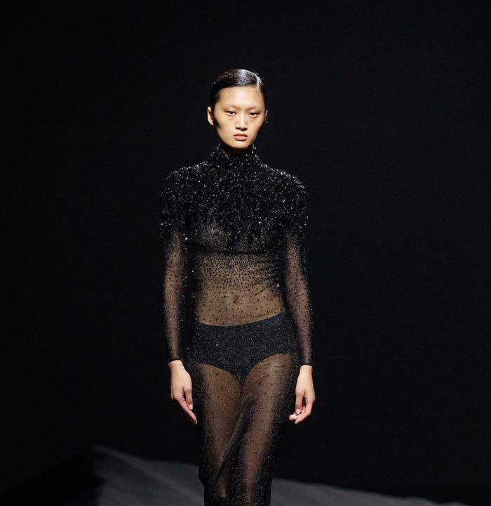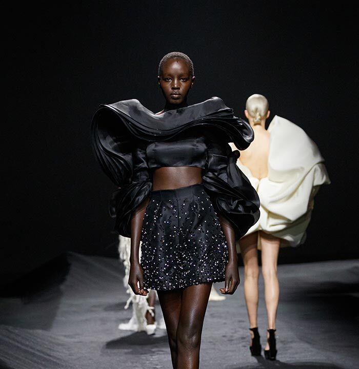 The collection of dresses and ensembles represents a return to roots for the brand, seizing the moment to delve deep into its maximal impulses while maintaining the pure lines ofits amplified silhouettes. This season the selection offers a twist on devastated glamour as wanderers of solemn landscapes in majestic shrouds. The textures compose shredded organzas and wisps of frayed mohair, volcanic crystal appliqués and crushed stones with dangling pearl charms in harmonious arrangements. Figure-hugging outlines act as heroic body-armor and over-blown shapes mimic natural rock formations, juxtaposing one another with masterful balance.