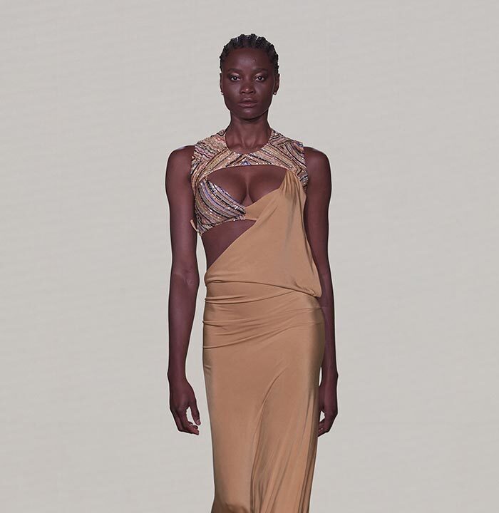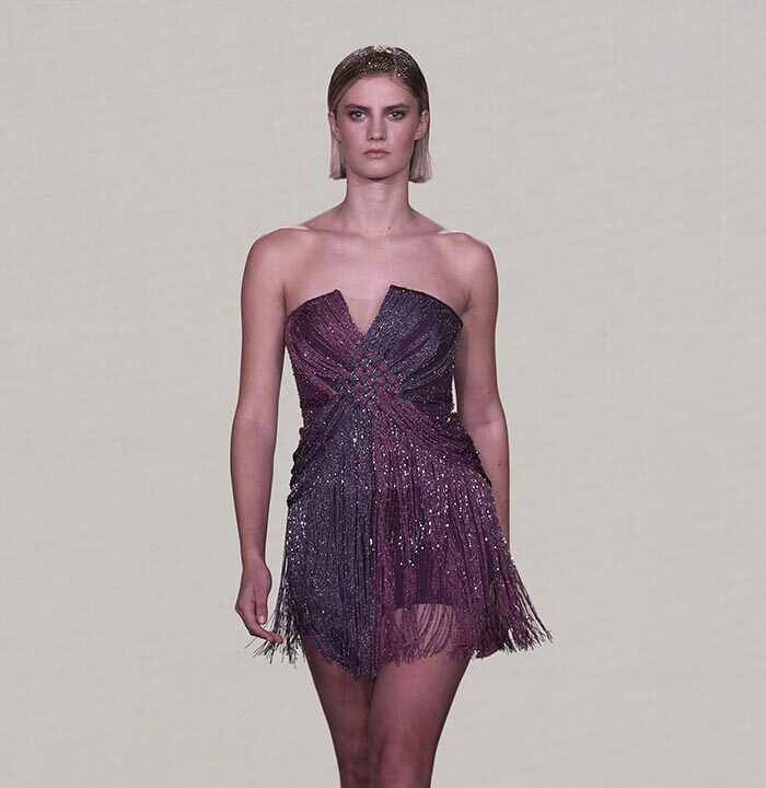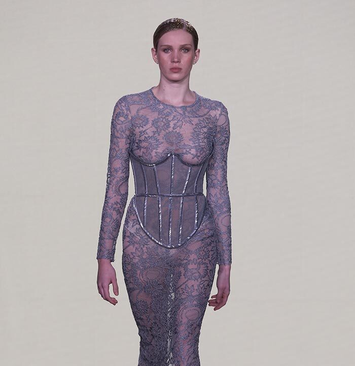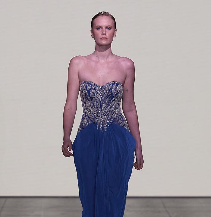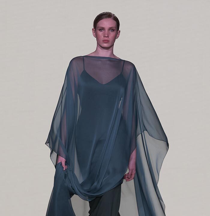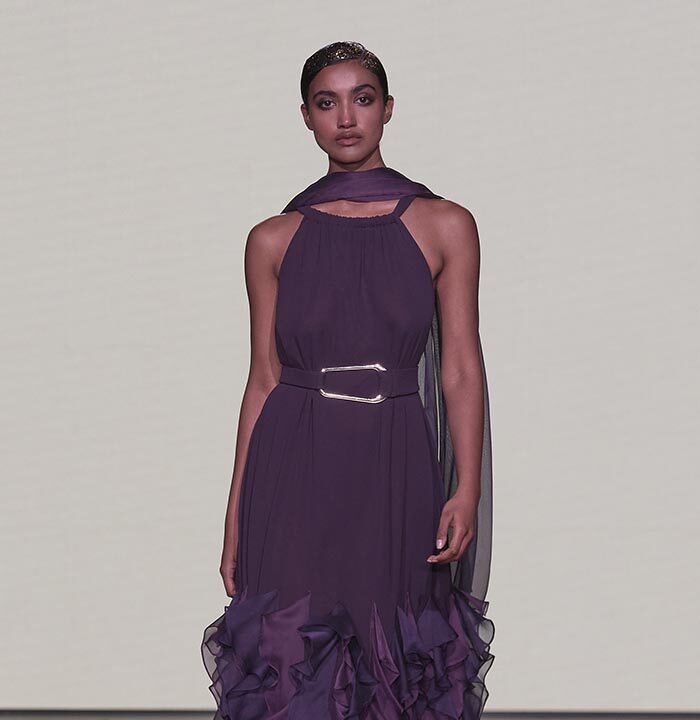 Bas-reliefs of Sumerian civilization show figures wearing skirts and dresses composed of woven cloth and tufted fabrics. The wrapped and draped clothes have influenced the dress of Greeks and Egyptians. Inspired by the chic Sumerian royalty, the designer used the materials and top-level workmanship of the same lands creating Legend Reborn – Sumerian royalty on the catwalk of London Fashion Week.