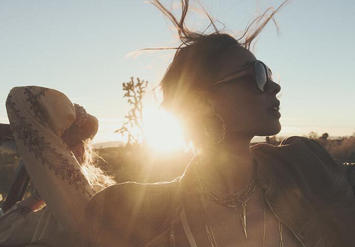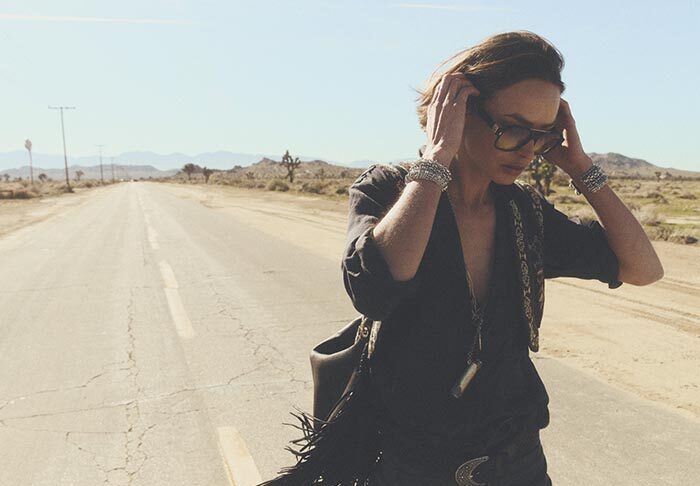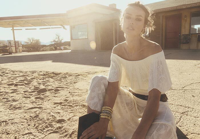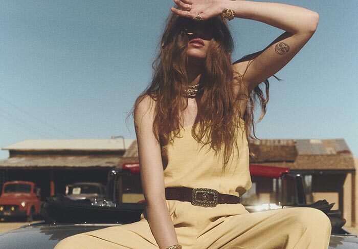 An escape into the Californian desert, arms stacked with cascading bracelets and necklaces. Embroidered blouses and belted denim set the tone: lightweight fabrics and soft hues, pink and pale yellow, melting into the landscape. Black is twisted with fringes or cross-stitch embroidery.