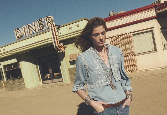At dusk, neon lights tint dreams pink. In the footsteps of Thelma & Louise, in flared jeans, ba&sh women are proud and rebellious, wearing emancipation slung over their shoulder. Head thrown back toward the rising sun, a surge of freedom, optimism and femininity unfolds before the open road ahead.