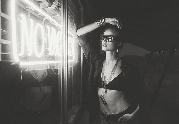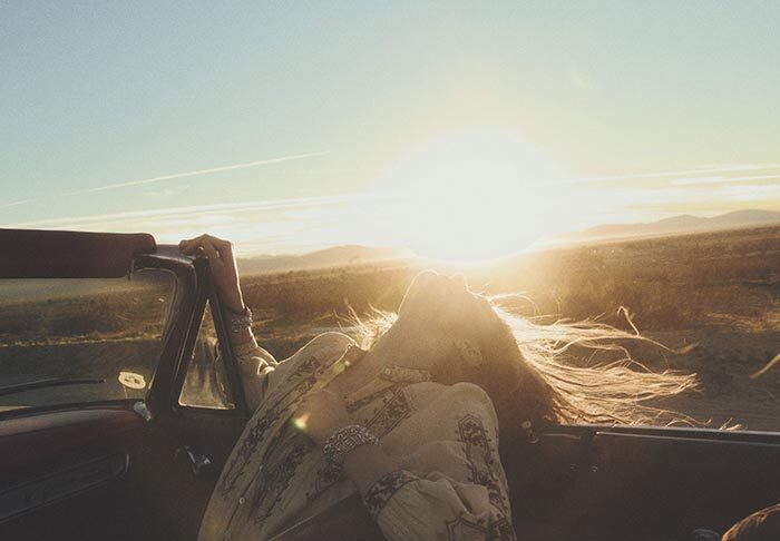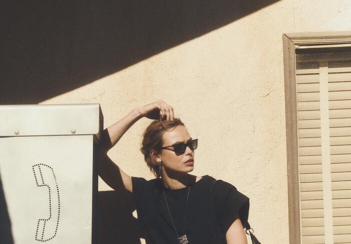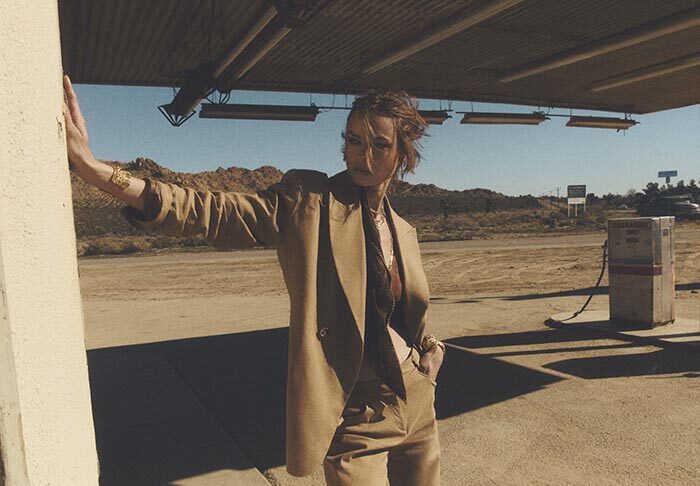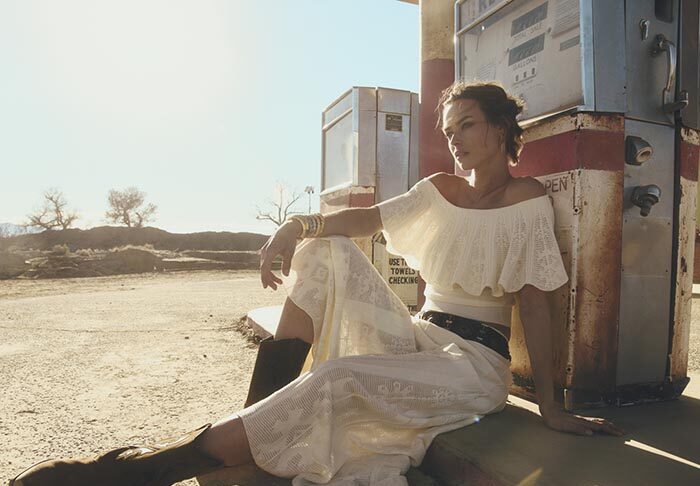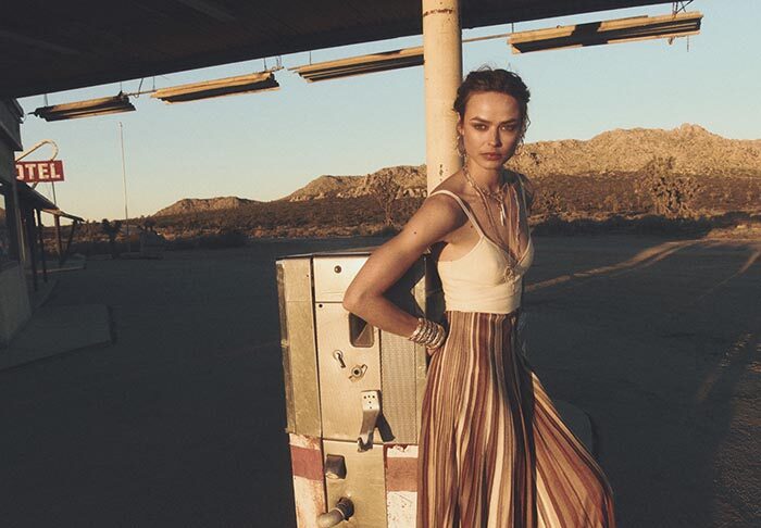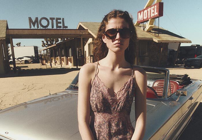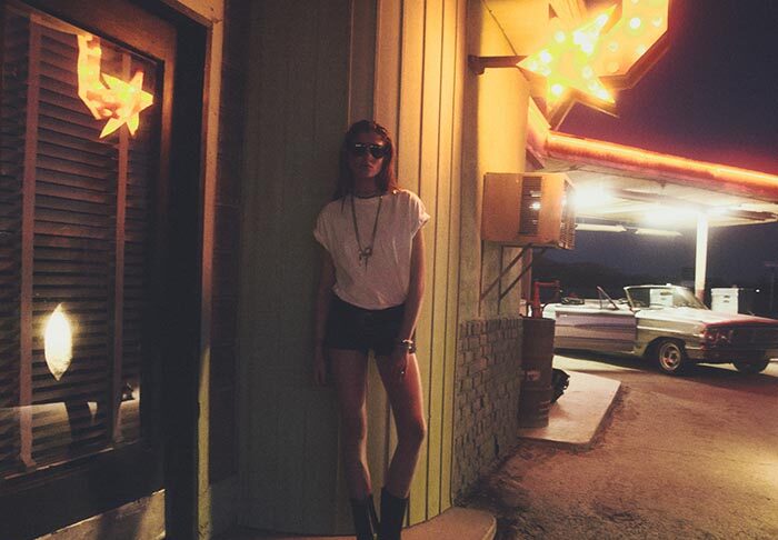 Vintage motels, diners and gas stations become the backdrop of a cinematic dream. Bare legs beneath skirts catching the warm desert breeze, cowboy boots ready to bite into golden dust. Beneath the blazing heat, time seems suspended, dissolving into the contemplation of sunlight reflections filtered through venetian blinds.