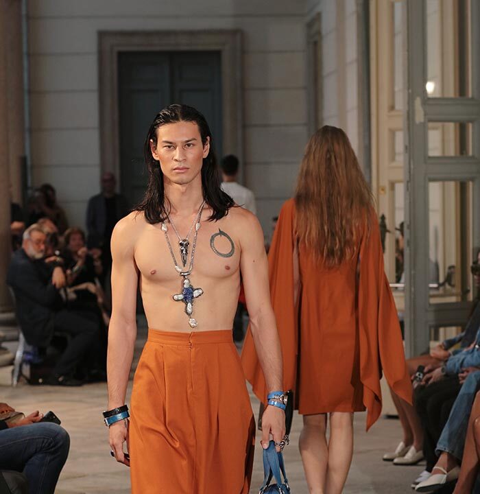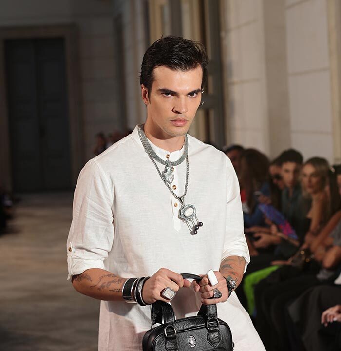 From Mexico, an explosion of color and attention to detail takes the audience on a dreamlike, almost magical journey, evoking the joy of living and the culture of Baja California Sur. The Mexican accessories and jewelry brand INDIRA & ISIDRO, led by the duo Indira López and Isidro Sánchez Icaza, showcases pieces from the SS 2024 collections “Hummingbird Dreams”, “Mexico is silver and we wear it on our skin”, and “The Spirit of the Sea”. These pieces are crafted using natural elements such as bones, shells, deer antlers, and leather, in addition to precious gemstones of various colors and metals like bronze, copper, brass, gold, and silver.