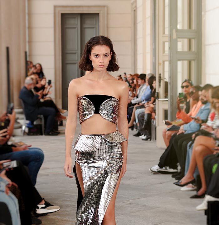 NAALA MAR embodies luxury, elegance, and exclusivity. The SS 2024 collection is an elegant ensemble of evening wear, featuring a color palette of deep blacks and luminous metallic accents in silver. The designs accentuate the contours of the female body, showcasing enchanting sirens of the night adorned in darkly captivating attire. The textures of the garments alternate between soft fabrics and cascades of shimmering sequins, capturing light like splendid scales of mysterious creatures in the depths of the sea.