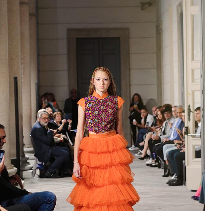 From Hong Kong, SPARKLE by KAREN CHAN. The philosophy of SPARKLE is “No rules, no limits”, and its essence is that “Beauty knows no boundaries”. This line blends Eastern and Western aesthetics, transforming traditional cheongsam and tangzhuang into colorful, individualistic couture that bridges the gap between East and West with a playful, retro, and funky twist. Each piece in SPARKLE’s runway show moves rhythmically and vivaciously. The vibrant colors and intriguing volumes create works of art in motion – a joyful, colorful painting to wear, narrating a story about the past and the culture of Hong Kong.