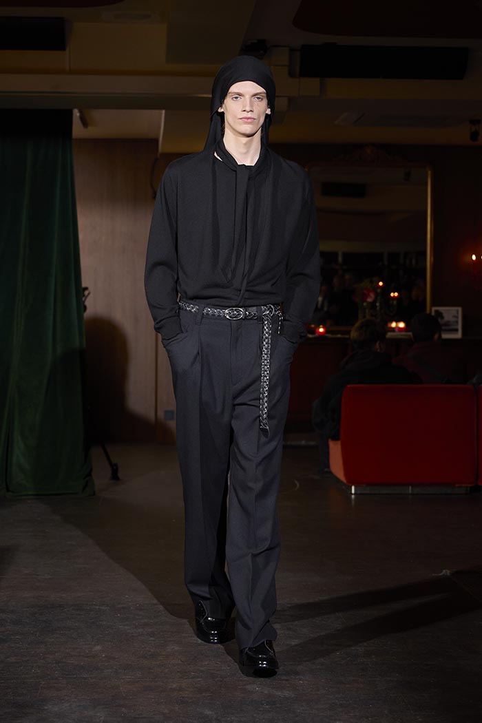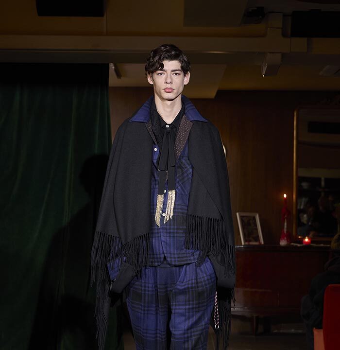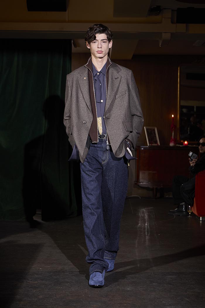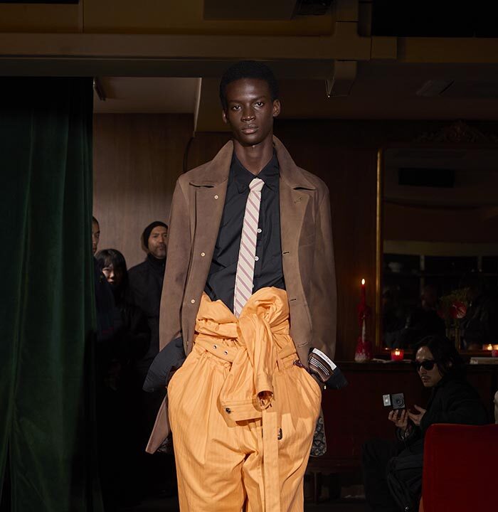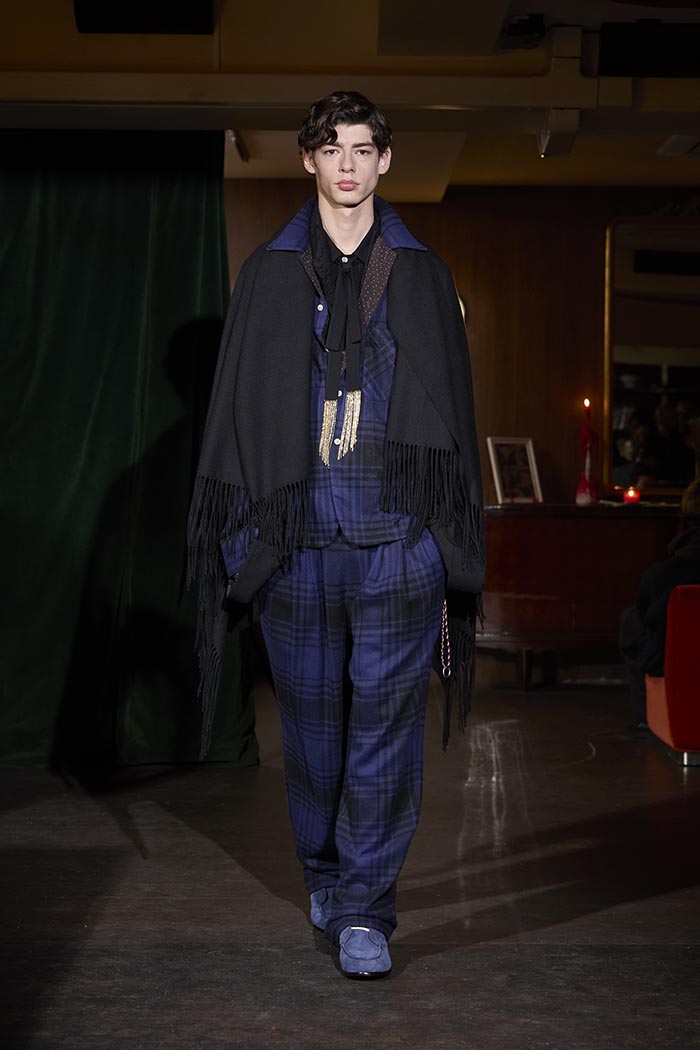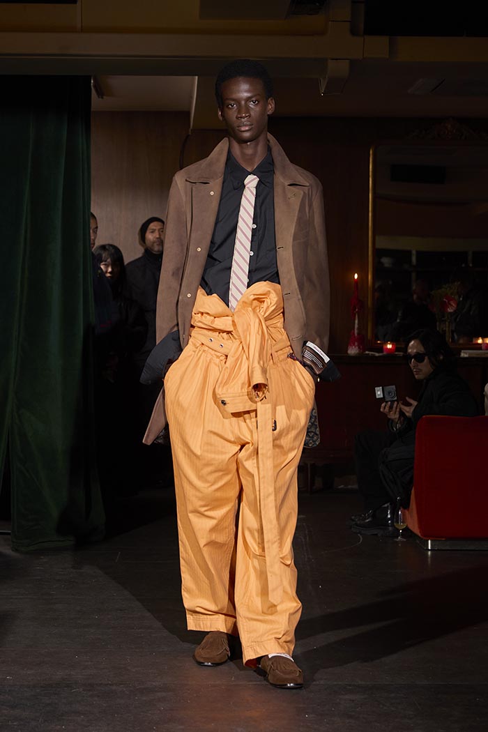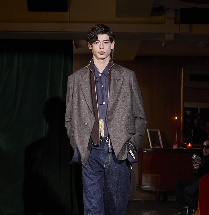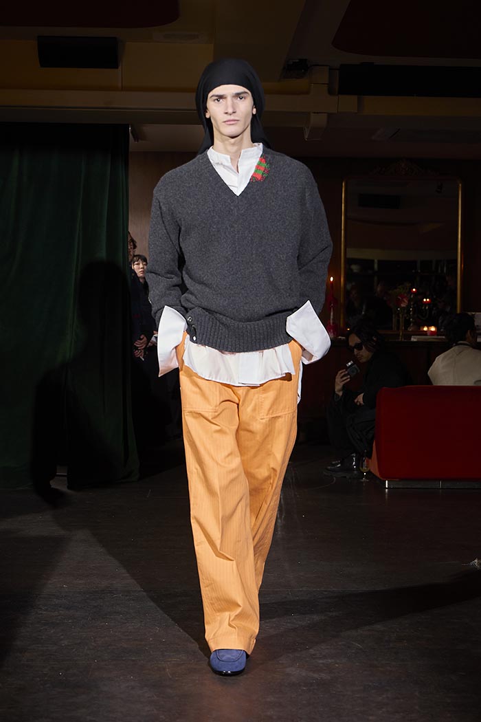 Trousers feature multiple irregular tucks, while a hidden drawstring creates gathers depending on the wearer. At first glance, the gilet maintains a traditional shape, yet closer inspection reveals subtle details: a different fabric trims the neckline, and pleats are concealed at the back, invisible from the front. In an era that demands transparency, this deliberate act of covering becomes a quiet metaphor. With a playful twist, denim is woven with silk, shaping a subtle nap-finished. The color palette deliberately avoids brightness: an orange reminiscent of a mist-covered sunset; blacks that are not quite black, like shadows stretching at dusk; punctuated by the presence of checks, whose assured voice inhabits a palette rooted in reality.