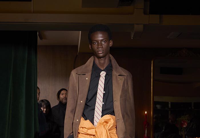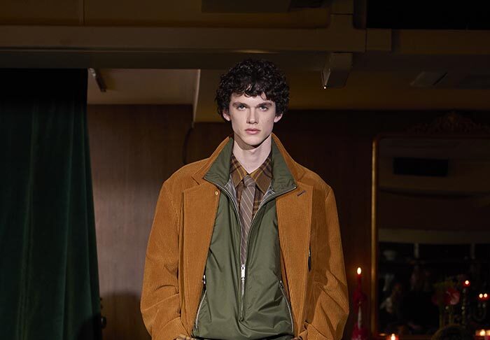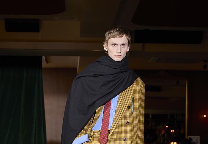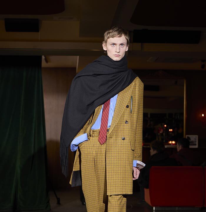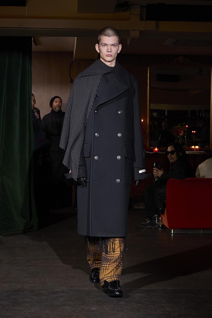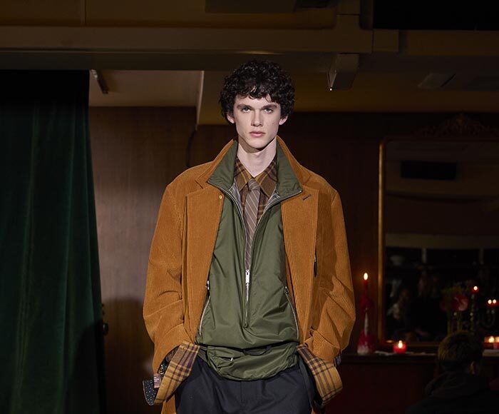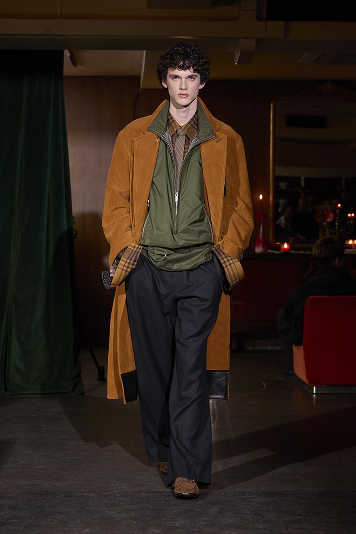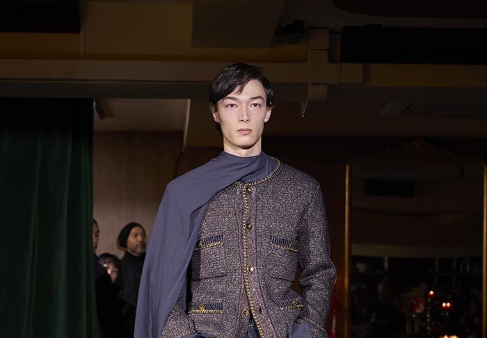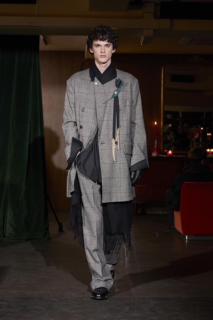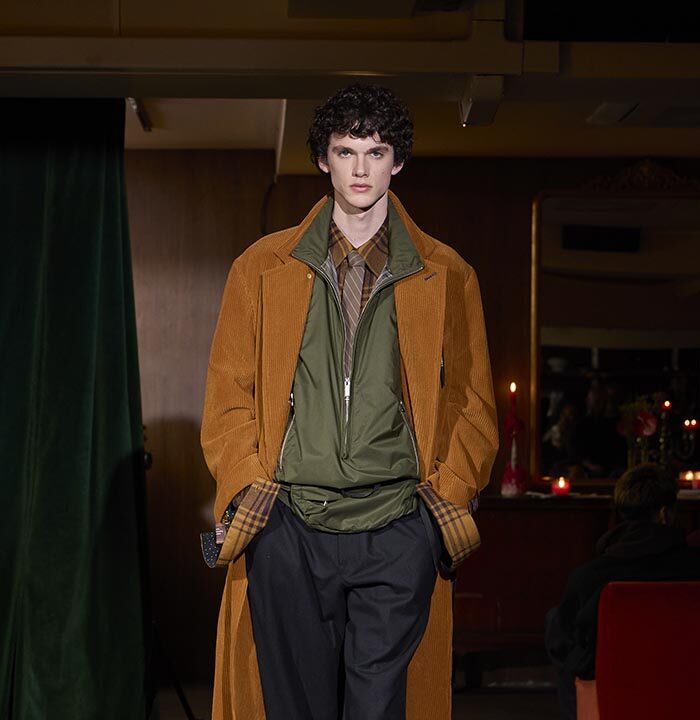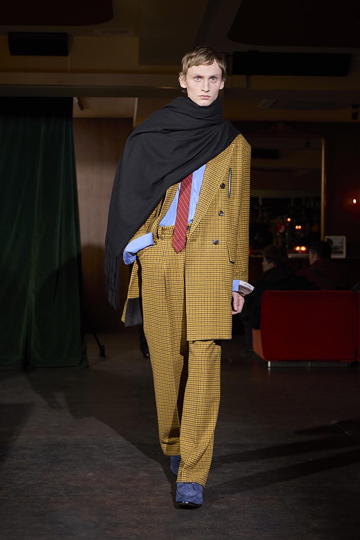 Trousers feature multiple irregular tucks, while a hidden drawstring creates gathers depending on the wearer. At first glance, the gilet maintains a traditional shape, yet closer inspection reveals subtle details: a different fabric trims the neckline, and pleats are concealed at the back, invisible from the front. In an era that demands transparency, this deliberate act of covering becomes a quiet metaphor. With a playful twist, denim is woven with silk, shaping a subtle nap-finished. The color palette deliberately avoids brightness: an orange reminiscent of a mist-covered sunset; blacks that are not quite black, like shadows stretching at dusk; punctuated by the presence of checks, whose assured voice inhabits a palette rooted in reality.
