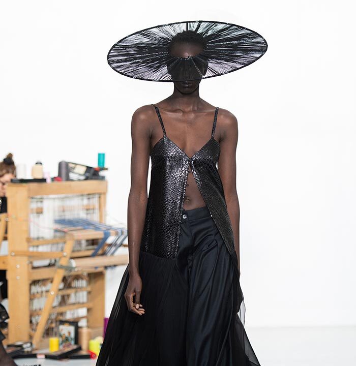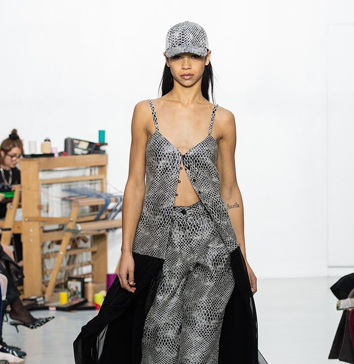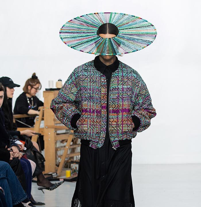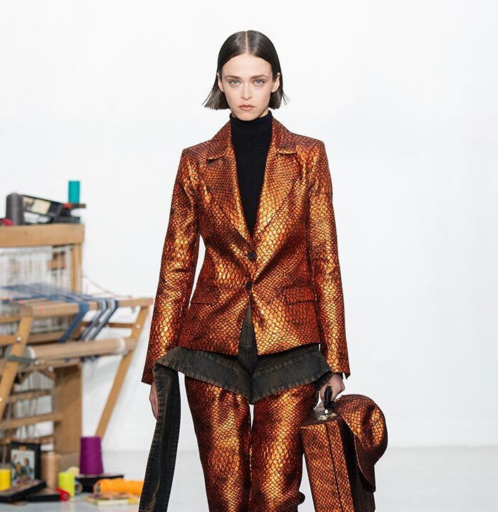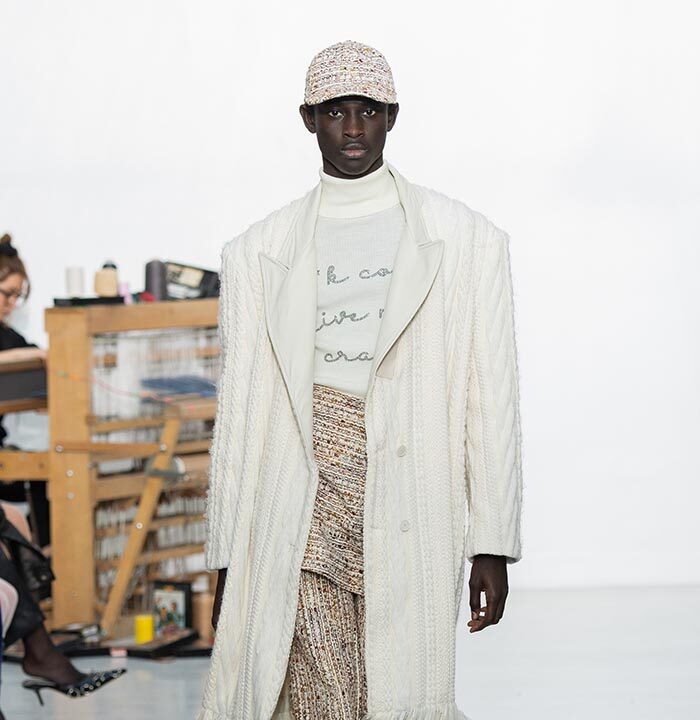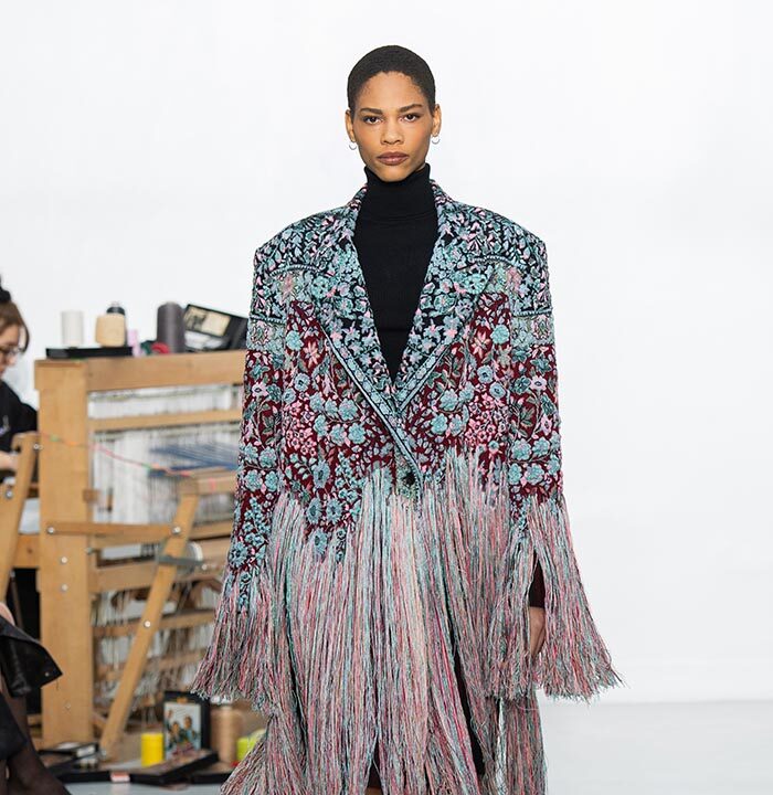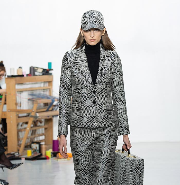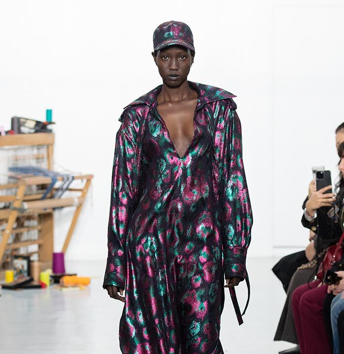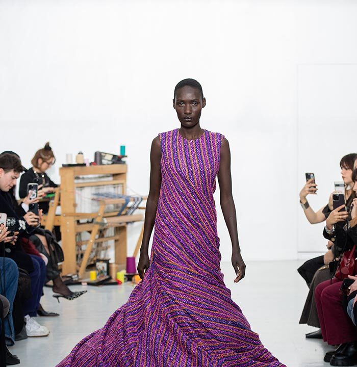 This collection serves as a heartfelt homage to the artistry of fabric making while lamenting its dwindling appreciation in modern times. Inspired by the loom and yarns, Benmoyal crafted an immersive experience, with 300 miniature looms sent as invitations and set design evoking a giant loom. Against this backdrop, models adorned in unique woven fabrics from head to toe, including a collaboration with Dr. Martens, graced the runway, while weavers showcased their skills amidst the audience. With a focus on pushing fabric design boundaries, the collection features 35 looks, including the revival of Benmoyal’s iconic cassette tapes woven fabric, reimagined with a faux snake skin twist.