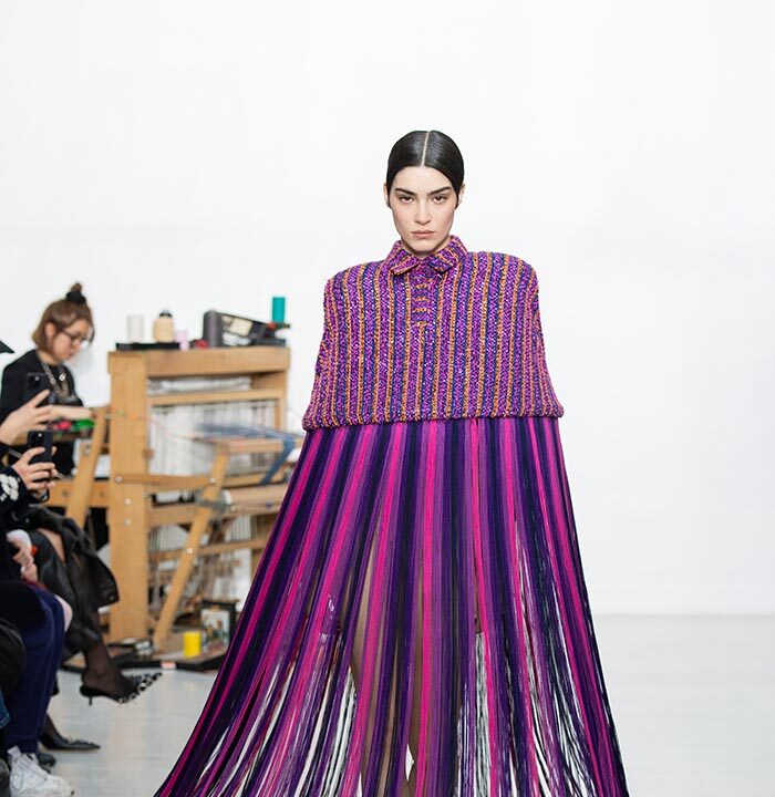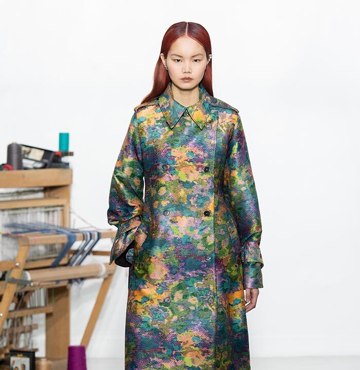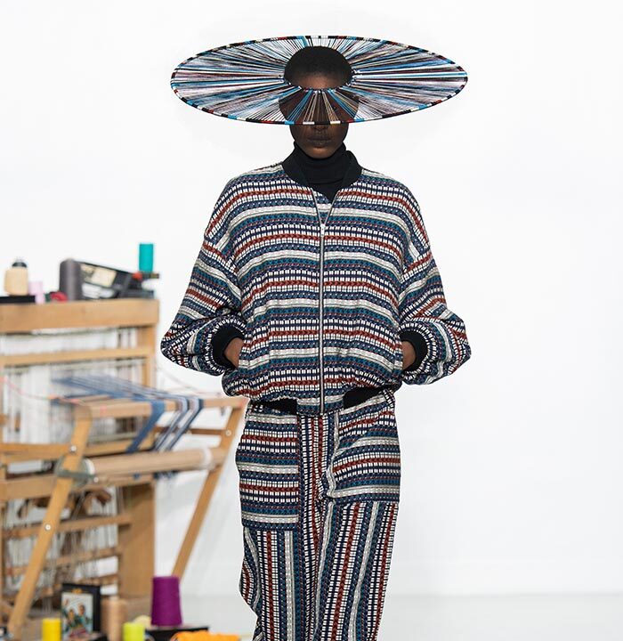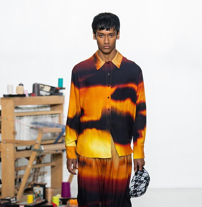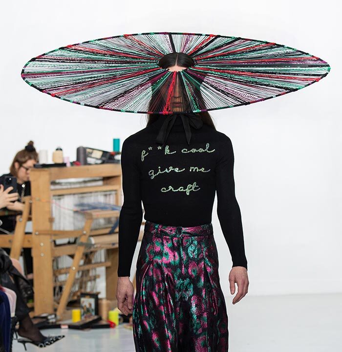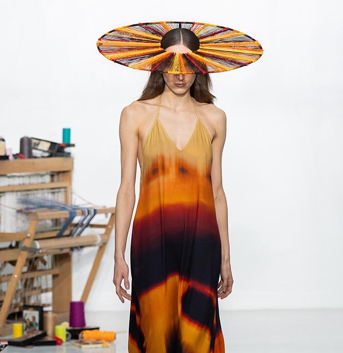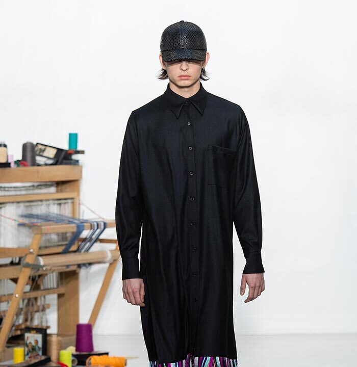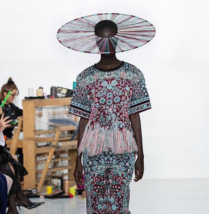 This collection serves as a heartfelt homage to the artistry of fabric making while lamenting its dwindling appreciation in modern times. Inspired by the loom and yarns, Benmoyal crafted an immersive experience, with 300 miniature looms sent as invitations and set design evoking a giant loom. Against this backdrop, models adorned in unique woven fabrics from head to toe, including a collaboration with Dr. Martens, graced the runway, while weavers showcased their skills amidst the audience. With a focus on pushing fabric design boundaries, the collection features 35 looks, including the revival of Benmoyal’s iconic cassette tapes woven fabric, reimagined with a faux snake skin twist.