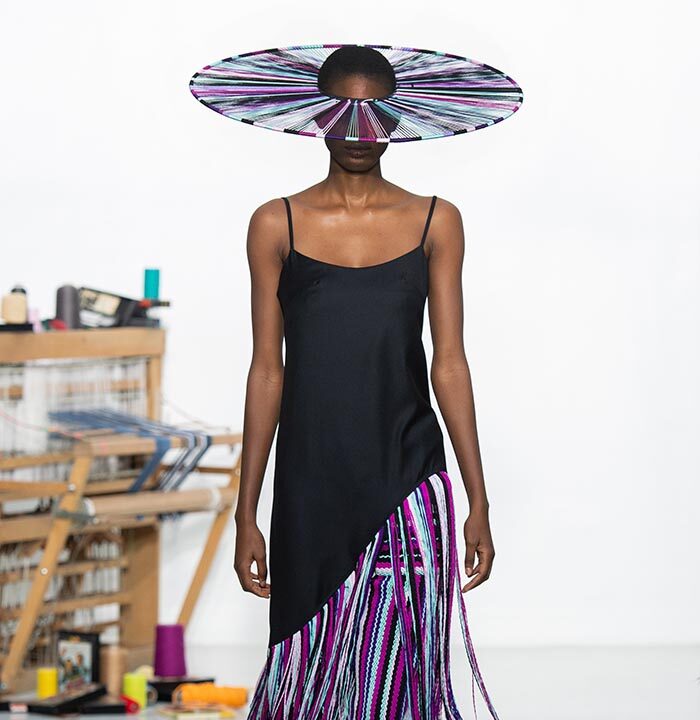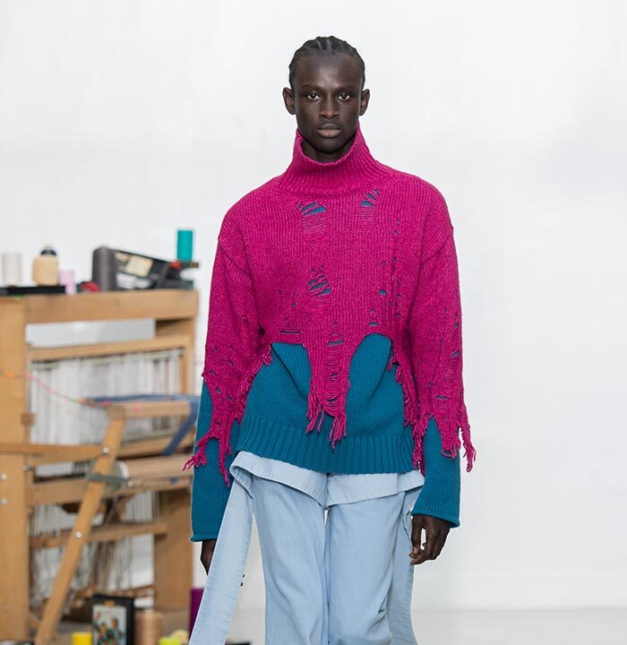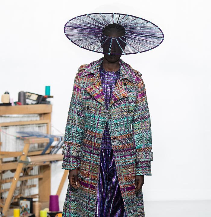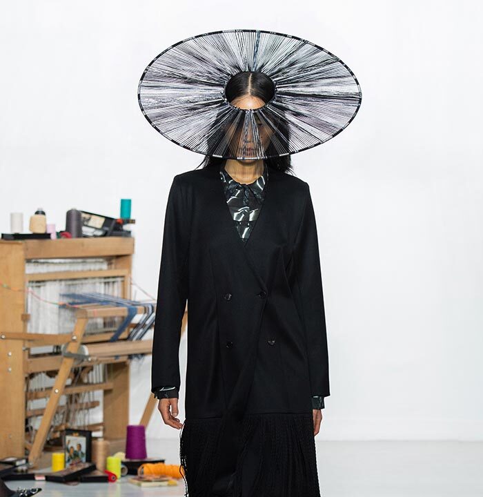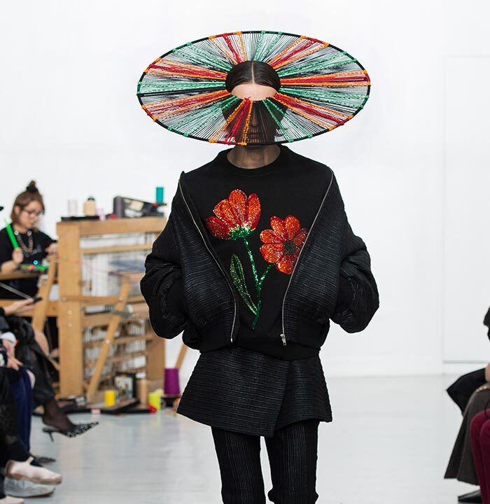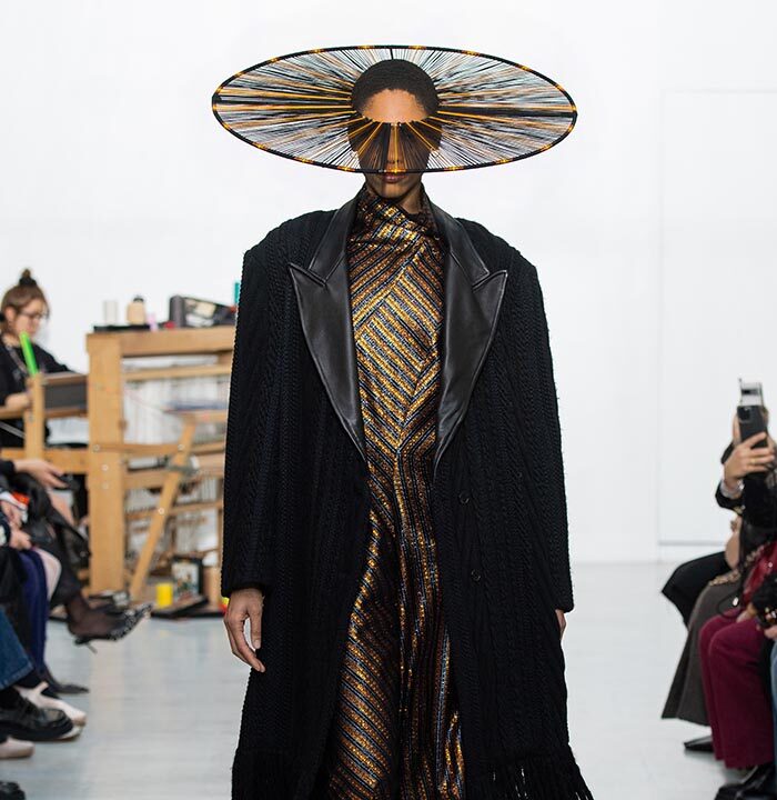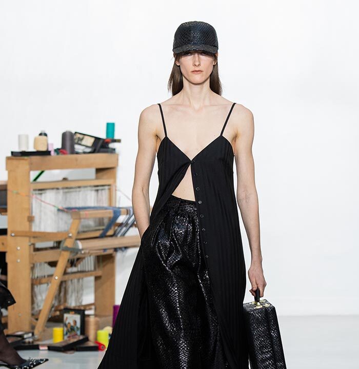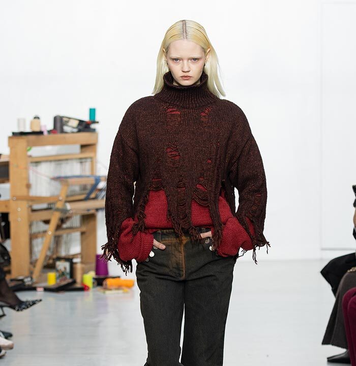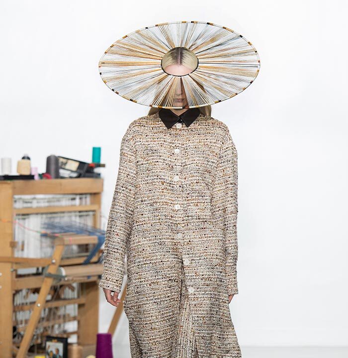 This collection serves as a heartfelt homage to the artistry of fabric making while lamenting its dwindling appreciation in modern times. Inspired by the loom and yarns, Benmoyal crafted an immersive experience, with 300 miniature looms sent as invitations and set design evoking a giant loom. Against this backdrop, models adorned in unique woven fabrics from head to toe, including a collaboration with Dr. Martens, graced the runway, while weavers showcased their skills amidst the audience. With a focus on pushing fabric design boundaries, the collection features 35 looks, including the revival of Benmoyal’s iconic cassette tapes woven fabric, reimagined with a faux snake skin twist.