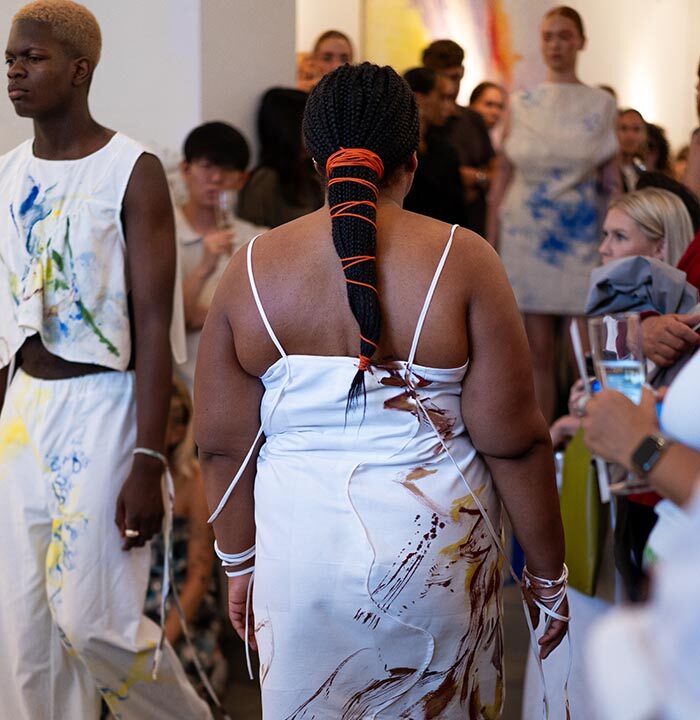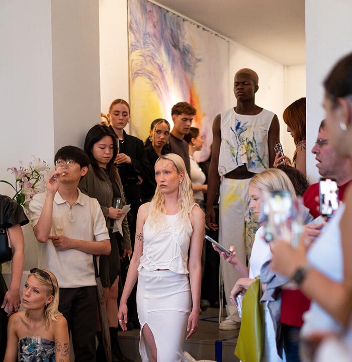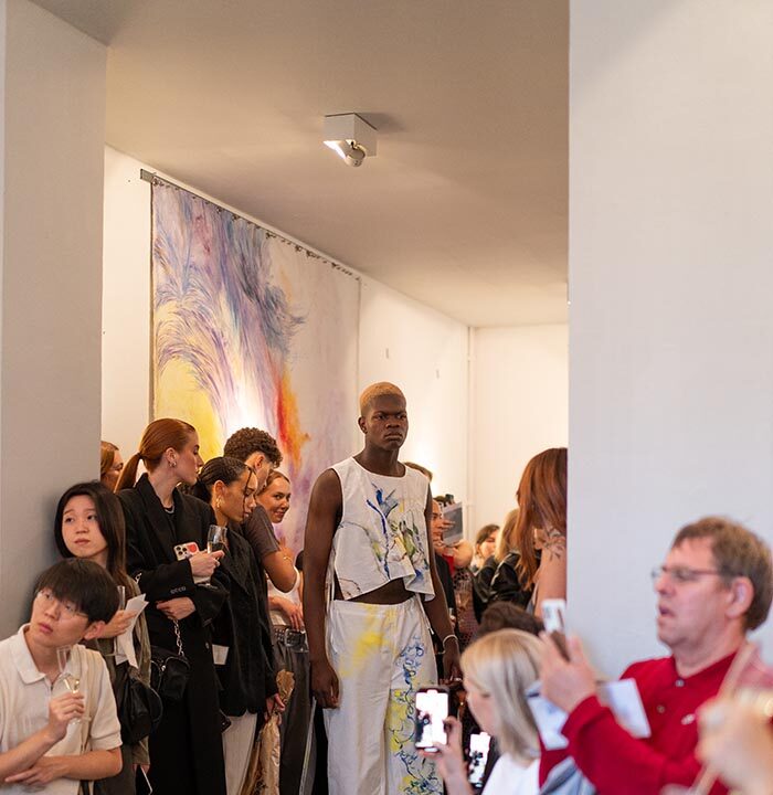The collection, made by the designer duo Anaëlle Delassus and Charlotte Westphal, puts a spotlight on the symbiosis of fashion, art, and sustainability. To achieve that, W1P Studios worked together with the rising artist Seonah Chae and the Berliner Textilhafen.