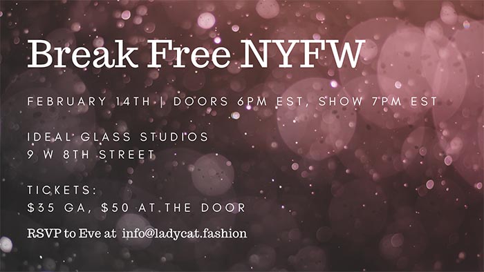 Break Free NYFW will be held on Monday, February 14th at 7pm ET at Ideal Glass Studios located at 9 West 8th Street in the West Villiage.
