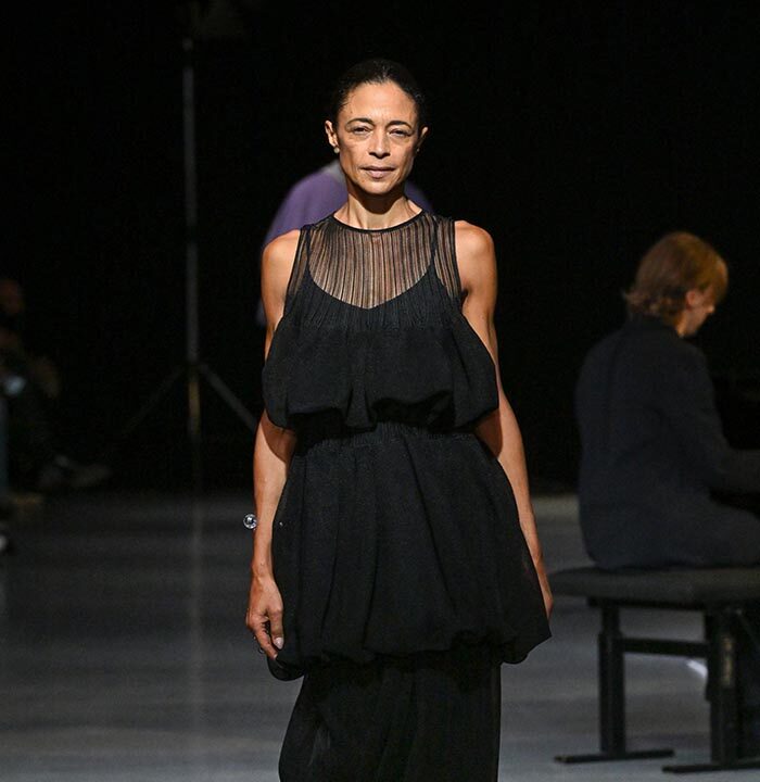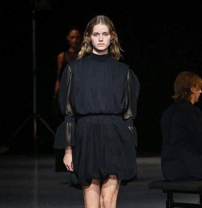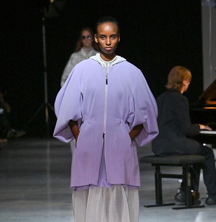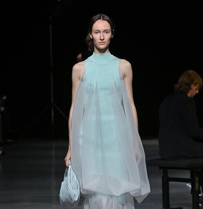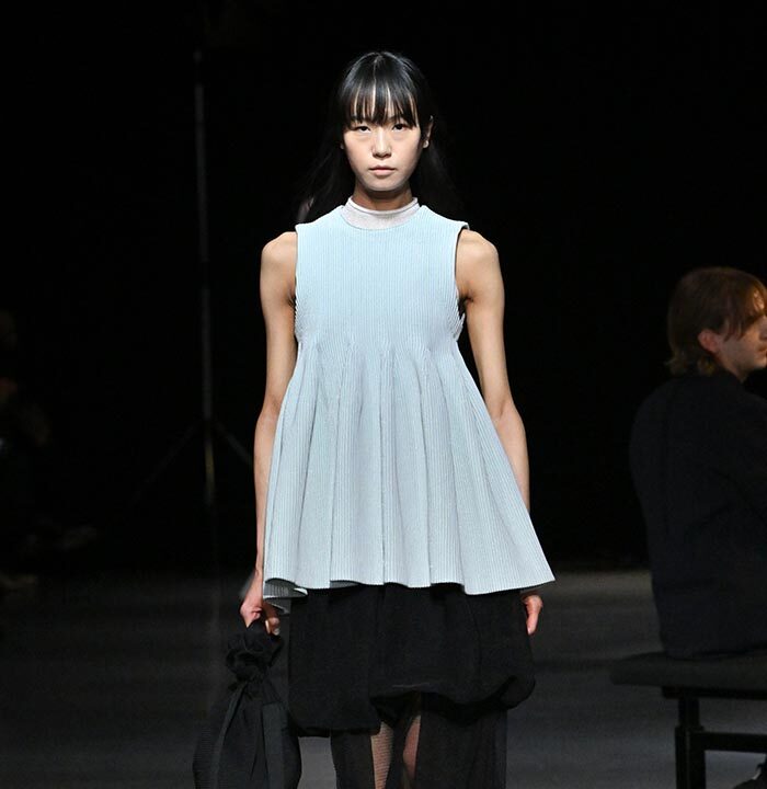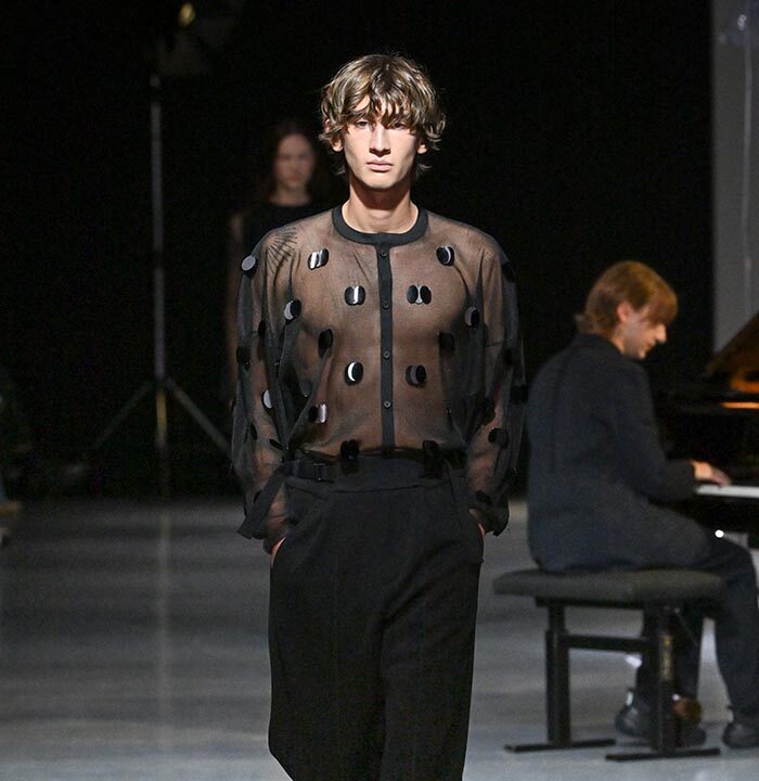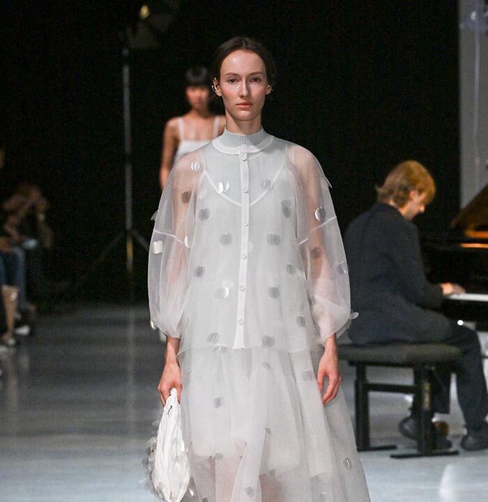 The collection redefines clothing as tools for daily life, combining transparency and soft, rounded silhouettes with a grounded portrayal of sophisticated women. Set in a venue reminiscent of a concert rehearsal, the performance featured the chamber ensemble TLF Trio, whose minimalist and fluid sounds created a relaxed and contemplative atmosphere.