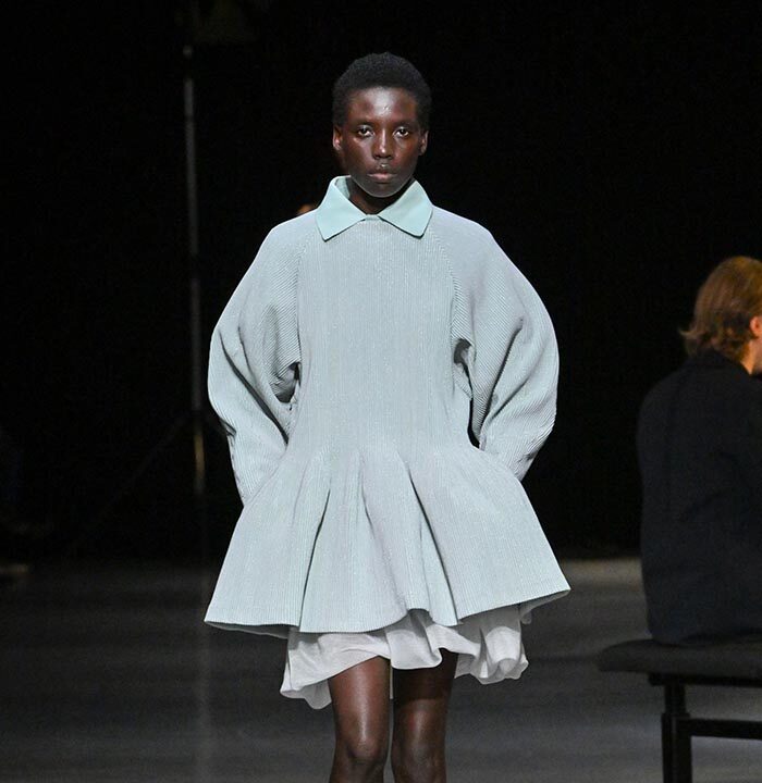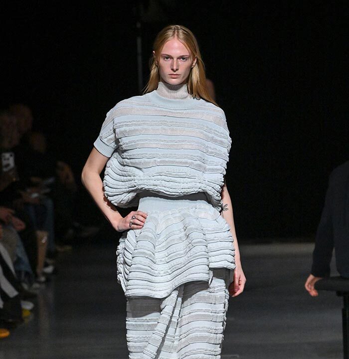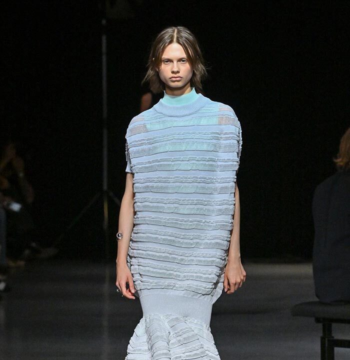 CFCL’s iconic POTTERY series is reimagined as translucent dresses, inspired by the smooth acrylic sculptures of artist Mariko Mori, and the intricate textures found in the works of glass artist Émile Gallé. OVERWRAPPED POTTERY (LOOK 2, 5, 8, 16) is knitted seamlessly, with mint-colored recycled polyester on the inside and sheer nylon-polyester yarn on the outside. Soft hues are enveloped in transparent threads, emitting a faint glow. POTTERY SWELL (LOOK 9, 10, 11, 12, 13, 14) blends three types of recycled polyester to create intricate relief textures and a layered translucency. Rich in elasticity, the dresses sway rhythmically with every step.