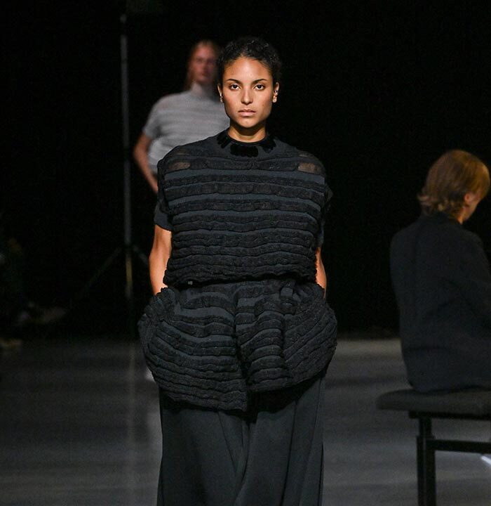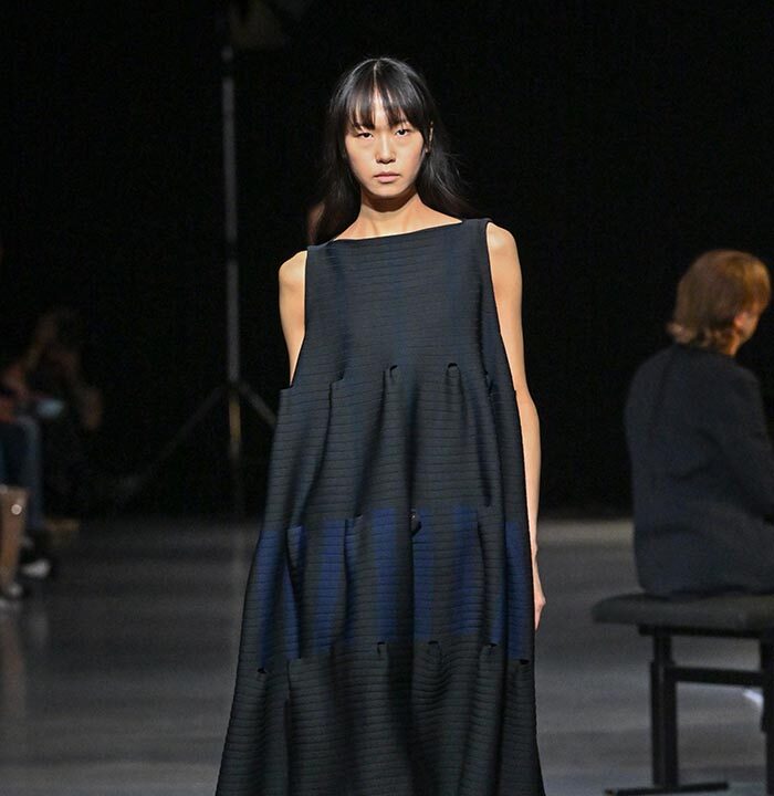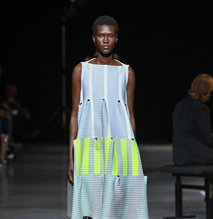 The only graphic motif of this collection is inspired by the interior textiles of Sophie Taeuber-Arp, wife of Jean Arp, and features a constructivist composition of stripes. Made of firm recycled polyester, the dress is knitted in an A-line silhouette with perforated sections that create dynamic stripes of varying widths. TERRACED DRESS (LOOK 24, 25) features seamless graphics in refreshing spring hues accented with neon yellow, imparting a lively and energetic feel. TERRACED LUCENT DRESS (LOOK 26) is knitted continuously from a sheer top with transparent yarns to a two-tone striped bottom.