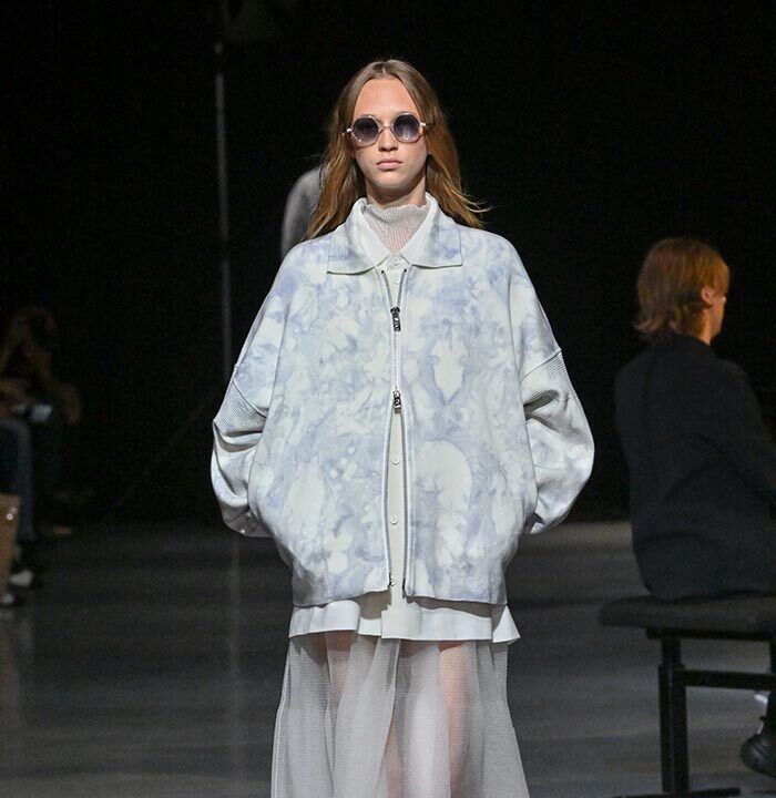Items knitted from organically grown cotton cultivated in the Pandurna region of Madhya Pradesh, in central India, are hand-dyed at a workshop in Arimatsu, Aichi Prefecture. The process evokes the soft embrace of spring light in pale shades of pink and gray. DYEING MILAN (LOOK 18, 19) includes voluminous blousons and pants, knitted with cotton on the outside and recycled polyester on the inside. DYEING TC LUCENT (LOOK 20, 21, 22) uses an original fine-count yarn—cotton covered with recycled polyester—to create sheer dresses and coordinated sets that filter light. Each piece is hand-dyed by artisans, where the dyeing process itself becomes the motif, rather than reproducing specific patterns.