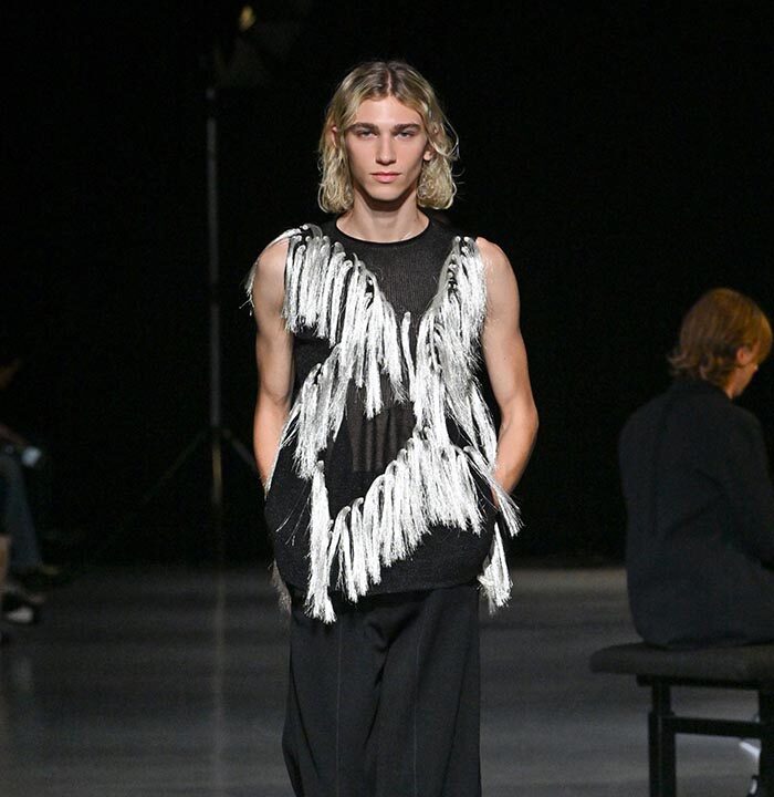 The design process began with a knitted toile dress punctuated with small holes, through which tassels were intuitively threaded, much like sculpting with clay. Each tassel, individually knitted, is passed through pre-programmed openings to form motifs. Through multiple fittings, the balance was refined, with unused holes closed in the final data, completing the dress. Both tassels and base use yarns wrapped in metallic film, creating shimmer and movement. (LOOK 37, 38, 39, 40, 41)