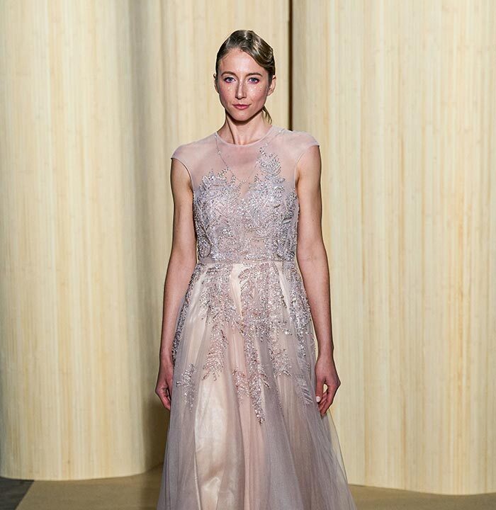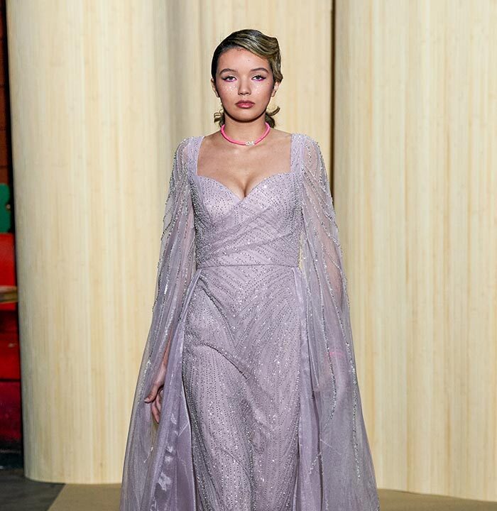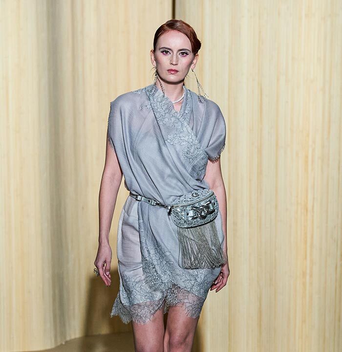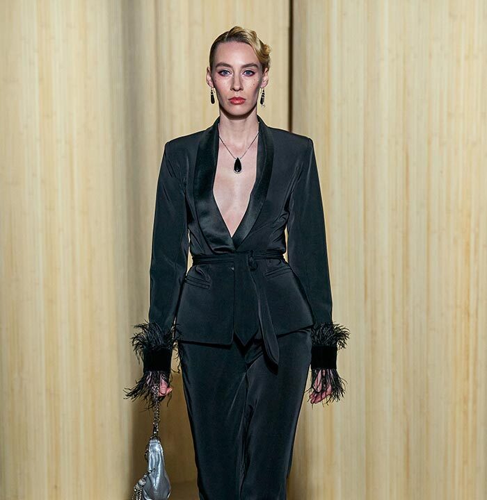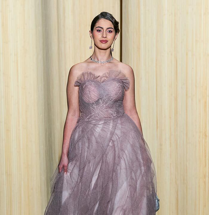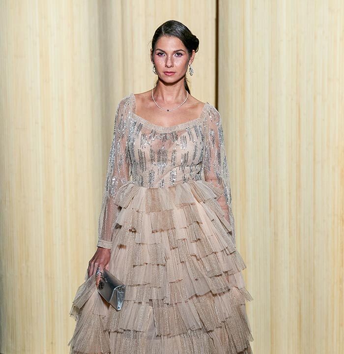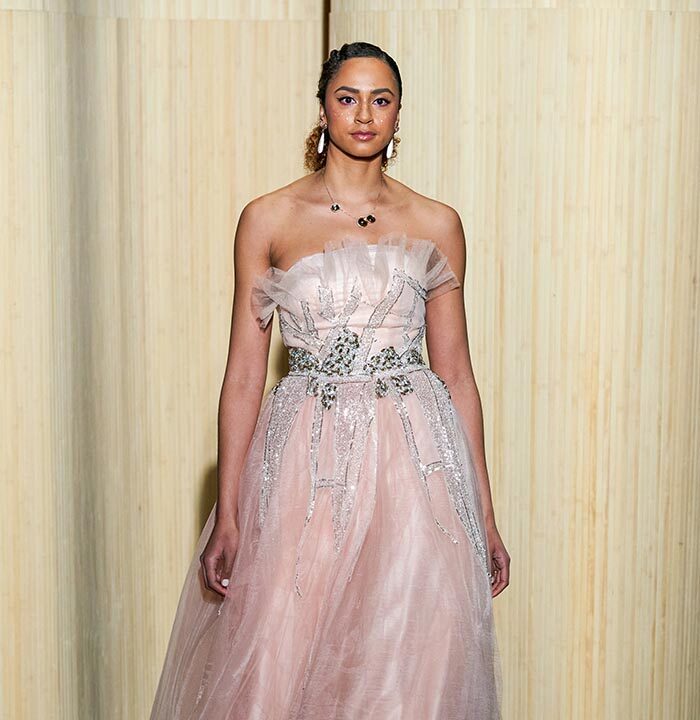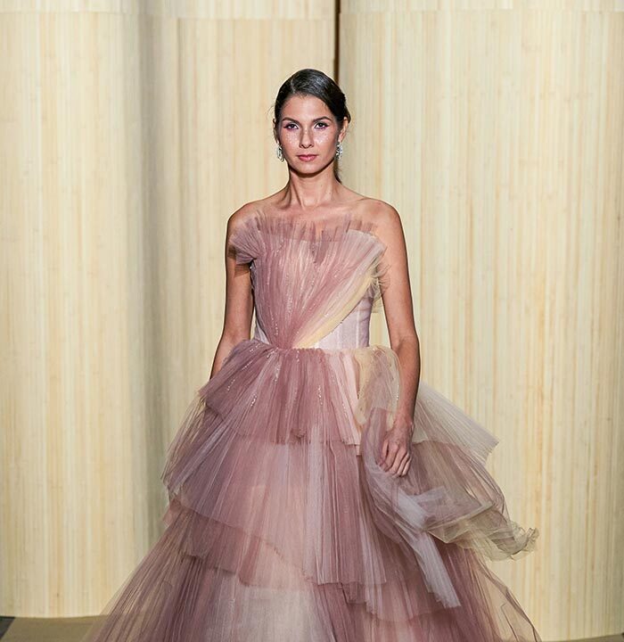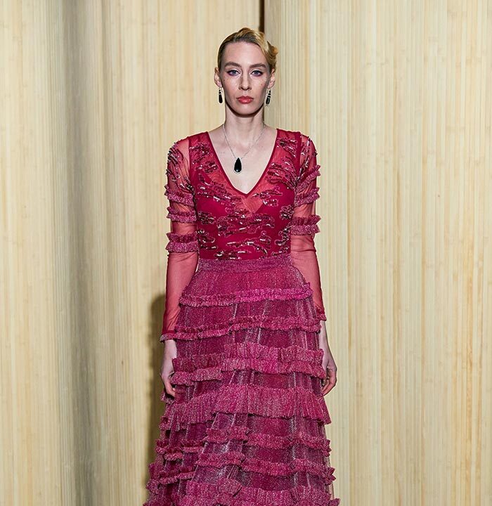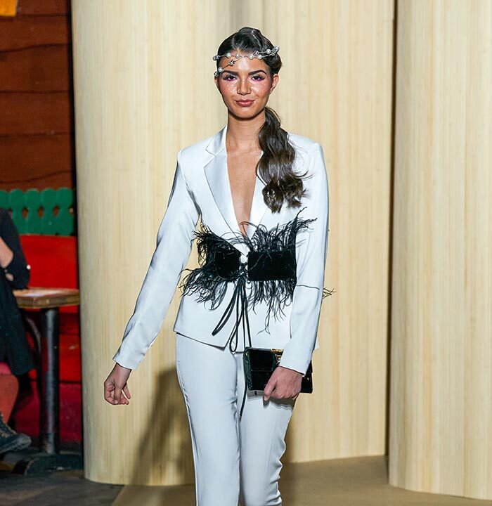 Dolce Vita is radicalized with tuxedos enhanced with feathers. Transparencies of soft pink tulle sprinkled with crystals and extravagant embroidery complete this dreamlike and burlesque vision.