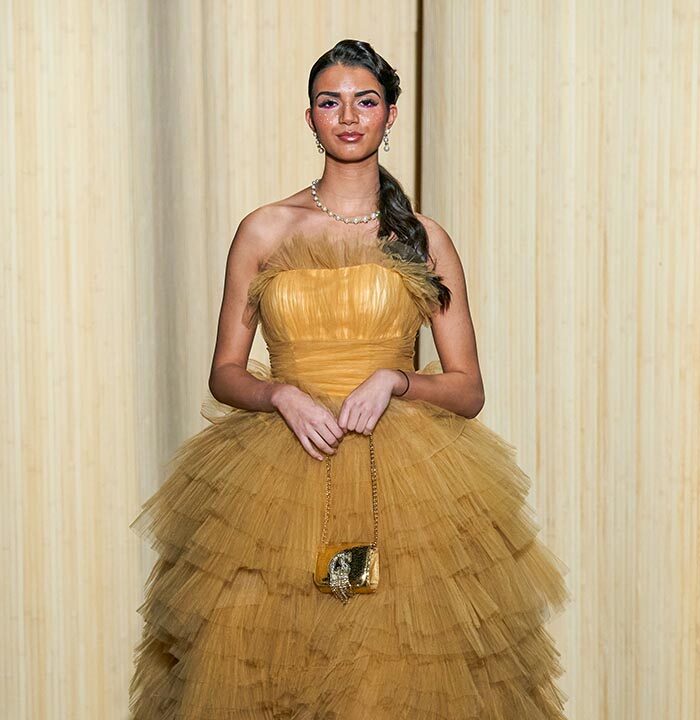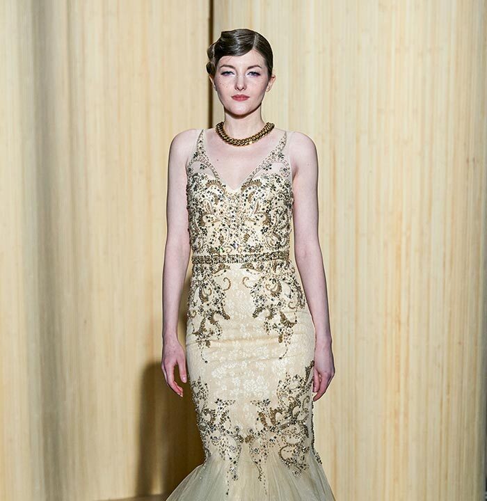 golden sequins emphasizing neckline claim the music hall spirit.