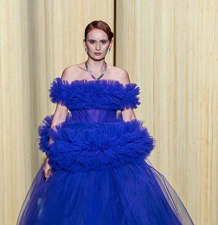 A voluptuous icon of surrealism thanks to Dali, the famous Lips sofa is reinterpreted draped in burgundy taffeta. Mermaid gown in beige tulle embroidered with cabochons or fringes of
