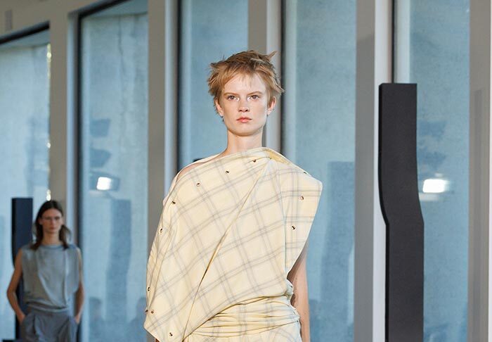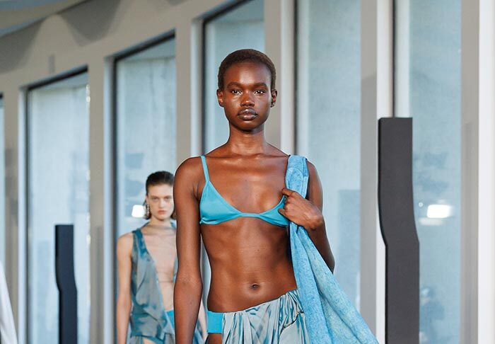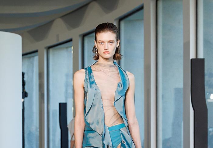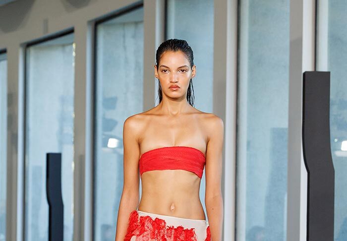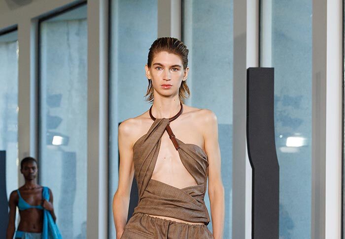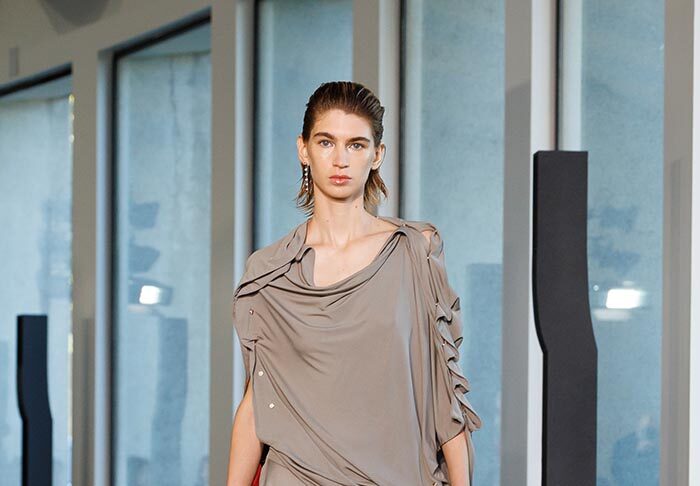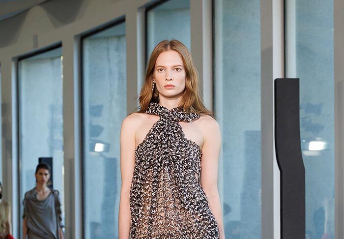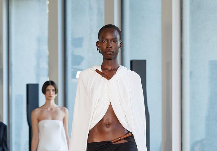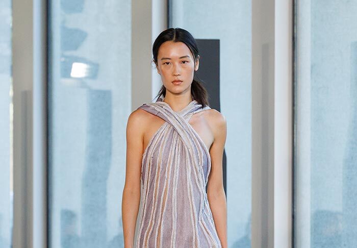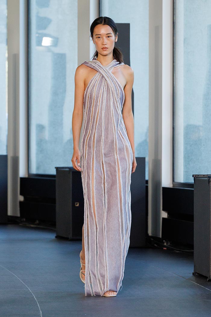 Drawing on gestures of beachwear, she adapts, reshaping garments in response to the elements; a tee Tucked into a bikini, a towel folded into a brief, garments interact with the body in spontaneous, Instinctive ways. Moments of casual construction translate into a refined study of drapery and Structure. Wind chimes appear as sonic embellishments, interwoven through drapes and hems to catch The air.