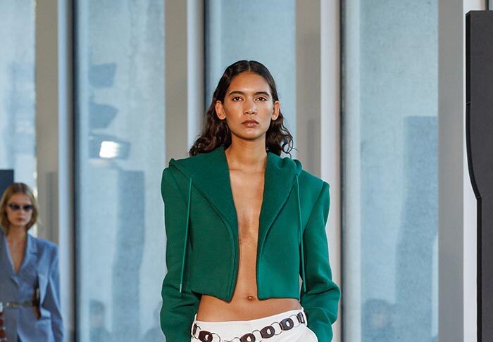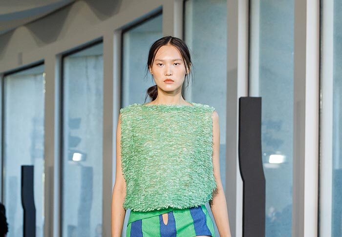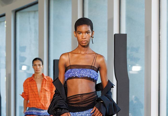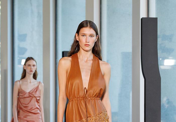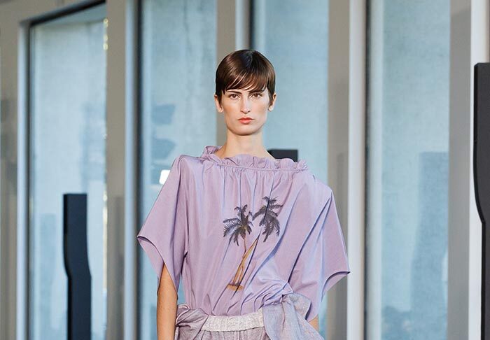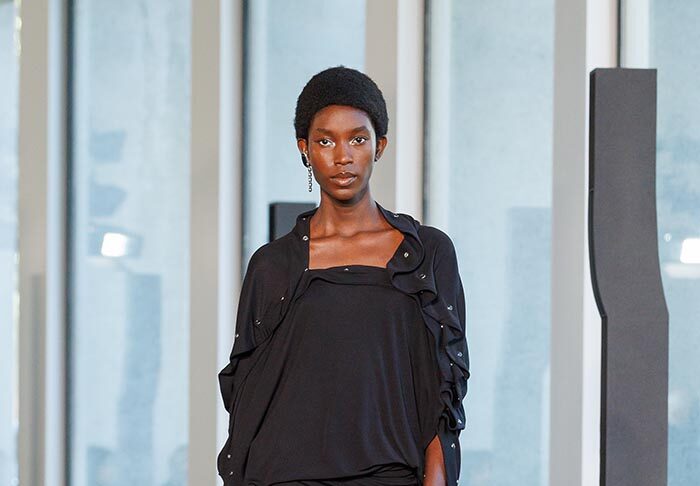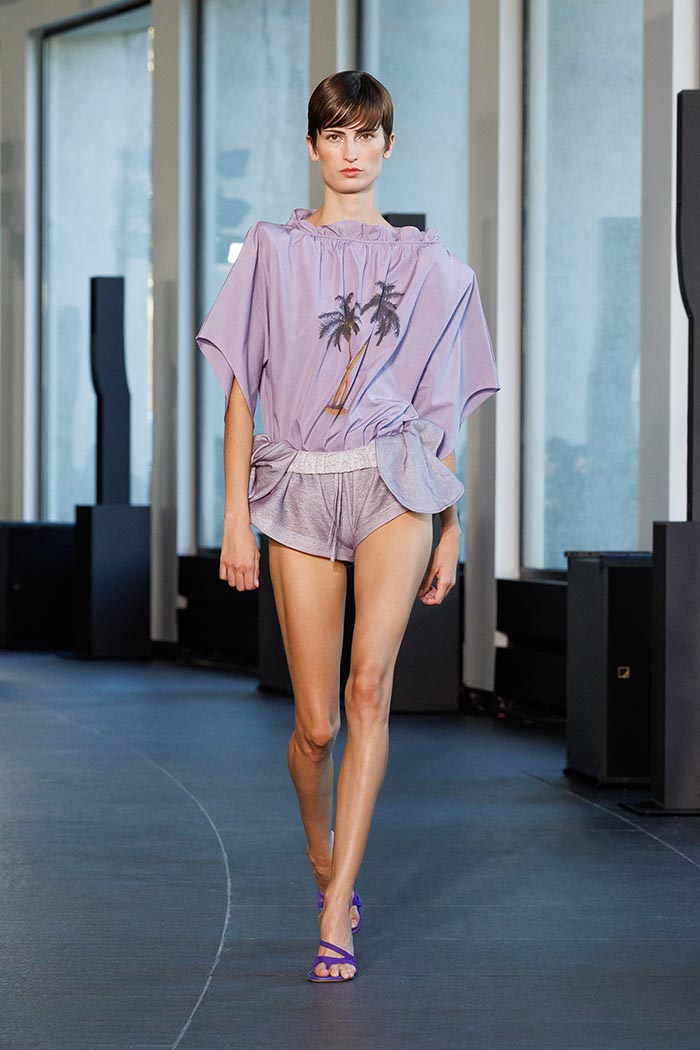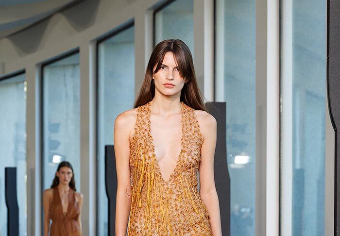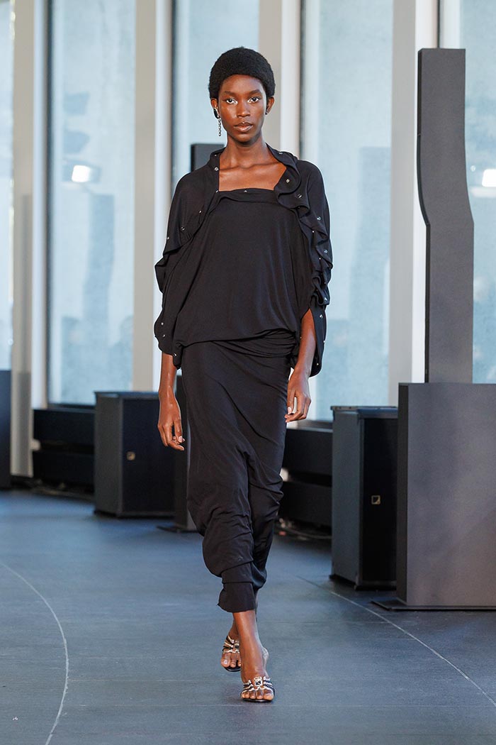 Drawing on gestures of beachwear, she adapts, reshaping garments in response to the elements; a tee Tucked into a bikini, a towel folded into a brief, garments interact with the body in spontaneous, Instinctive ways. Moments of casual construction translate into a refined study of drapery and Structure. Wind chimes appear as sonic embellishments, interwoven through drapes and hems to catch The air.