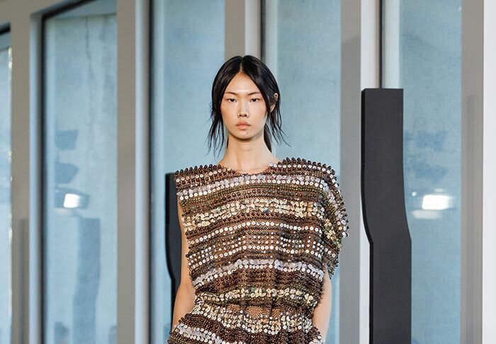 Natural materials of quartz, stone and shell transform into intricate beading while classic tailoring is Dismantled, revealing what is usually hidden away. Canvas, lining and internal structures emerging as Visible elements, reframing conventional ideas of refinement.