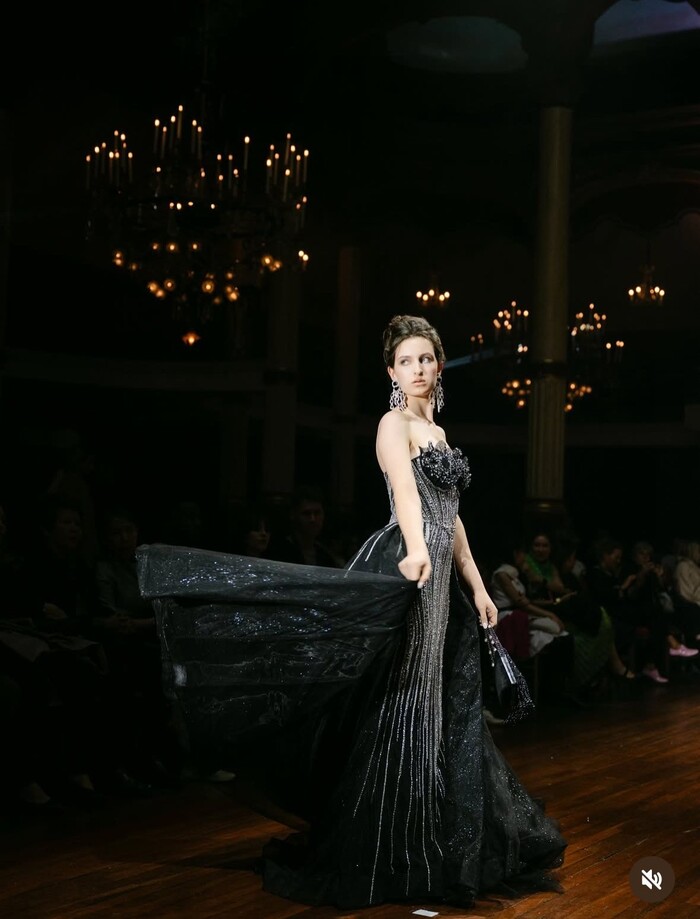 The Finale Masterpiece was a sculptural black gown with a dramatic train, glistening under chandeliers — epitomizing the brand’s muse.