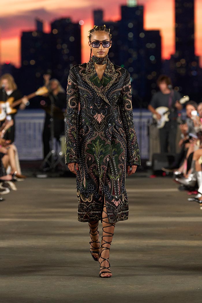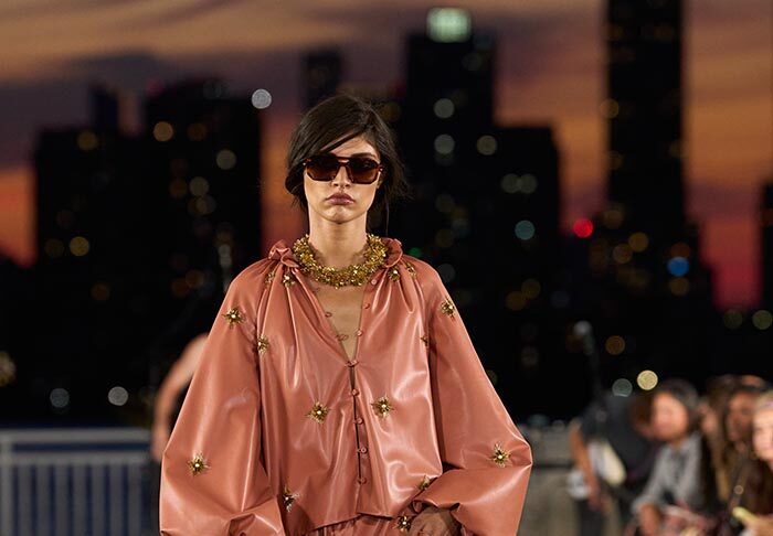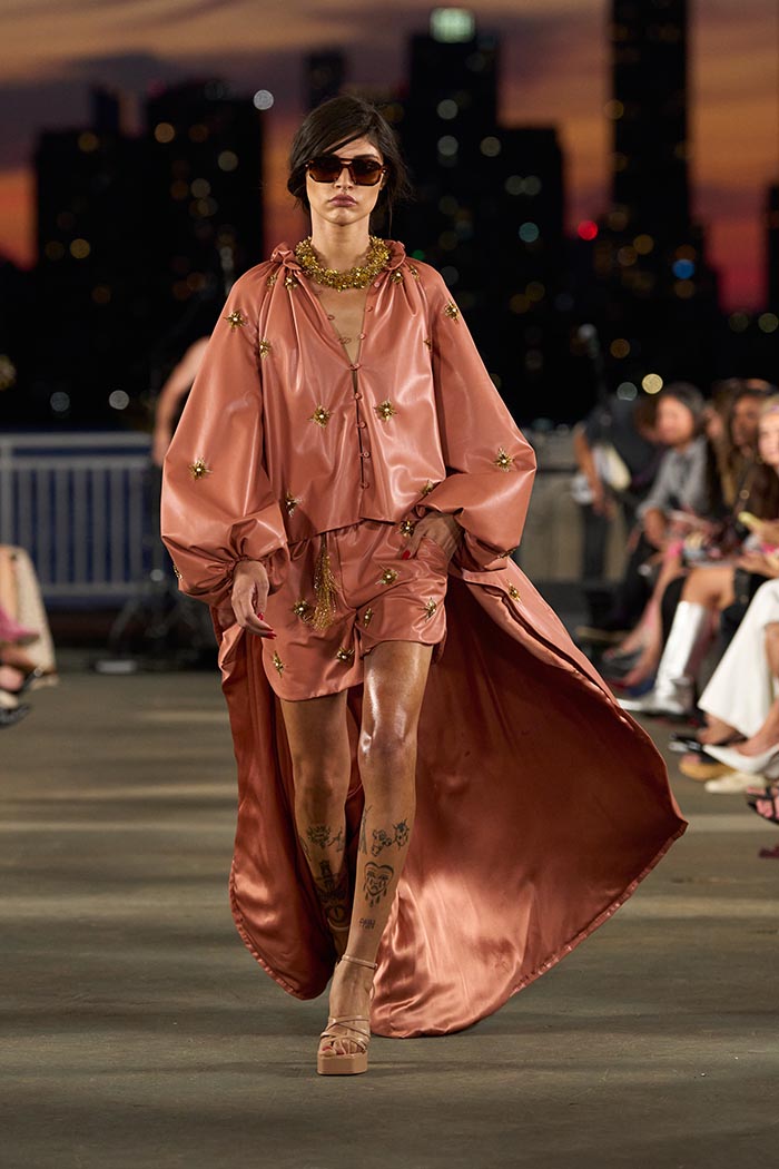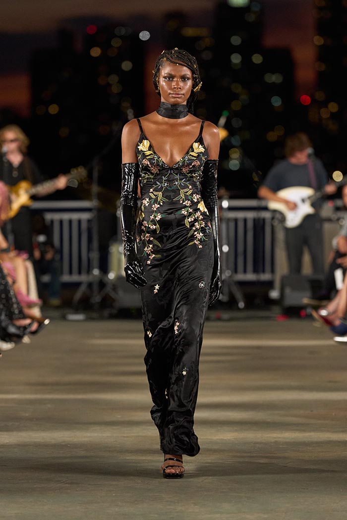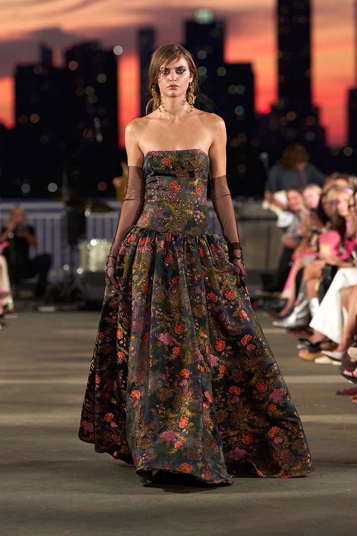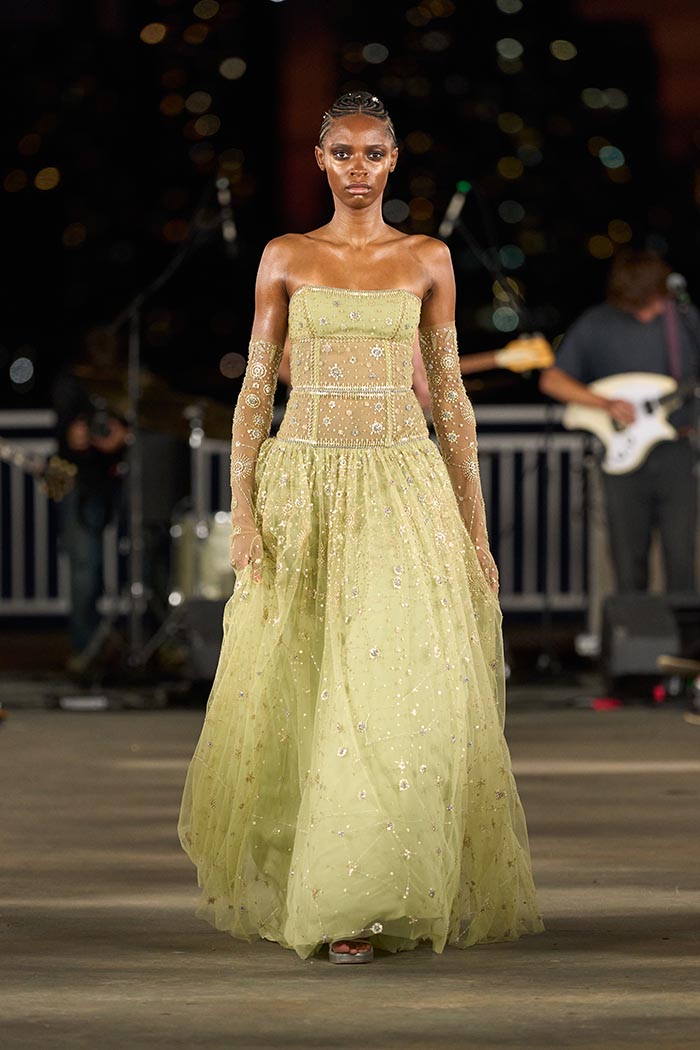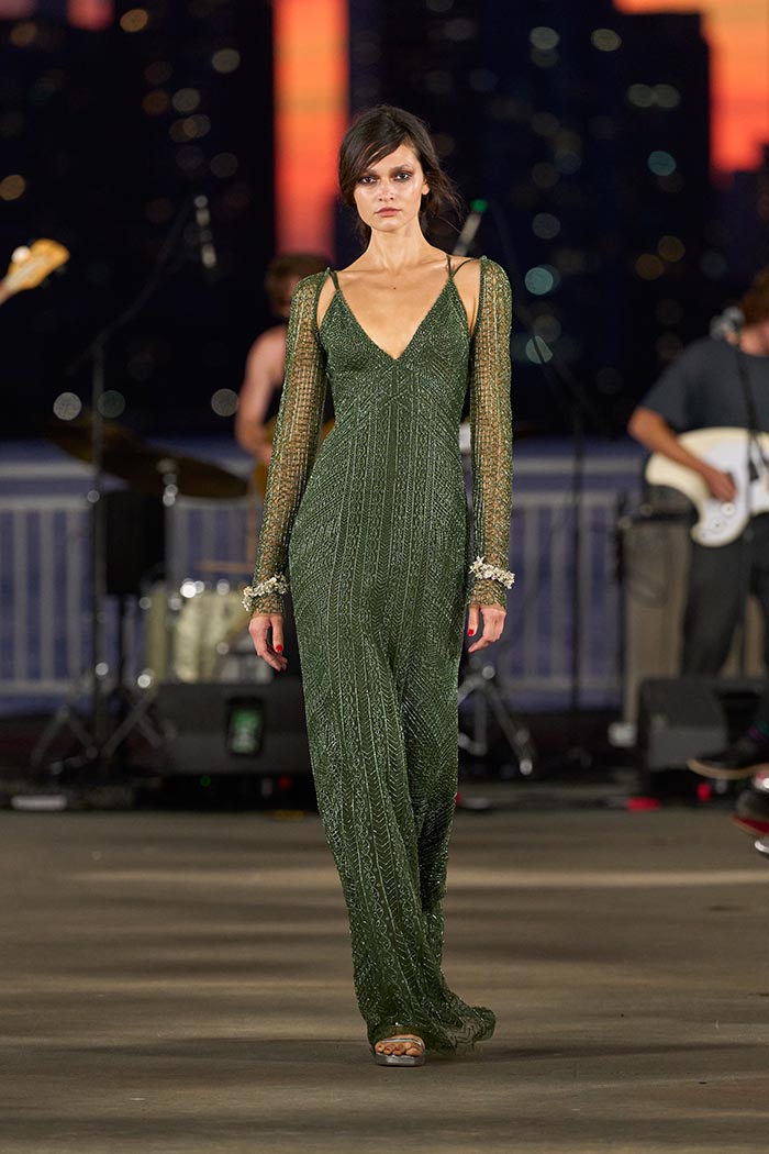 As the sun set over the Hudson at the Picnic House on Pier 40, the show unfolded with live music by New York based band, The Thing. Drawing from allegories and cultural touchpoints –Over the Hills and Far Away, Time and Fame by Veronese, Kashmir (1975), the portrait of Lady Meux, and Fools in the Rain –the collection explores themes of romance, longing, and an unrelenting pursuit of beauty, carrying forward Cucculelli Shaheen’s singular aesthetic.