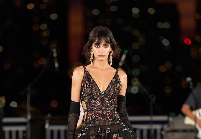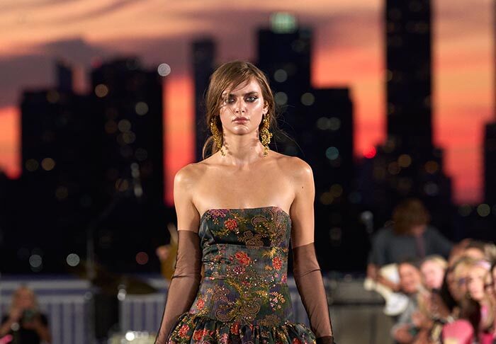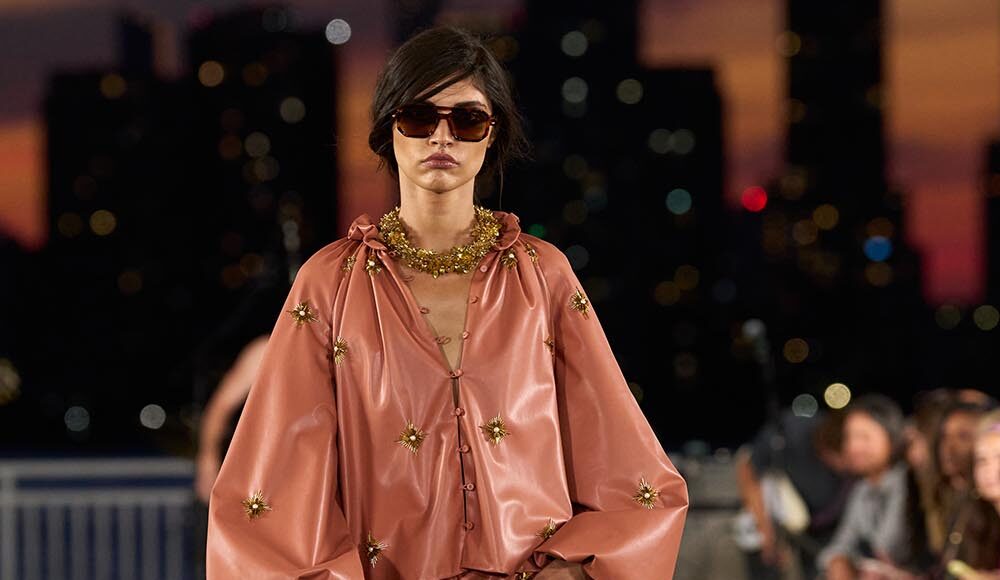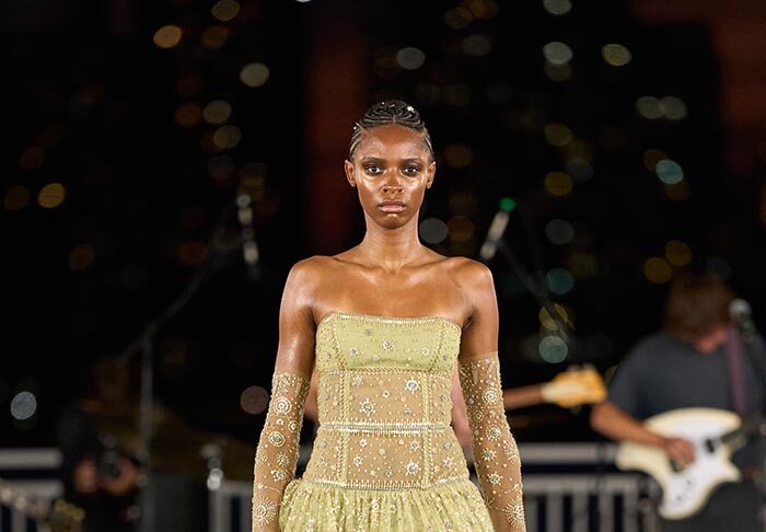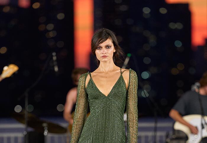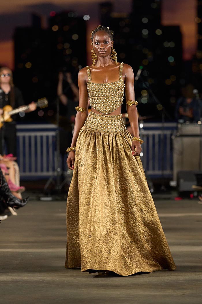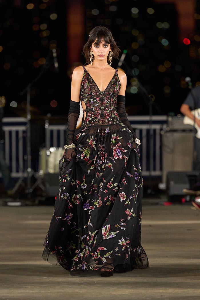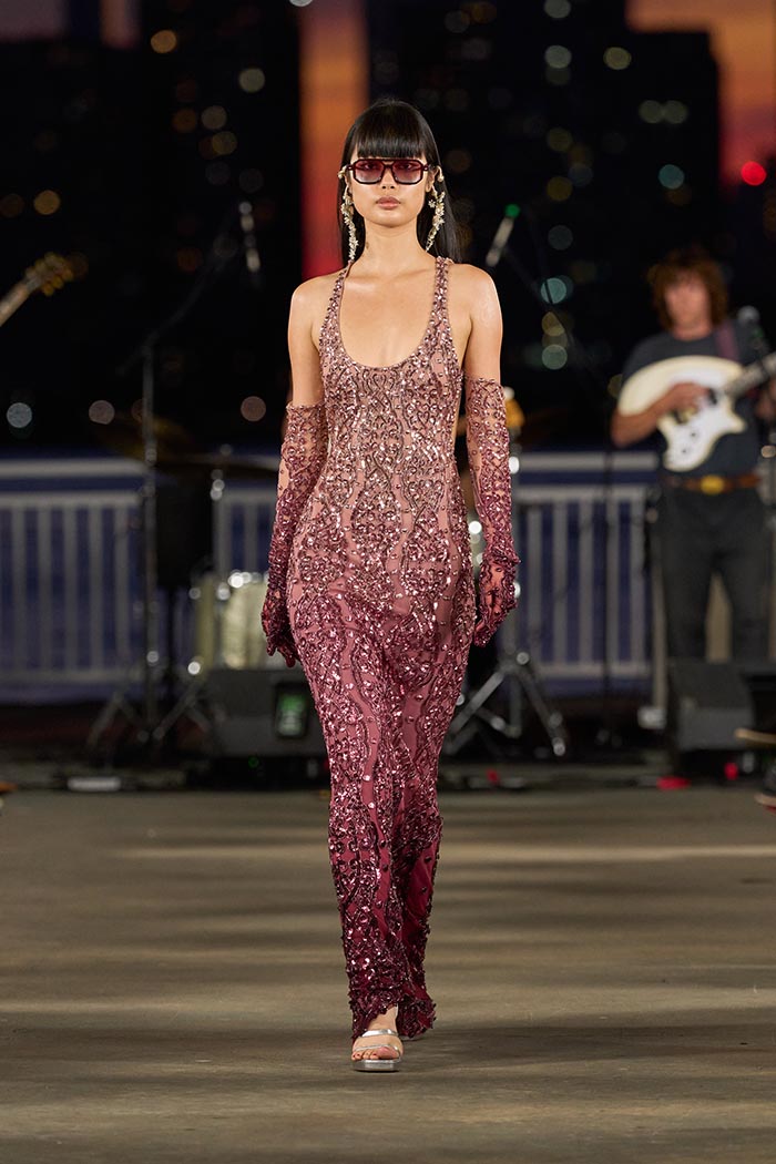 As the sun set over the Hudson at the Picnic House on Pier 40, the show unfolded with live music by New York based band, The Thing. Drawing from allegories and cultural touchpoints –Over the Hills and Far Away, Time and Fame by Veronese, Kashmir (1975), the portrait of Lady Meux, and Fools in the Rain –the collection explores themes of romance, longing, and an unrelenting pursuit of beauty, carrying forward Cucculelli Shaheen’s singular aesthetic.